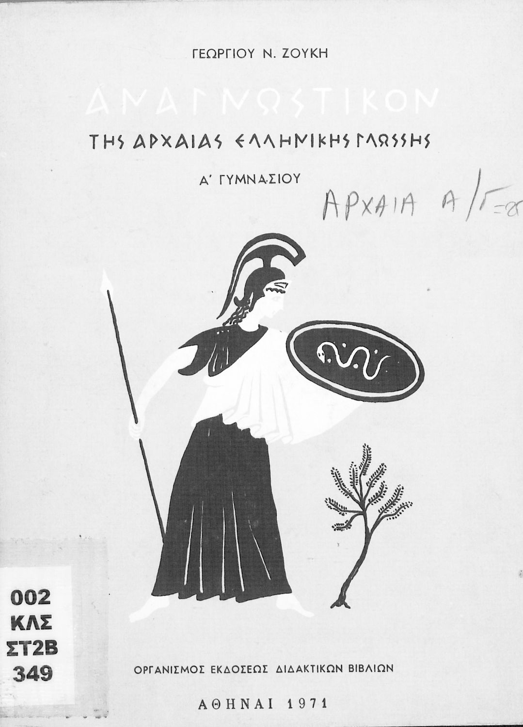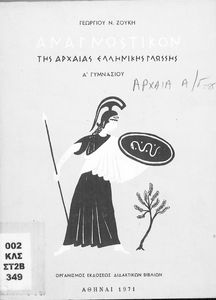 Σχολικό Εγχειρίδιο Αρχαίων Ελληνικών Α' Γυμνασίου που περιλαμβάνει κείμενα προσαρμοσμένα στη διδασκαλία των γραμματικών και συντακτικών φαινομένων, και ερμηνευτικές και λεξιλογικές σημειώσεις. Φέρει το σύμβολο