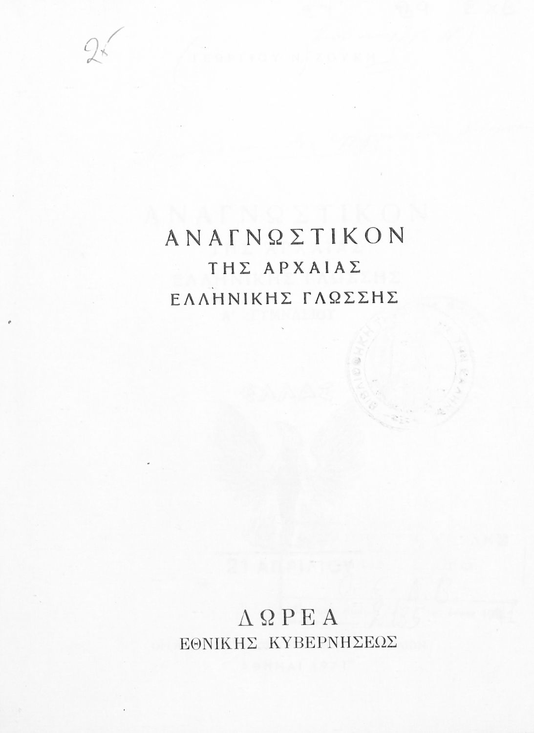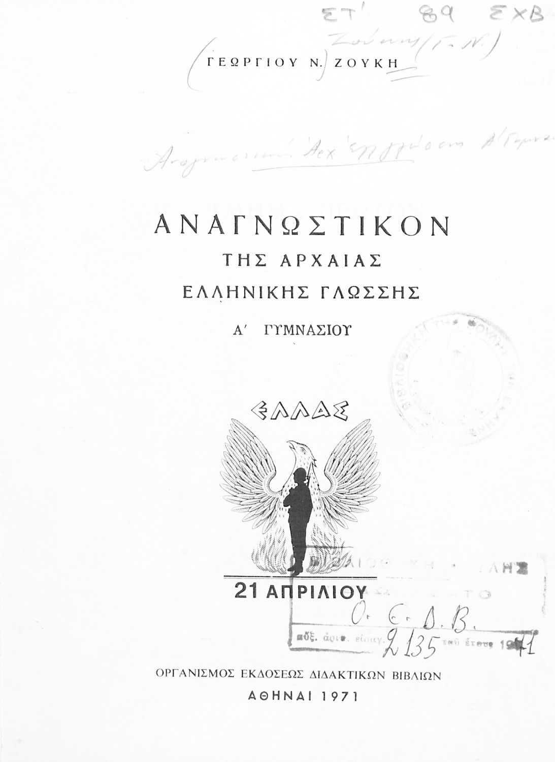 Σχολικό Εγχειρίδιο Αρχαίων Ελληνικών Α' Γυμνασίου που περιλαμβάνει κείμενα προσαρμοσμένα στη διδασκαλία των γραμματικών και συντακτικών φαινομένων, και ερμηνευτικές και λεξιλογικές σημειώσεις. Φέρει το σύμβολο της δικτατορίας.