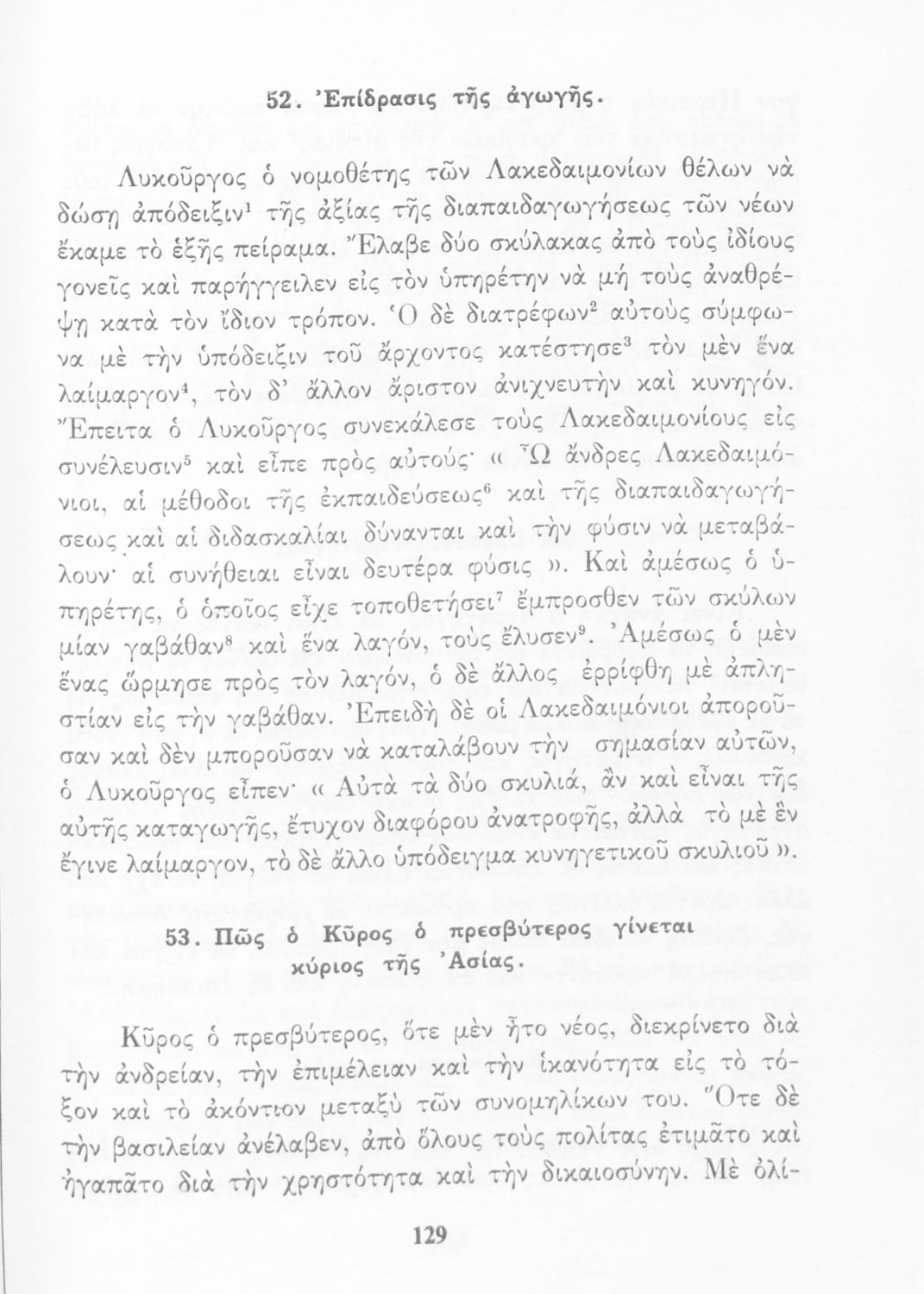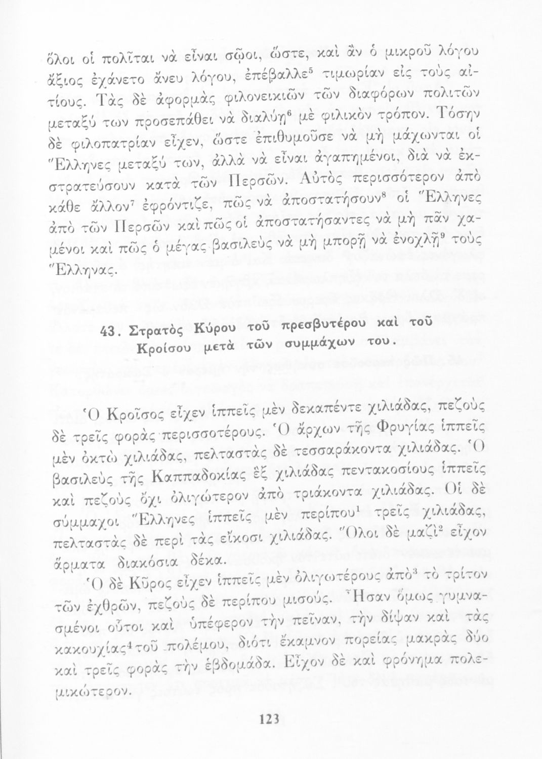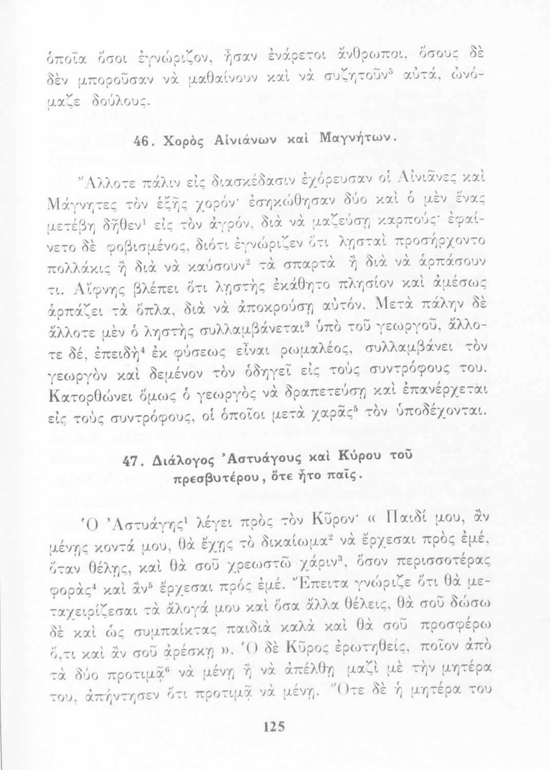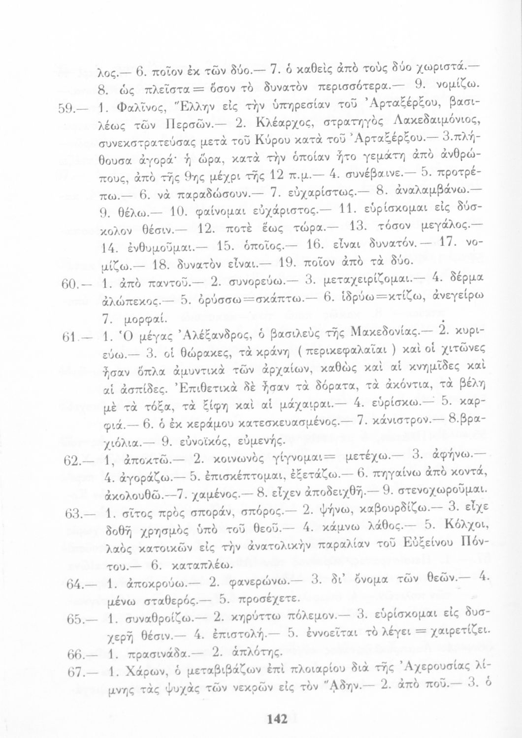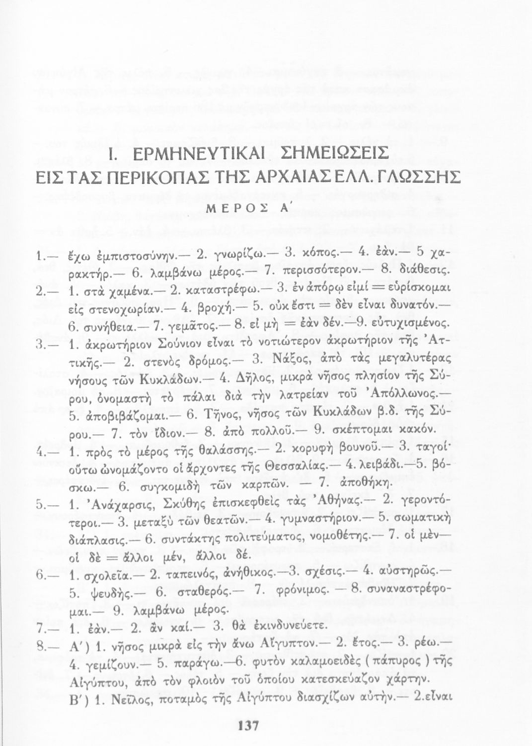 Σχολικό Εγχειρίδιο Αρχαίων Ελληνικών Α' και Β΄ Γυμνασίου που περιλαμβάνει κείμενα προσαρμοσμένα στη διδασκαλία των γραμματικών και συντακτικών φαινομένων, και ερμηνευτικές και λεξιλογικές σημειώσεις. Φέρει το σύμβολο της δικτατορίας.