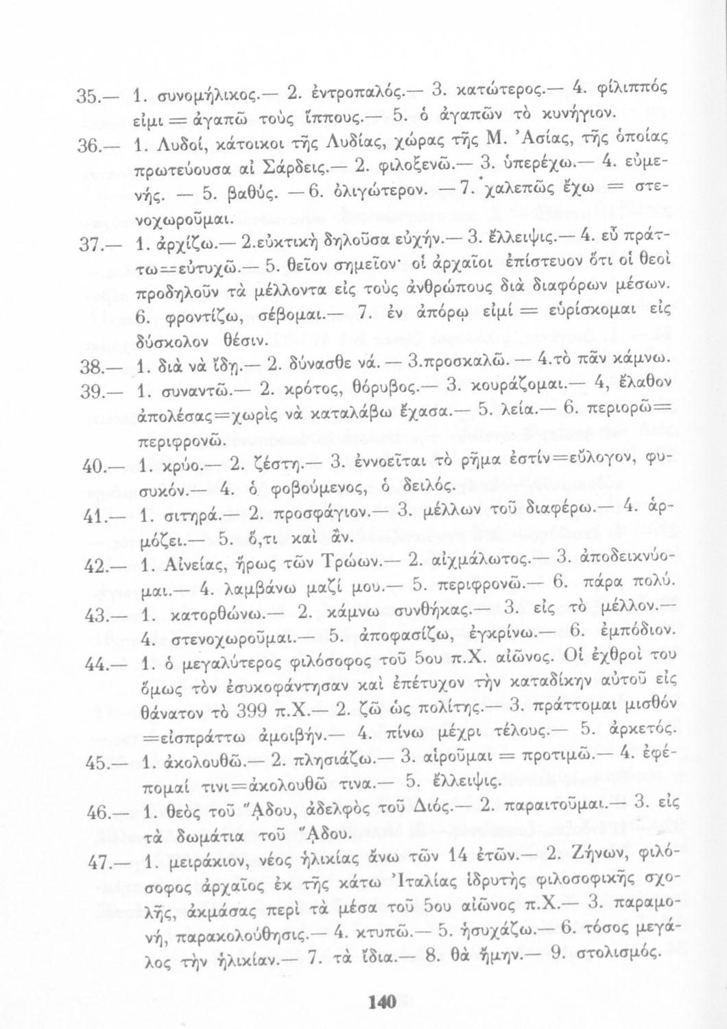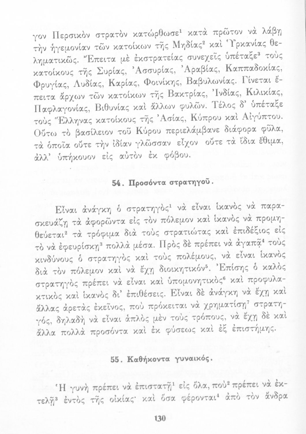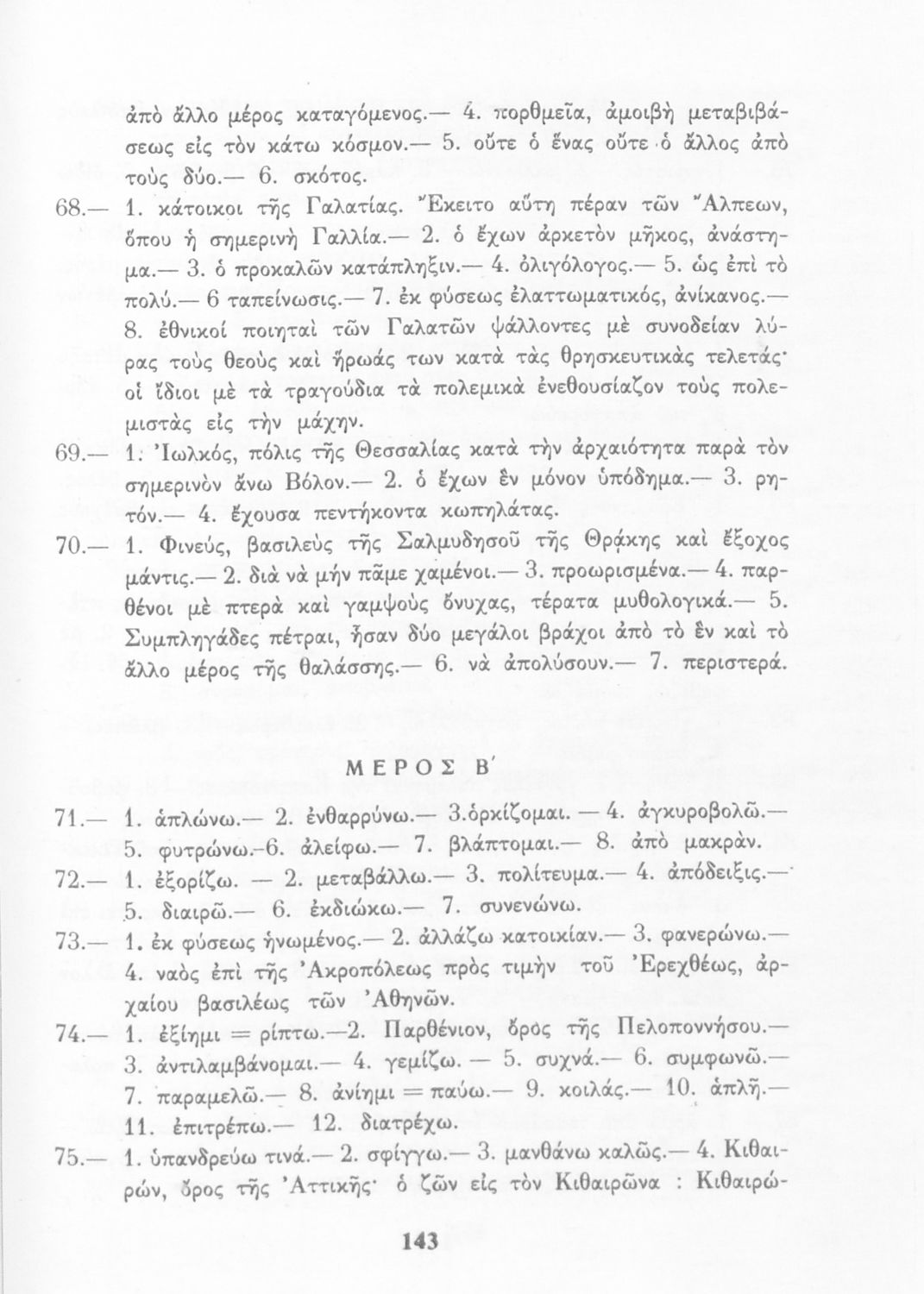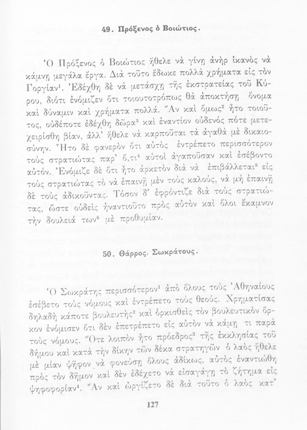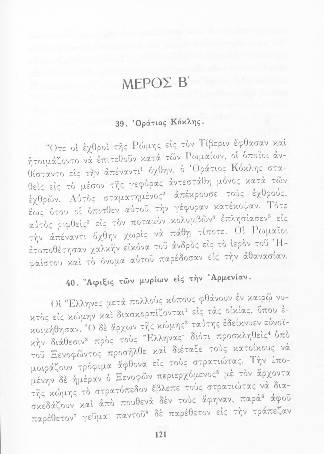 Σχολικό Εγχειρίδιο Αρχαίων Ελληνικών Α' και Β΄ Γυμνασίου που περιλαμβάνει κείμενα προσαρμοσμένα στη διδασκαλία των γραμματικών και συντακτικών φαινομένων, και ερμηνευτικές και λεξιλογικές σημειώσεις. Φέρει το σύμβολο της δικτατορίας.