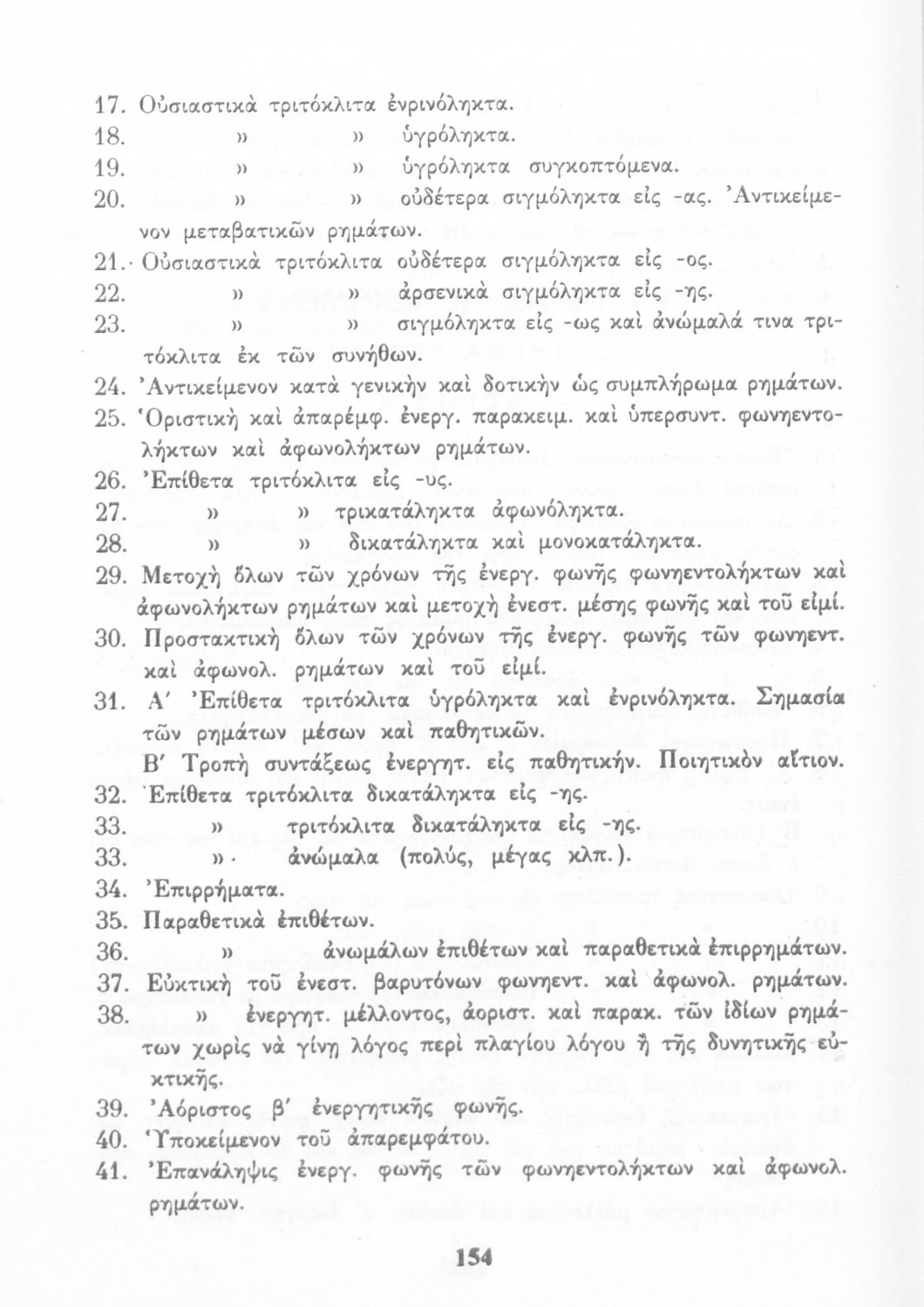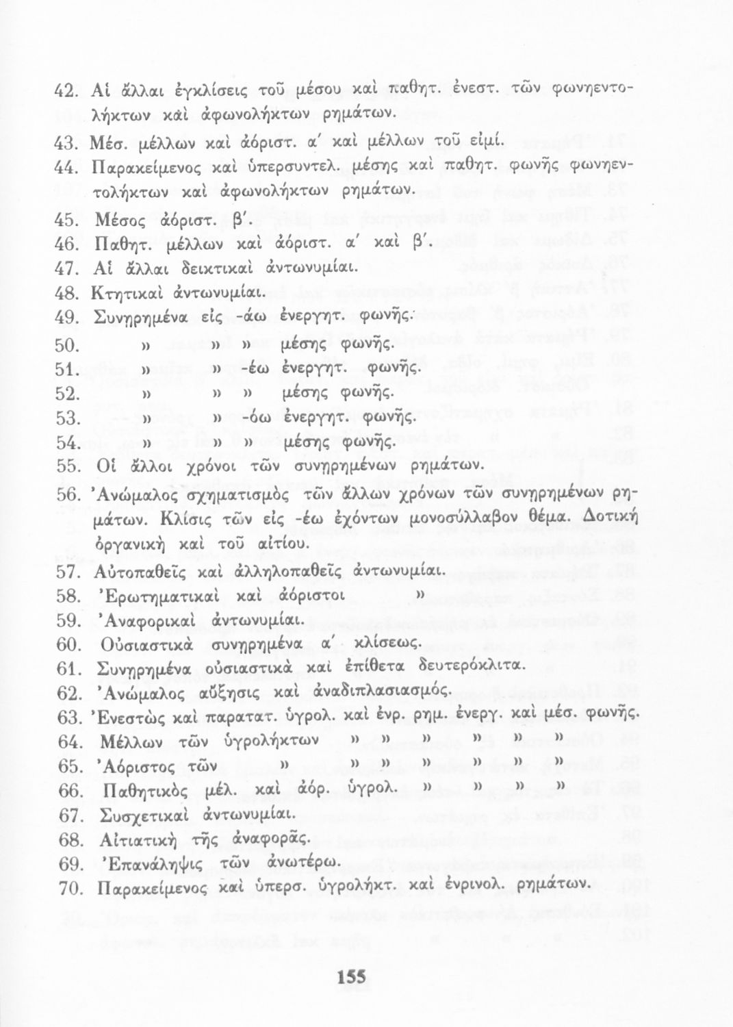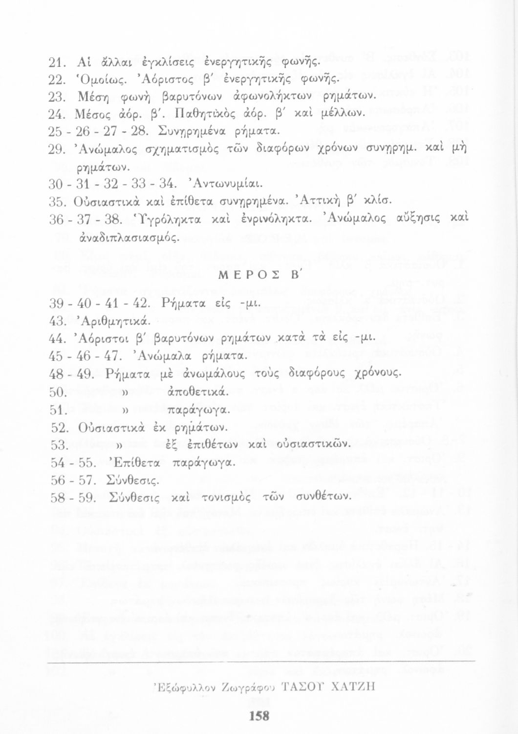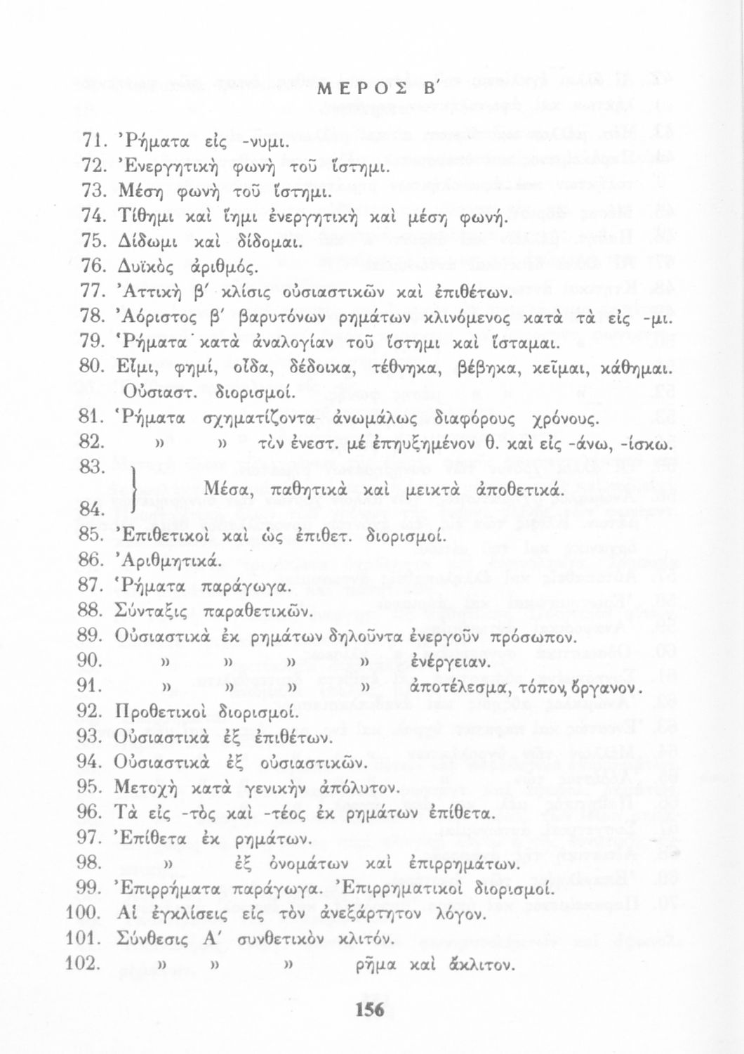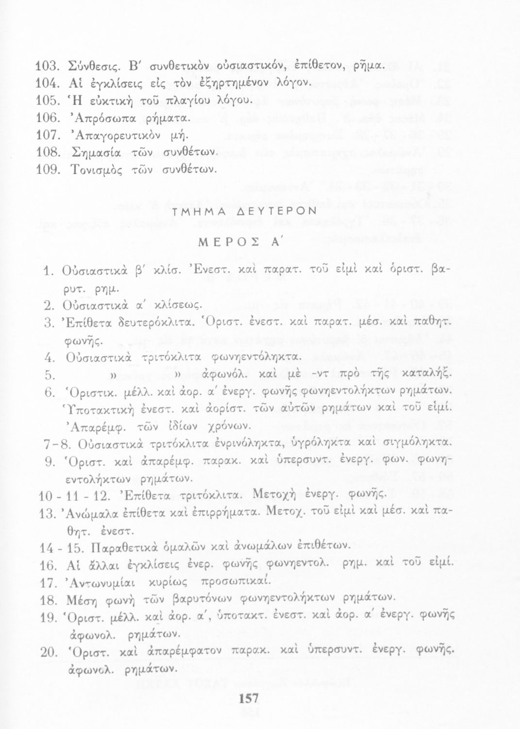 Γραμματική Αρχαίων Ελληνικών της Α΄, Β΄, Γ΄ και Δ΄ Γυμνασίου το οποίο εστιάζει στα μέρη του λόγου και στην σύνταξή τους και είναι χωρισμένο σε φθογγολογικό και τυπολογικό μέρος.
