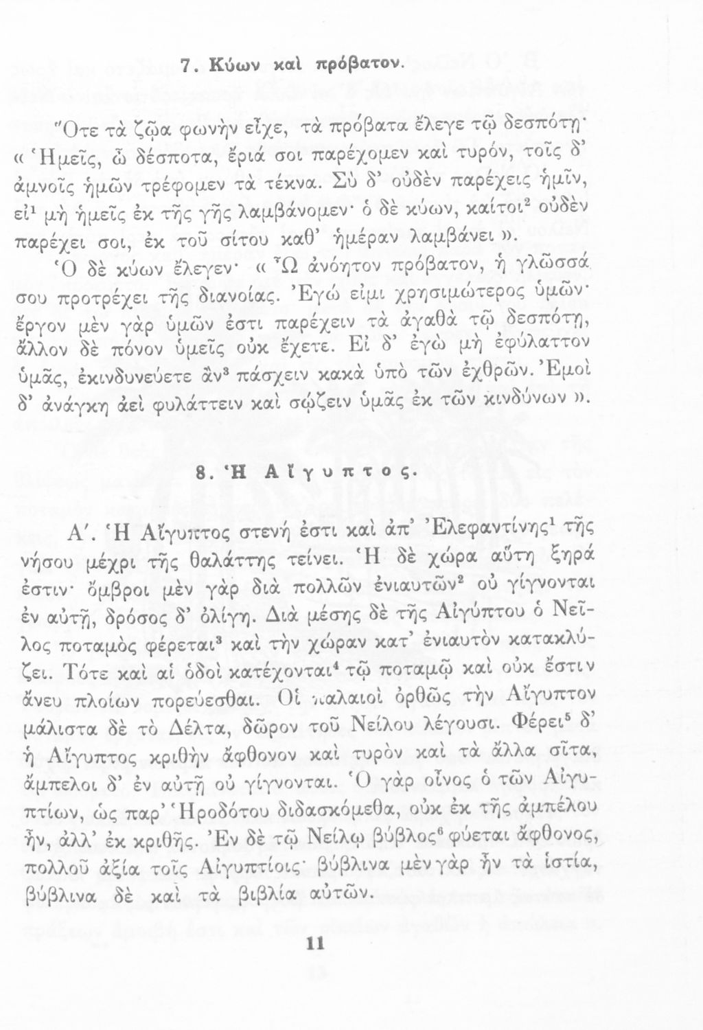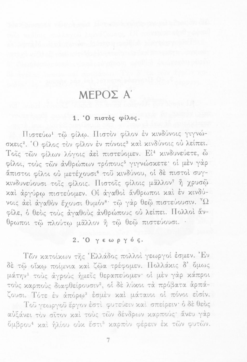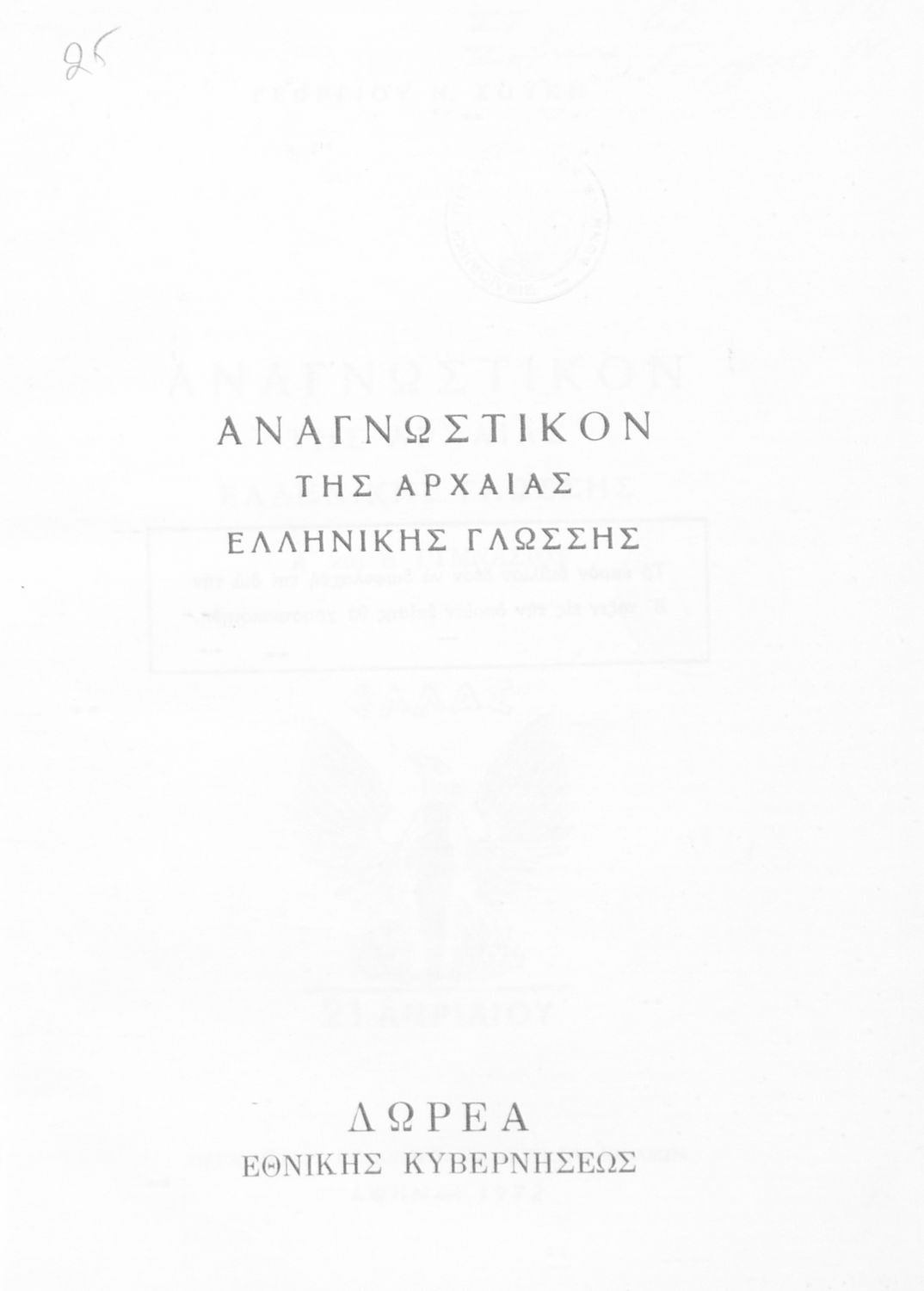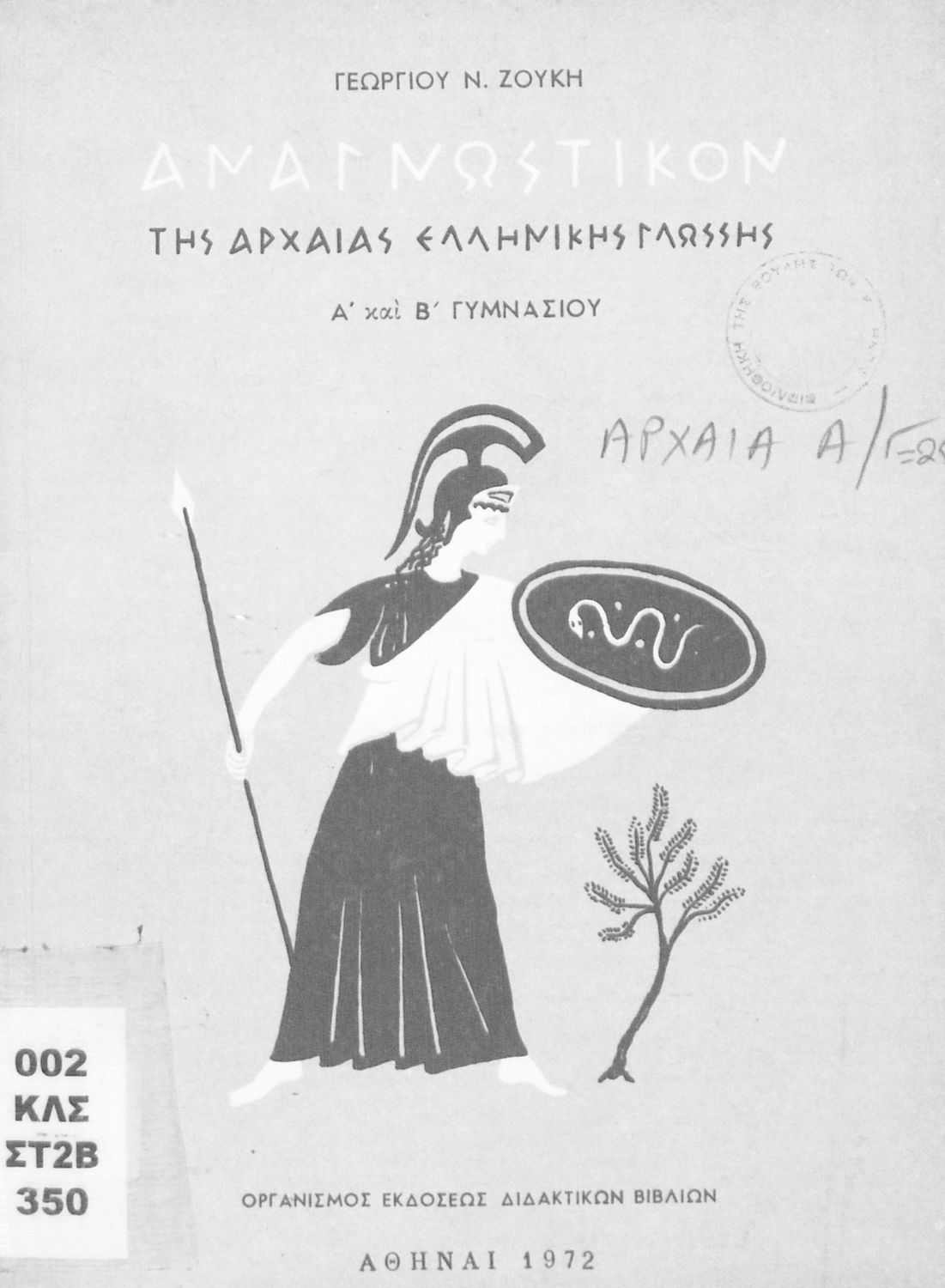 Σχολικό Εγχειρίδιο Αρχαίων Ελληνικών Α' και Β΄ Γυμνασίου που περιλαμβάνει κείμενα προσαρμοσμένα στη διδασκαλία των γραμματικών και συντακτικών φαινομένων, και ερμηνευτικές και λεξιλογικές σημειώσεις. Φέρει το σύμβολο της δικτατορίας.