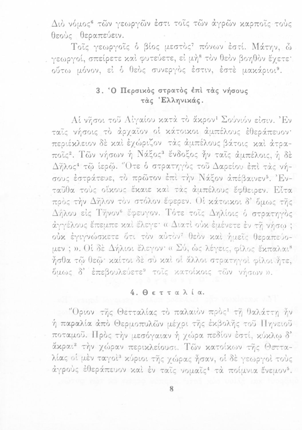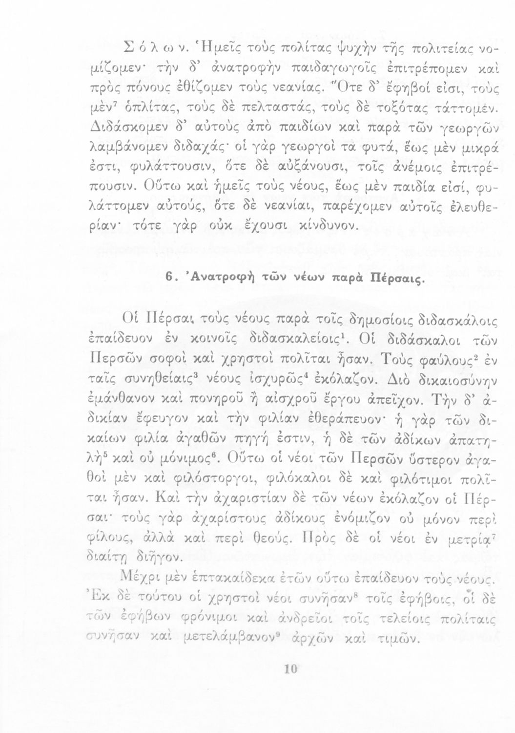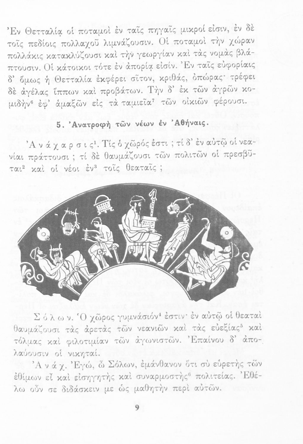Σχολικό Εγχειρίδιο Αρχαίων Ελληνικών Α' και Β΄ Γυμνασίου που περιλαμβάνει κείμενα προσαρμοσμένα στη διδασκαλία των γραμματικών και συντακτικών φαινομένων, και ερμηνευτικές και λεξιλογικές σημειώσεις. Φέρει το σύμβολο της δικτατορίας.