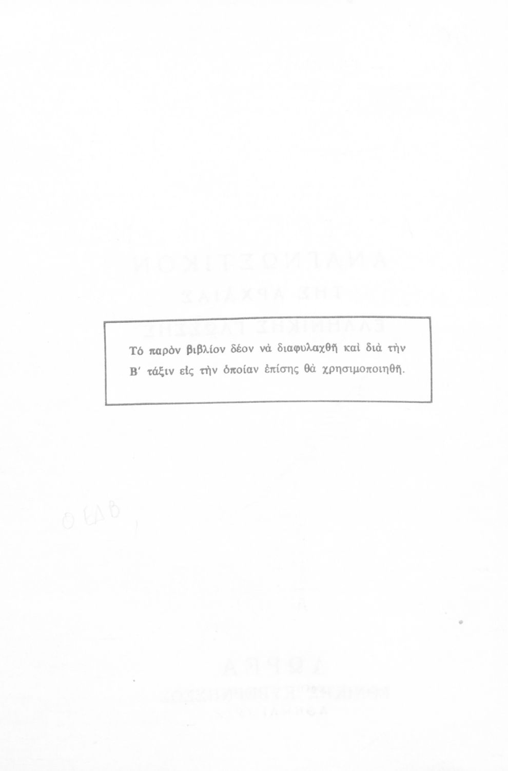 Βαθμίδα εκπαίδευσης: Δευτεροβάθμια Τάξη: Α' Γυμνασίου / Β' Γυμνασίου Μάθημα: Αρχαία Ελληνικά Γλώσσα: Καθαρεύουσα Παρουσίαση περιεχομένου: Σχολικό Εγχειρίδιο Αρχαίων Ελληνικών Α' και Β΄ Γυμνασίου που περιλαμβάνει κείμενα προσαρμοσμένα στη διδασκαλία των γραμματικών και συντακτικών φαινομένων, και ερμηνευτικές και λεξιλογικές σημειώσεις. Φέρει το σύμβολο της δικτατορίας. |