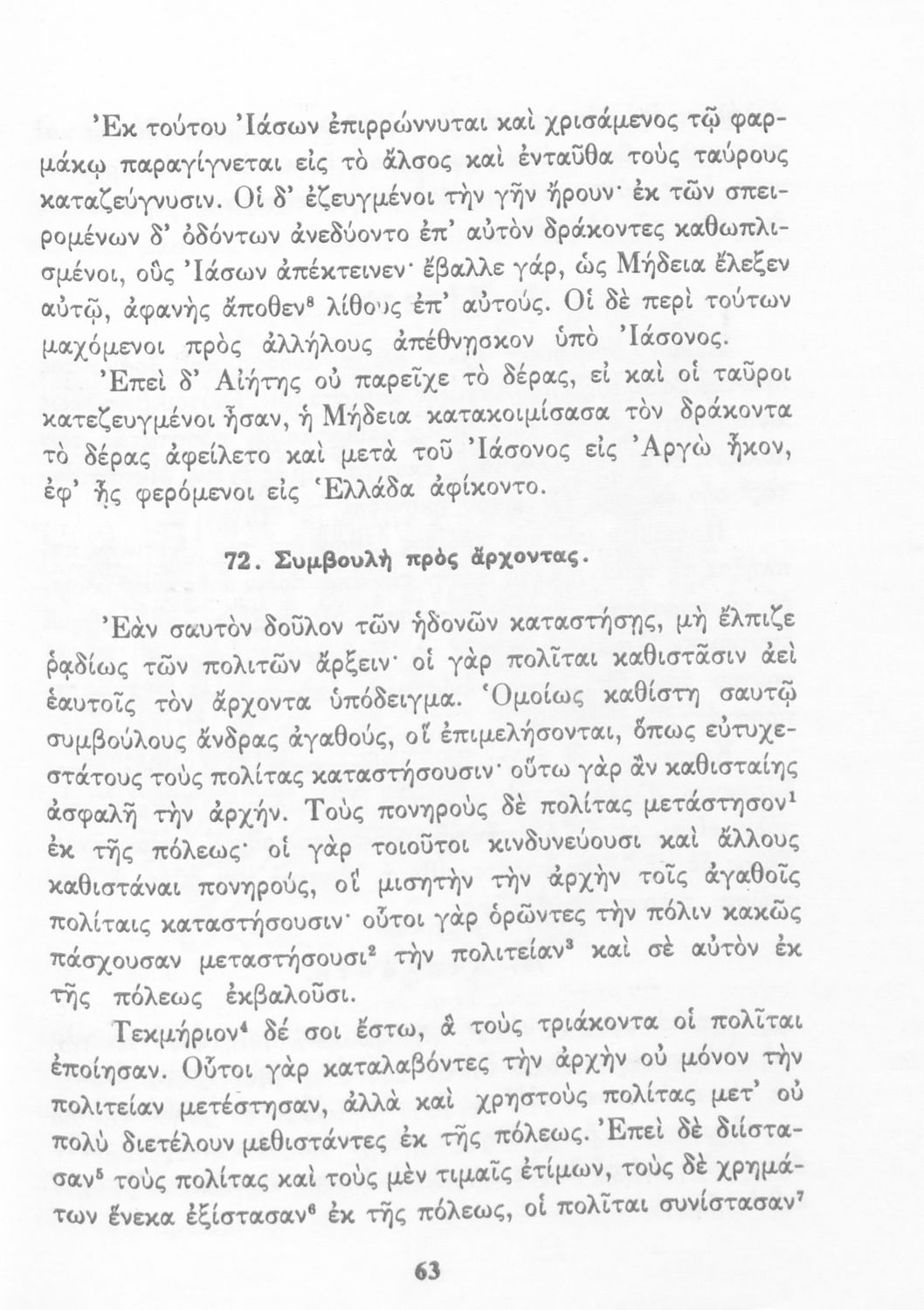 Σχολικό Εγχειρίδιο Αρχαίων Ελληνικών που περιλαμβάνει κείμενα προσαρμοσμένα στη διδασκαλία των γραμματικών και συντακτικών φαινομένων, και ερμηνευτικές και λεξιλογικές σημειώσεις. Φέρει το σύμβολο της ...
