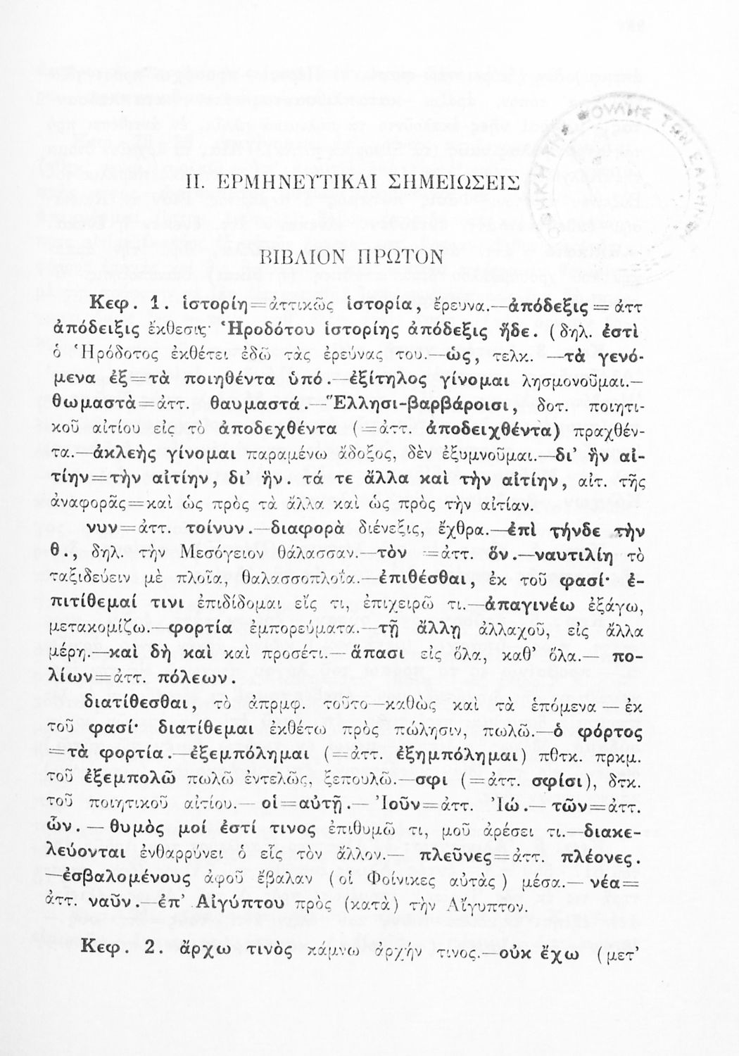 Σχολικό εγχειρίδιο Αρχαίων Ελληνικών Γ΄ Γυμνασίου που περιλαμβάνει εισαγωγή στη ζωή και το έργο του Ηρόδοτου, αποσπάσματα από την Ιστορία του, ερμηνευτικές σημειώσεις και τοπογραφικούς πίνακες με εικόνες και χάρτες. Φέρει το σύμβολο της δικτατορίας.