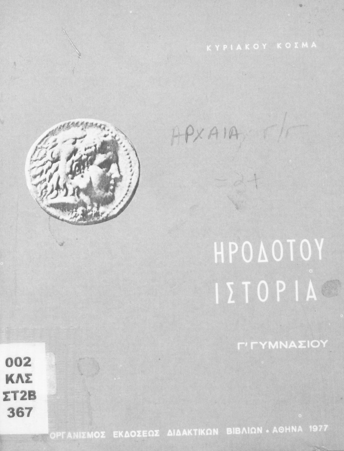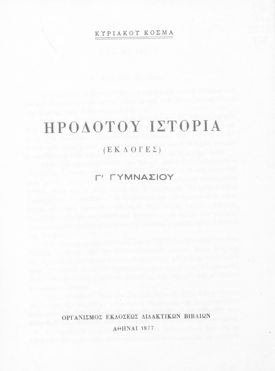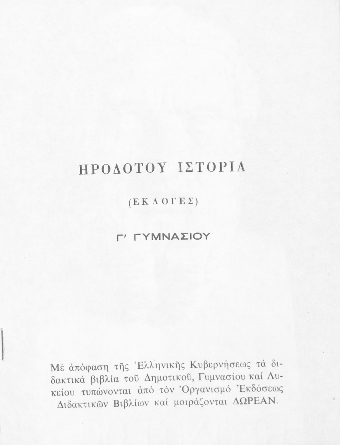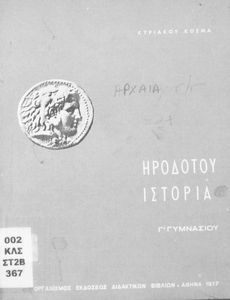 Σχολικό εγχειρίδιο Αρχαίων Ελληνικών Γ΄ Γυμνασίου που περιλαμβάνει εισαγωγή στη ζωή και το έργο του Ηρόδοτου, αποσπάσματα από την Ιστορία του, ερμηνευτικές σημειώσεις και τοπογραφικούς πίνακες με εικόνες και χάρτες.