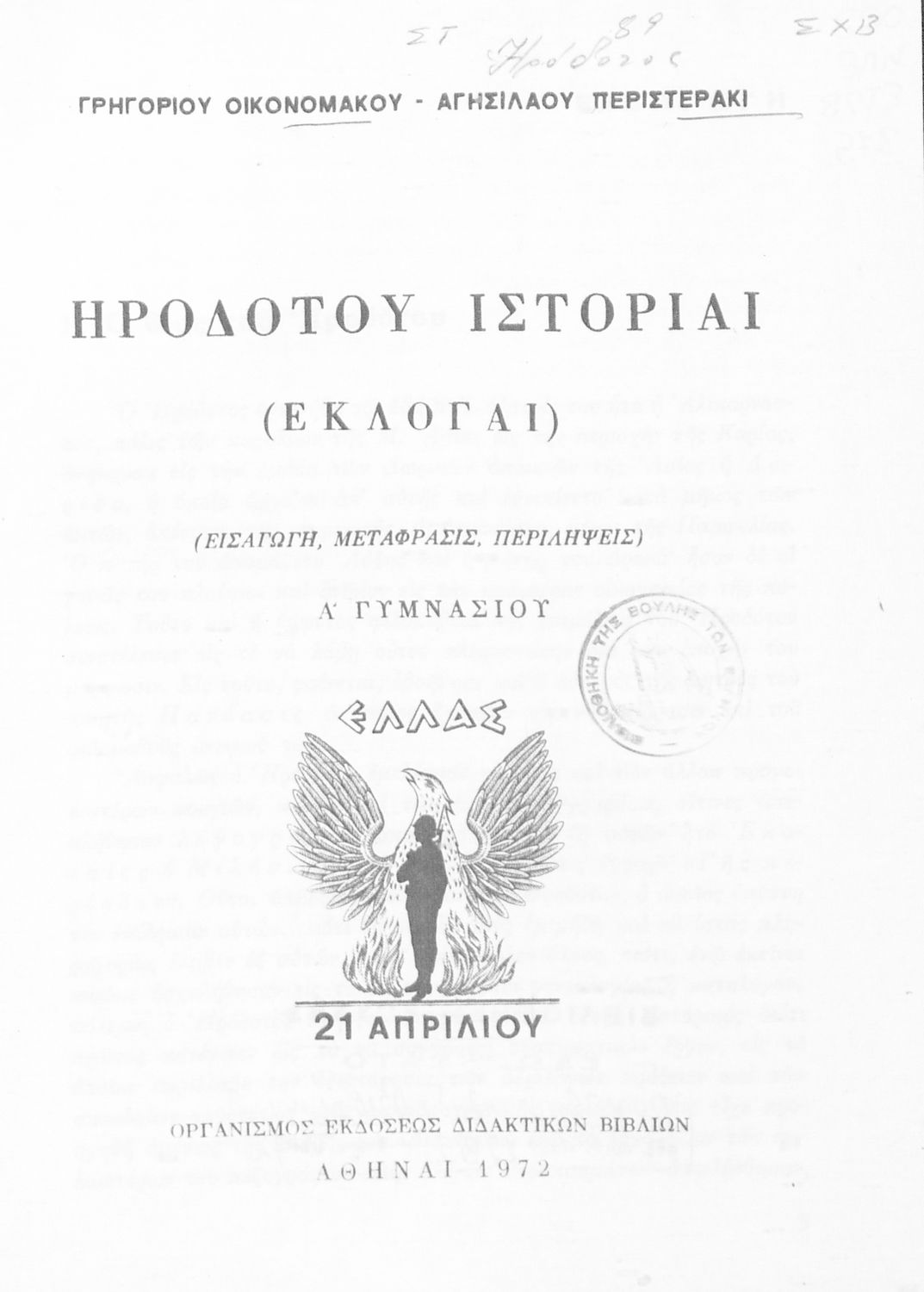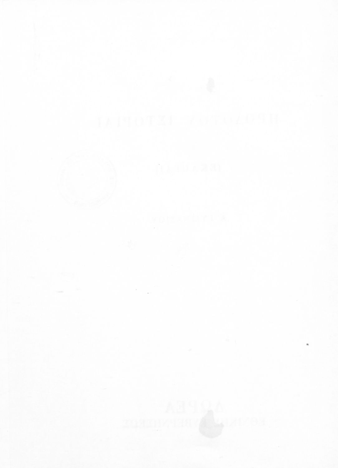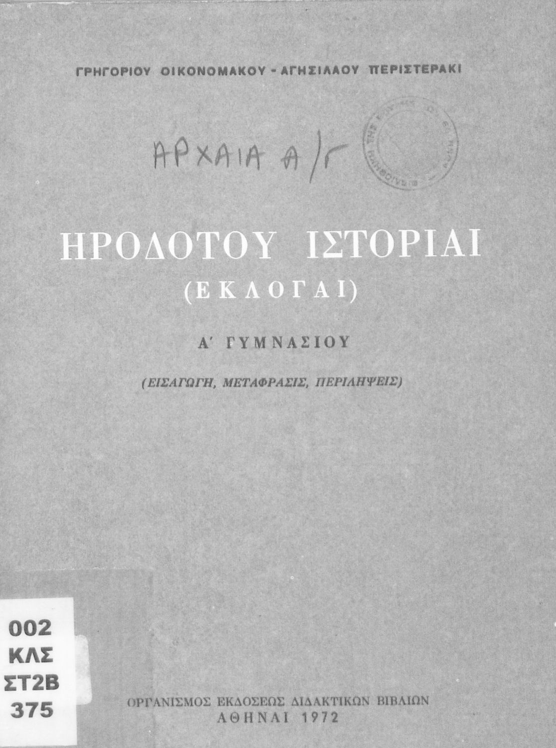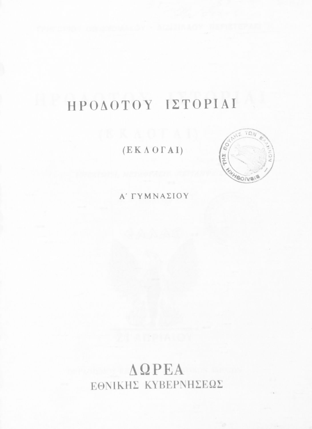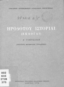Σχολικό εγχειρίδιο Αρχαίων Ελληνικών Α΄ Γυμνασίου που περιλαμβάνει εισαγωγή στη ζωή και το έργο του Ηρόδοτου, και αποσπάσματα από τα 9 βιβλία της Ιστορίας του σε μετάφραση. Φέρει το σύμβολο της δικτατορίας.