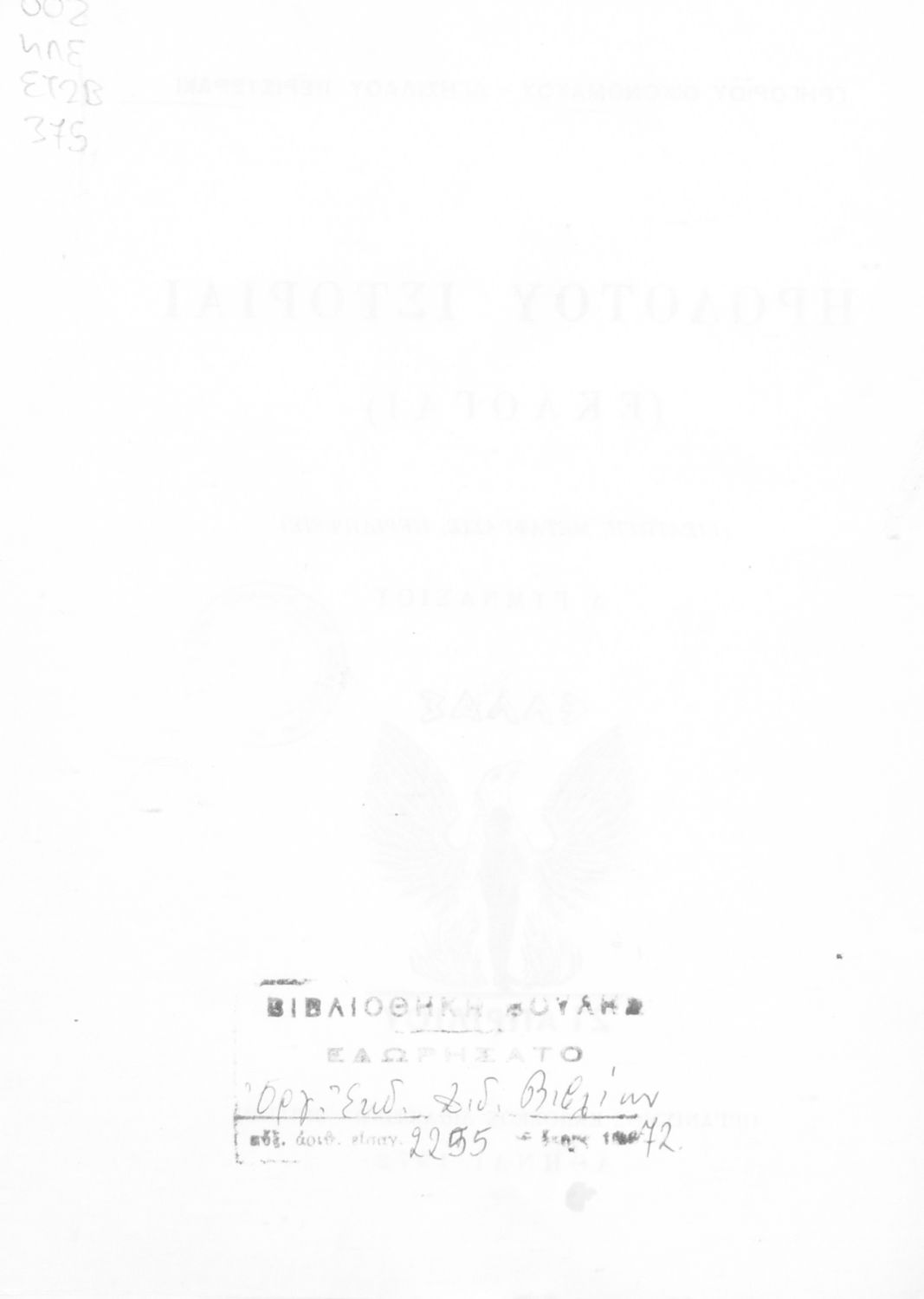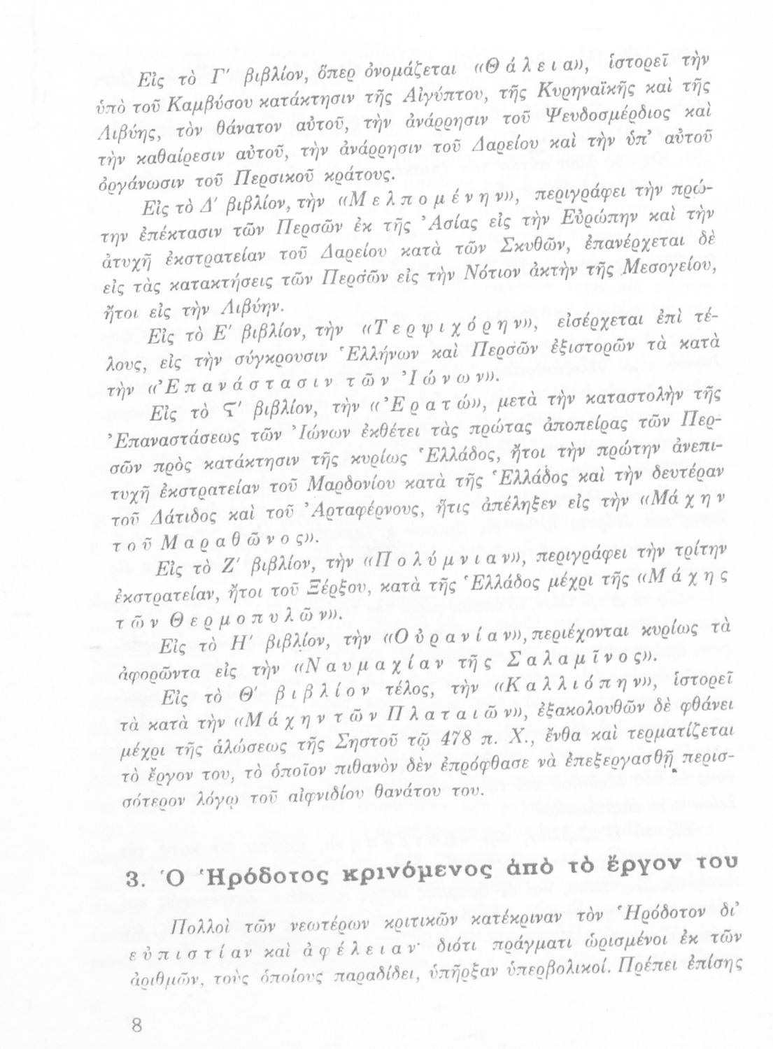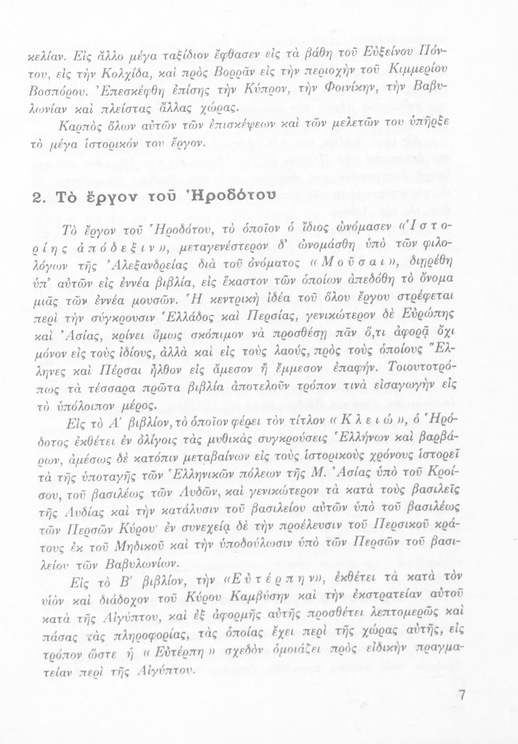 Σχολικό εγχειρίδιο Αρχαίων Ελληνικών Α΄ Γυμνασίου που περιλαμβάνει εισαγωγή στη ζωή και το έργο του Ηρόδοτου, και αποσπάσματα από τα 9 βιβλία της Ιστορίας του σε μετάφραση. Φέρει το σύμβολο της δικτατορίας.