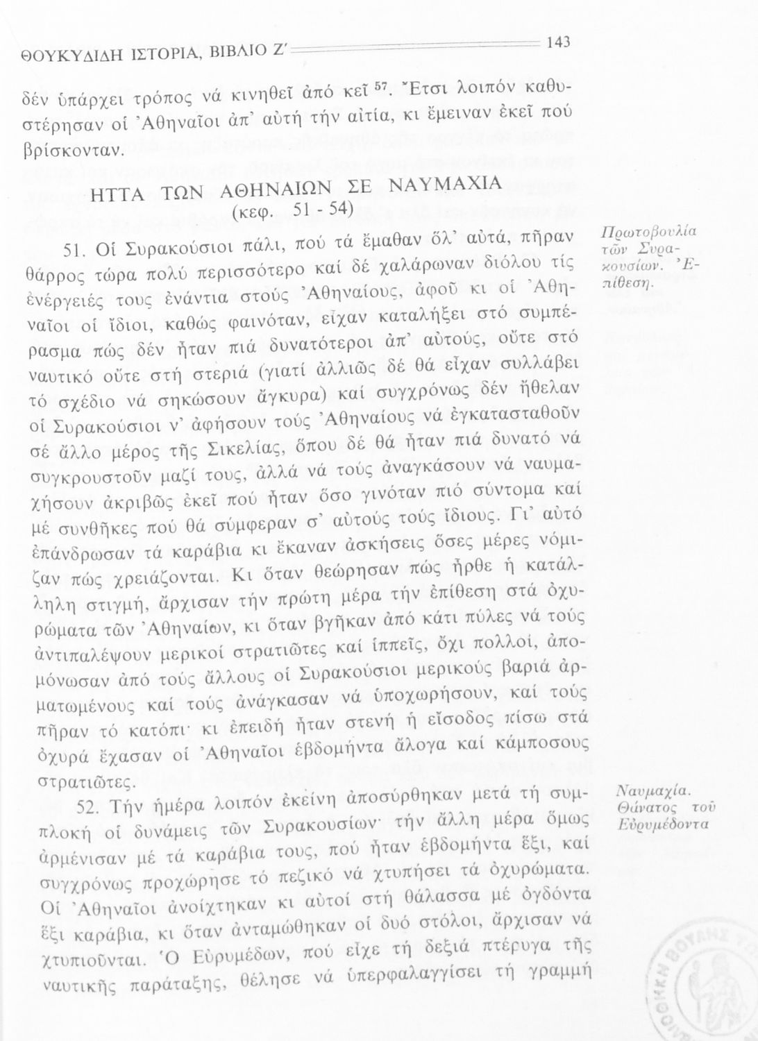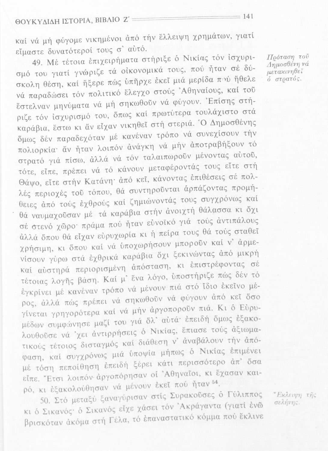 Σχολικό εγχειρίδιο Αρχαίων Ελληνικών Β΄ Γυμνασίου που περιλαμβάνει την μετάφραση των βιβλίων ΣΤ΄ και Ζ΄ της Ιστορίας του Θουκυδίδη, εισαγωγή στη ζωή και το έργο του, και ερμηνευτικά και πραγματολογικά σχόλια.