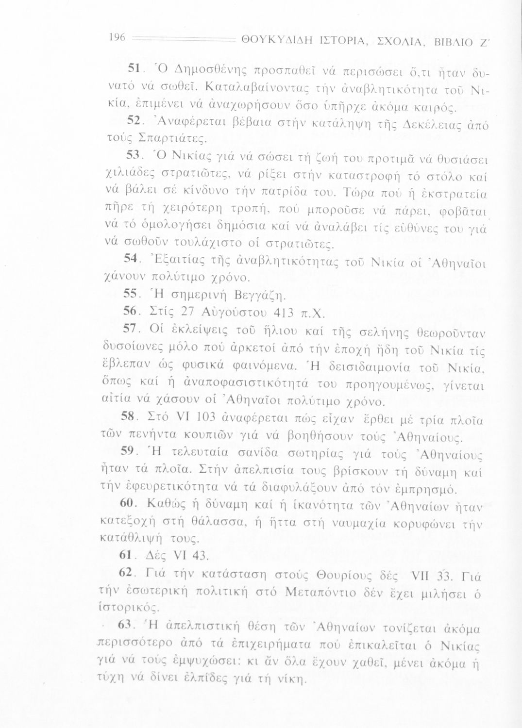 Σχολικό εγχειρίδιο Αρχαίων Ελληνικών Β΄ Γυμνασίου που περιλαμβάνει την μετάφραση των βιβλίων ΣΤ΄ και Ζ΄ της Ιστορίας του Θουκυδίδη, εισαγωγή στη ζωή και το έργο του, και ερμηνευτικά και πραγματολογικά σχόλια.