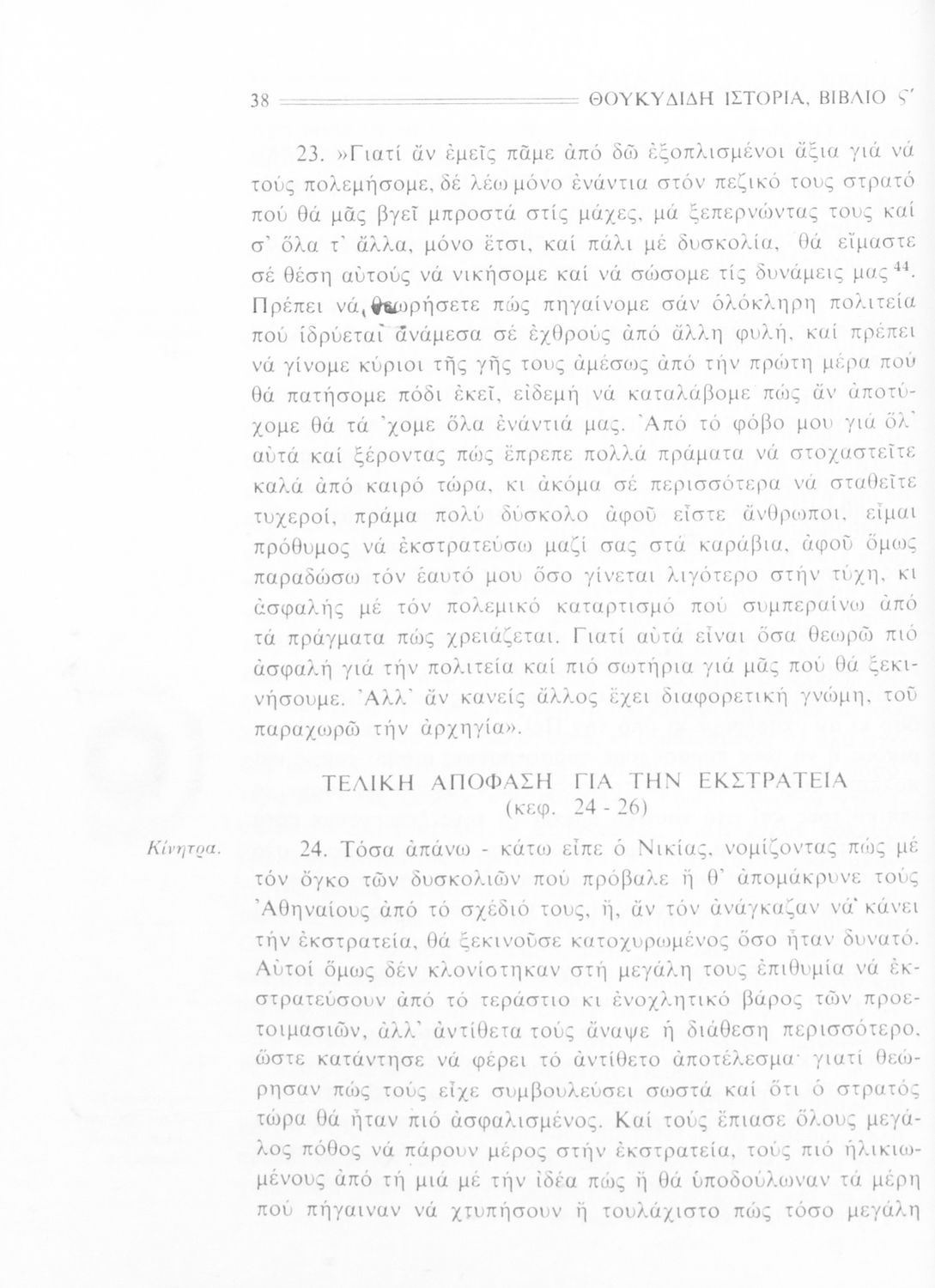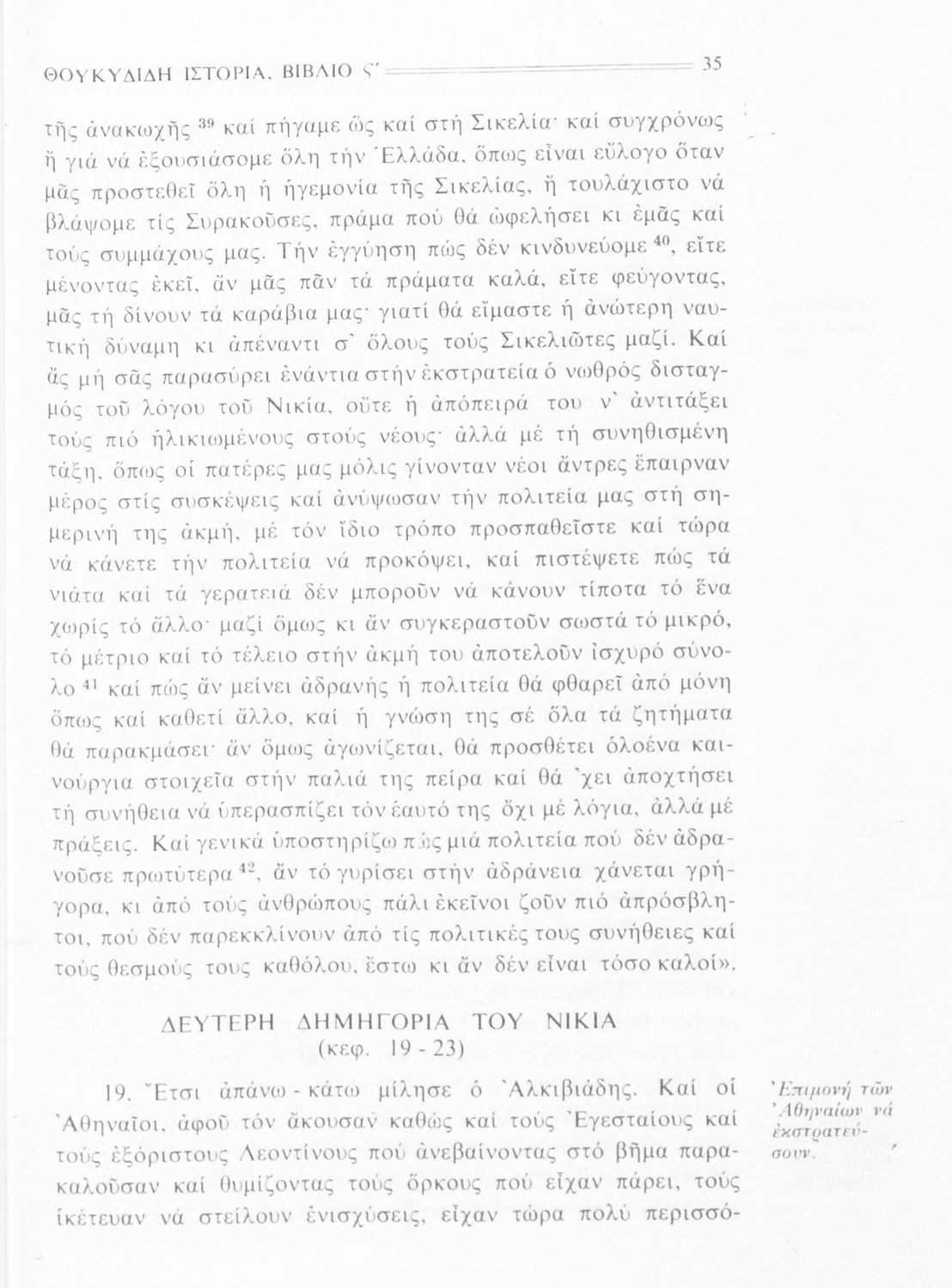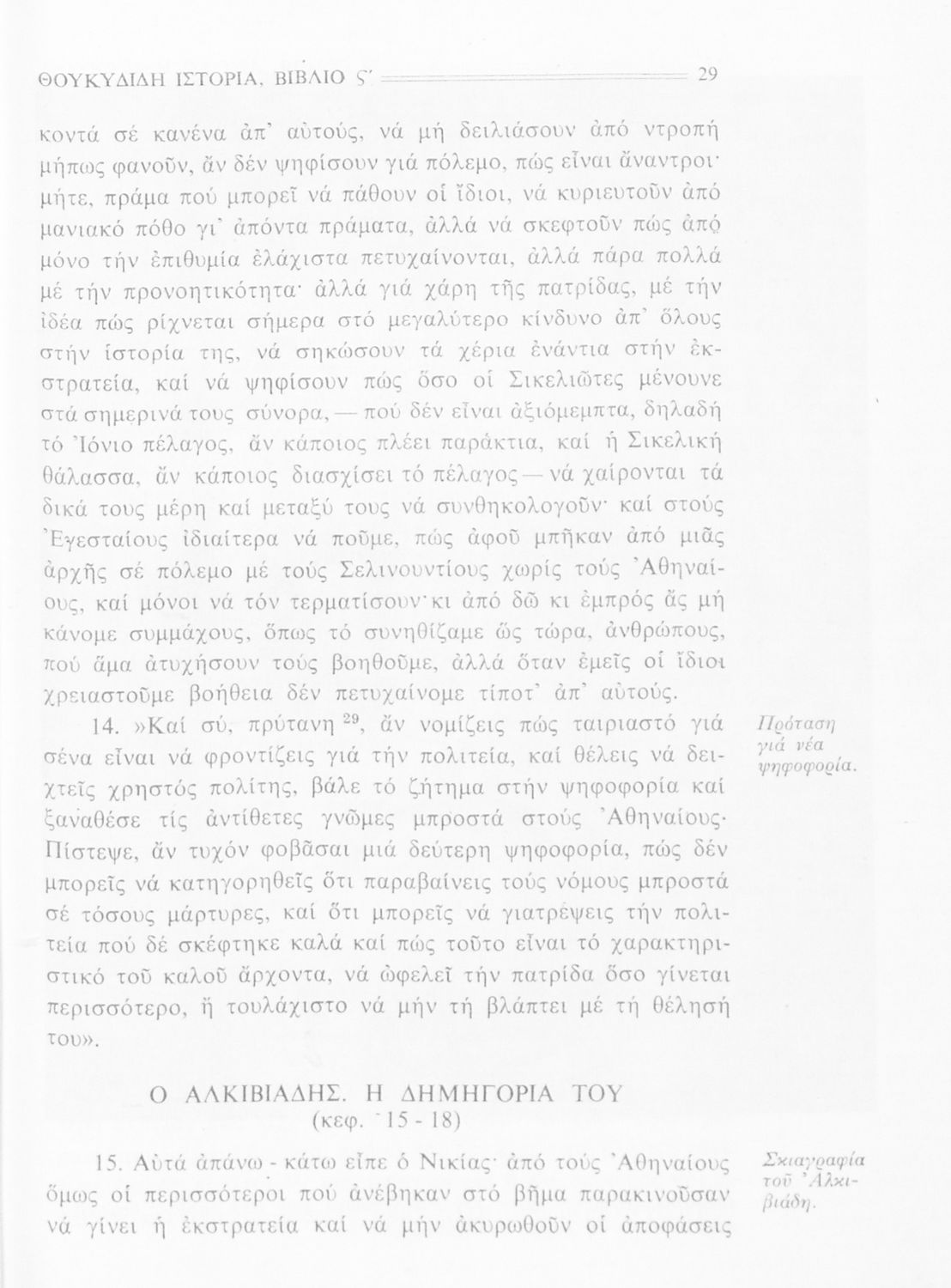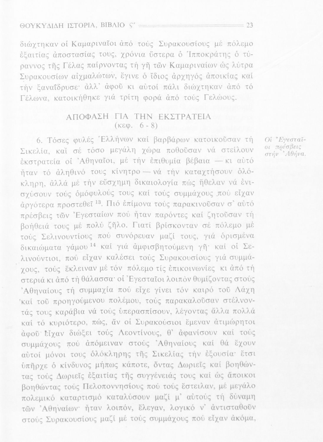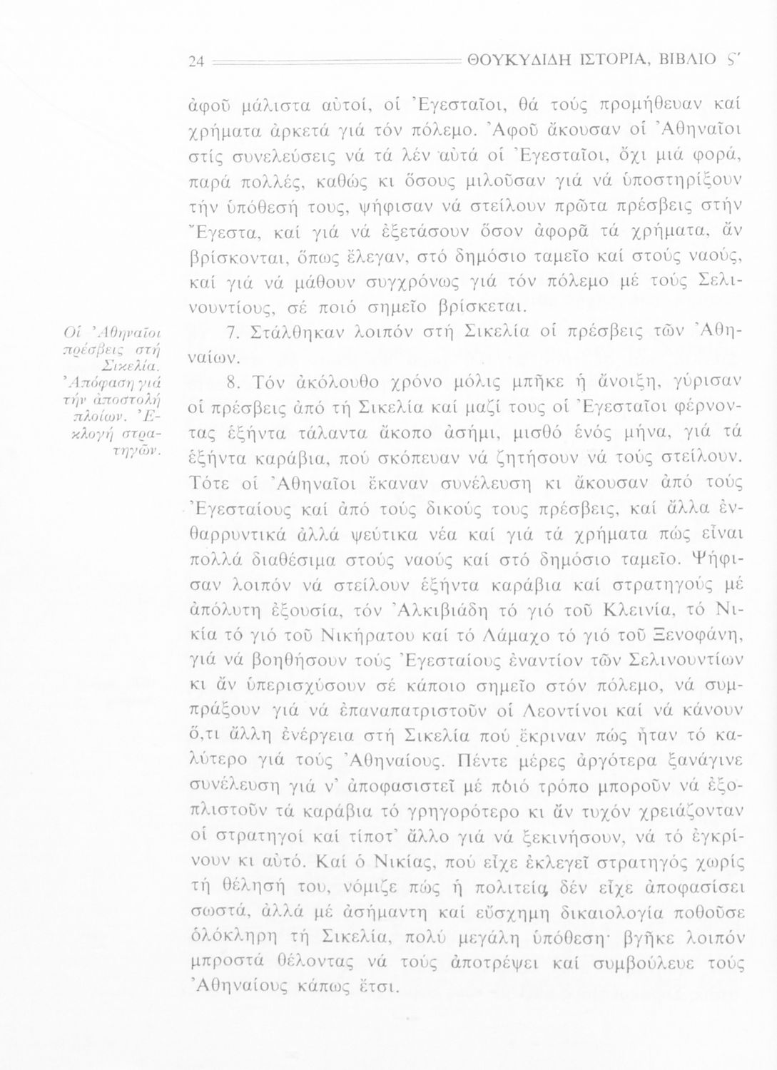 Σχολικό εγχειρίδιο Αρχαίων Ελληνικών Β΄ Γυμνασίου που περιλαμβάνει την μετάφραση των βιβλίων ΣΤ΄ και Ζ΄ της Ιστορίας του Θουκυδίδη, εισαγωγή στη ζωή και το έργο του, και ερμηνευτικά και πραγματολογικά σχόλια.