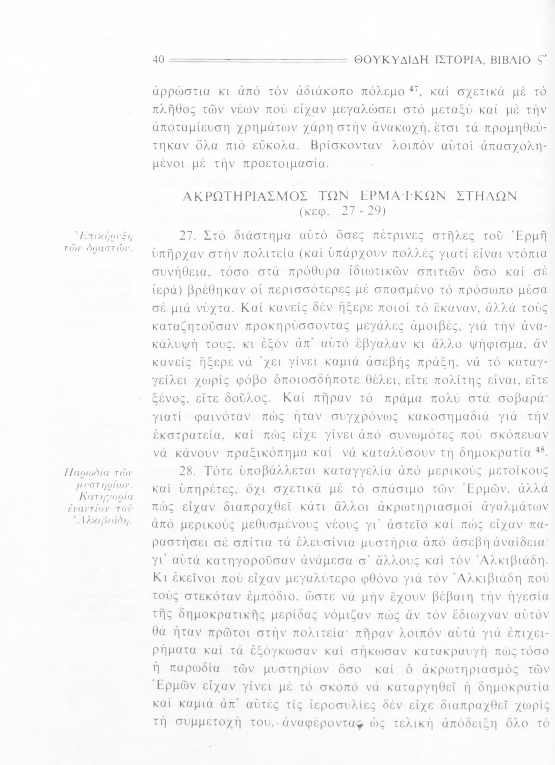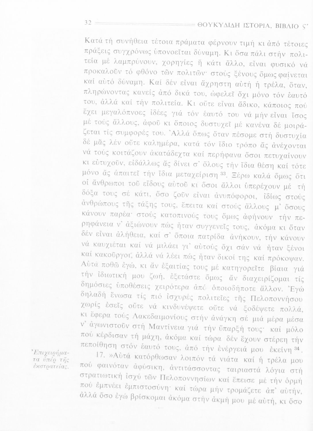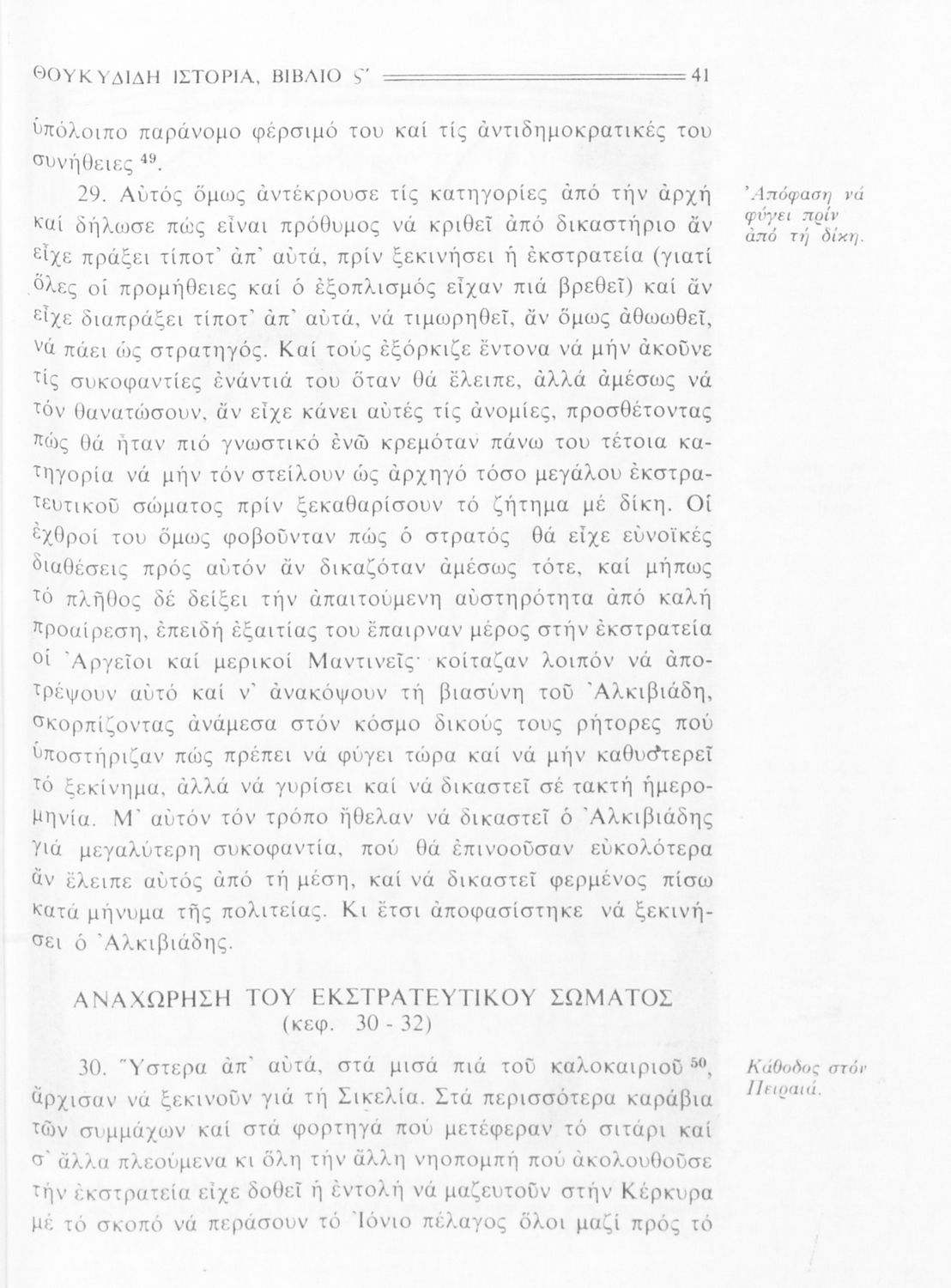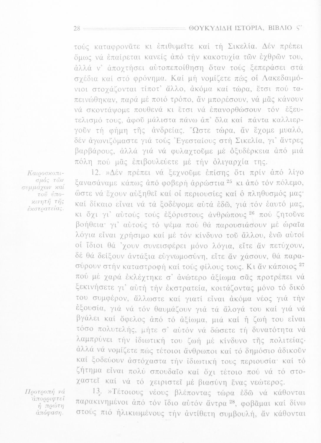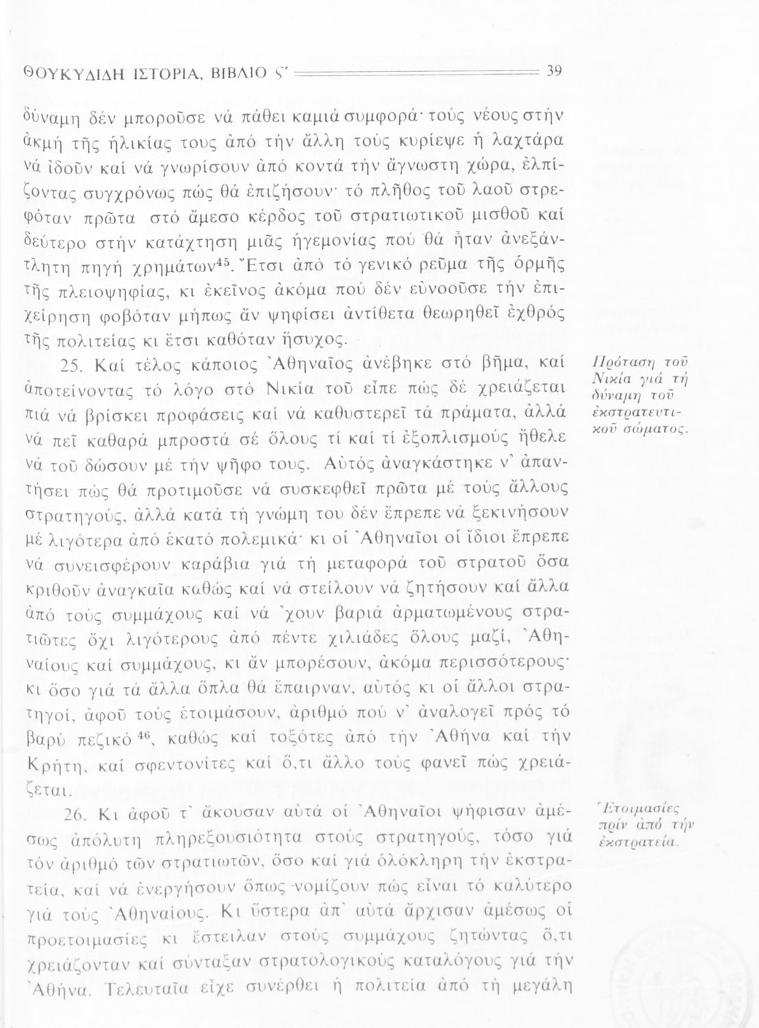 Σχολικό εγχειρίδιο Αρχαίων Ελληνικών Β΄ Γυμνασίου που περιλαμβάνει την μετάφραση των βιβλίων ΣΤ΄ και Ζ΄ της Ιστορίας του Θουκυδίδη, εισαγωγή στη ζωή και το έργο του, και ερμηνευτικά και πραγματολογικά σχόλια.
