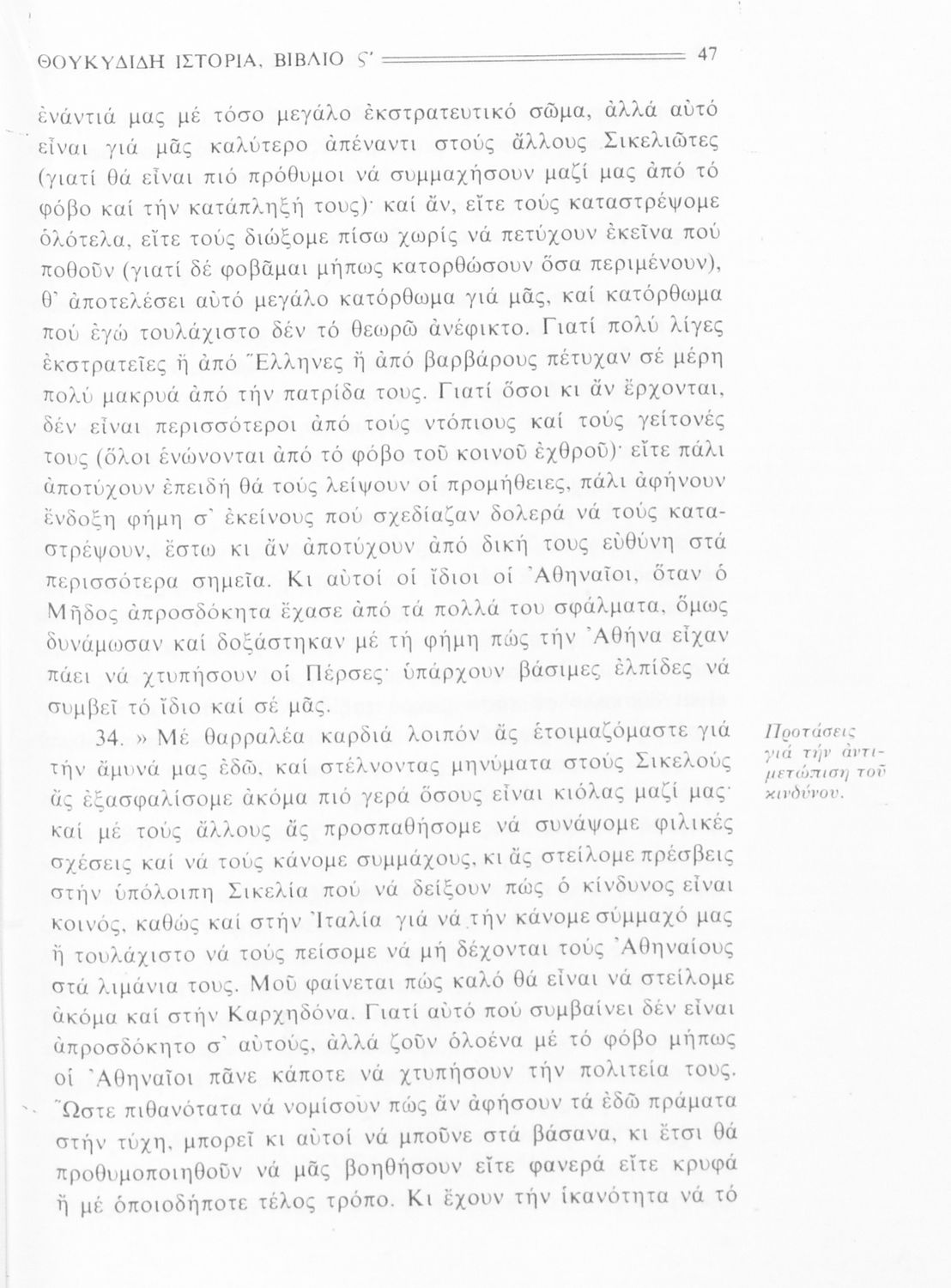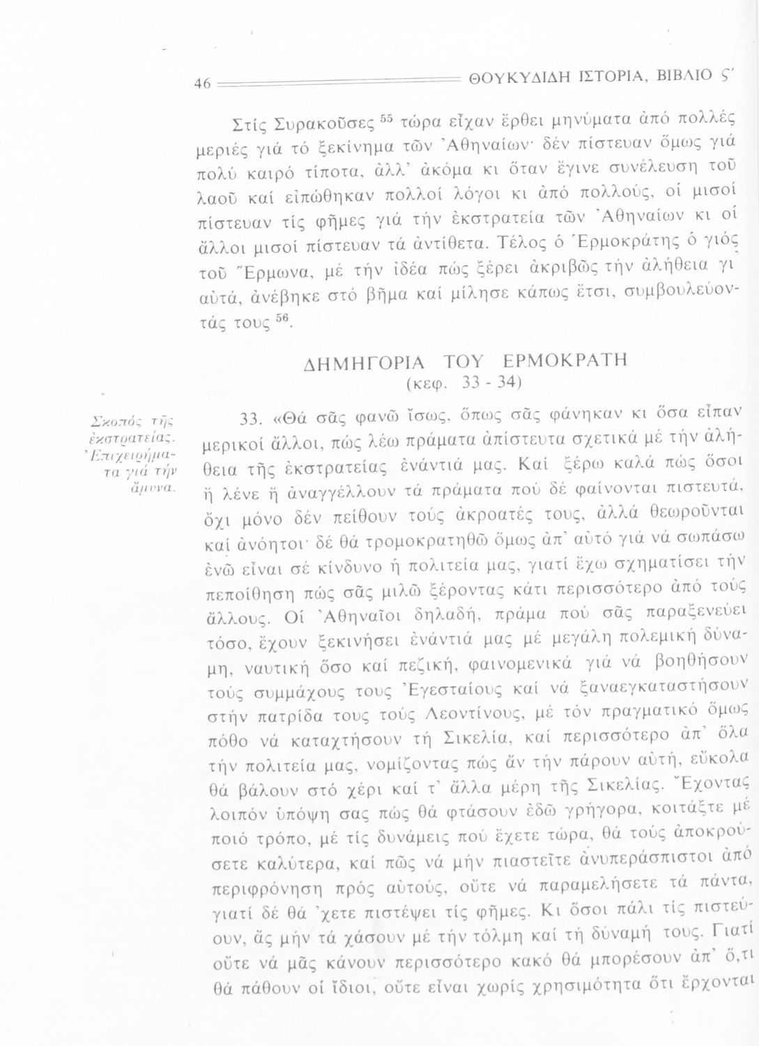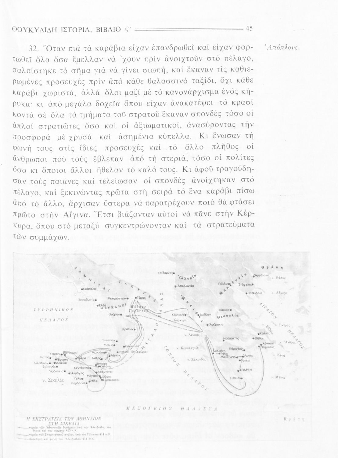 Σχολικό εγχειρίδιο Αρχαίων Ελληνικών Β΄ Γυμνασίου που περιλαμβάνει την μετάφραση των βιβλίων ΣΤ΄ και Ζ΄ της Ιστορίας του Θουκυδίδη, εισαγωγή στη ζωή και το έργο του, και ερμηνευτικά και πραγματολογικά σχόλια.