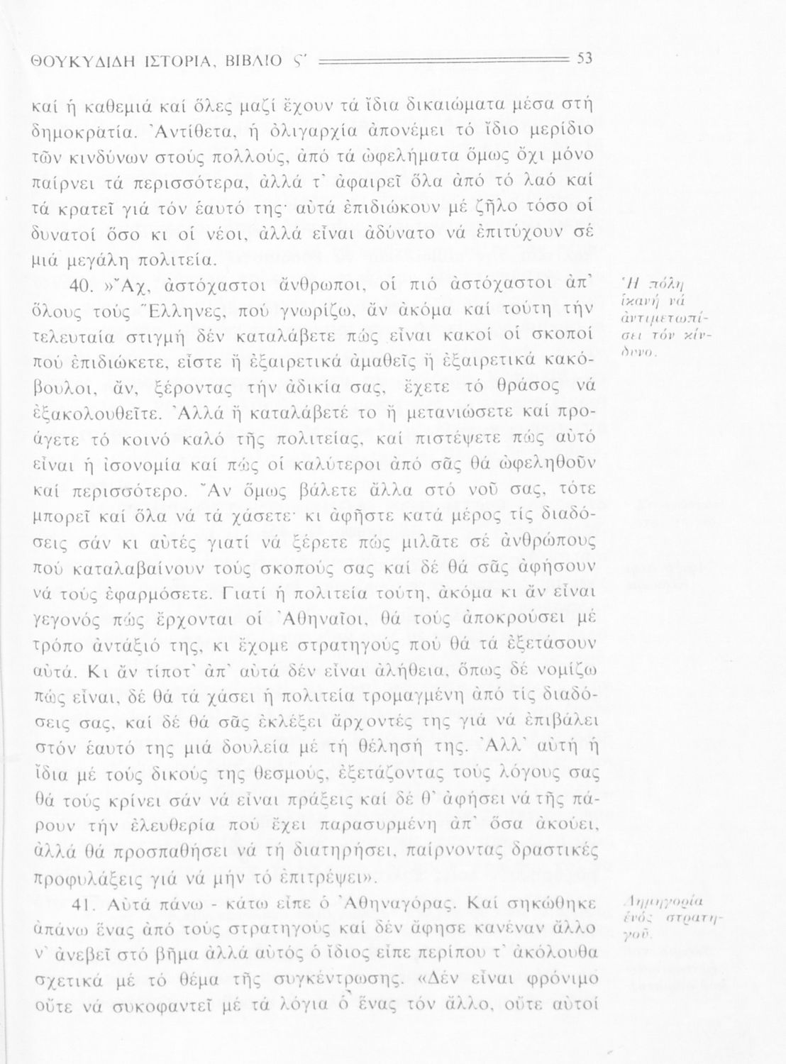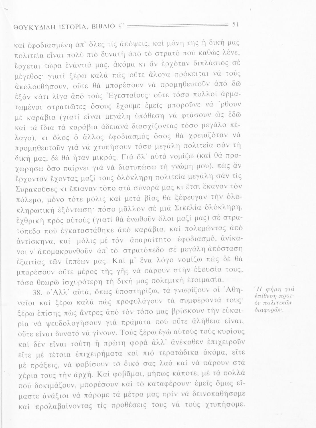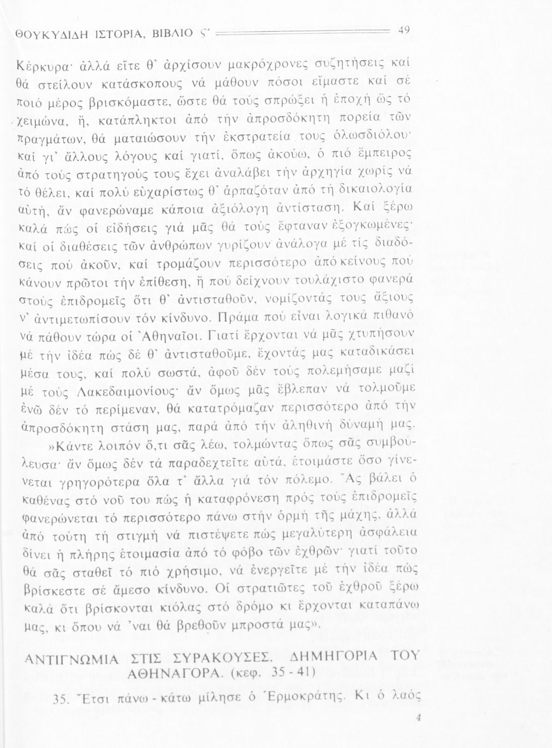 Σχολικό εγχειρίδιο Αρχαίων Ελληνικών Β΄ και Γ΄ Γυμνασίου που περιέχει αποσπάσματα από το έργο του Θουκυδίδη Ιστορία, και με ερμηνευτικές και πραγματολογικές παρατηρήσεις.