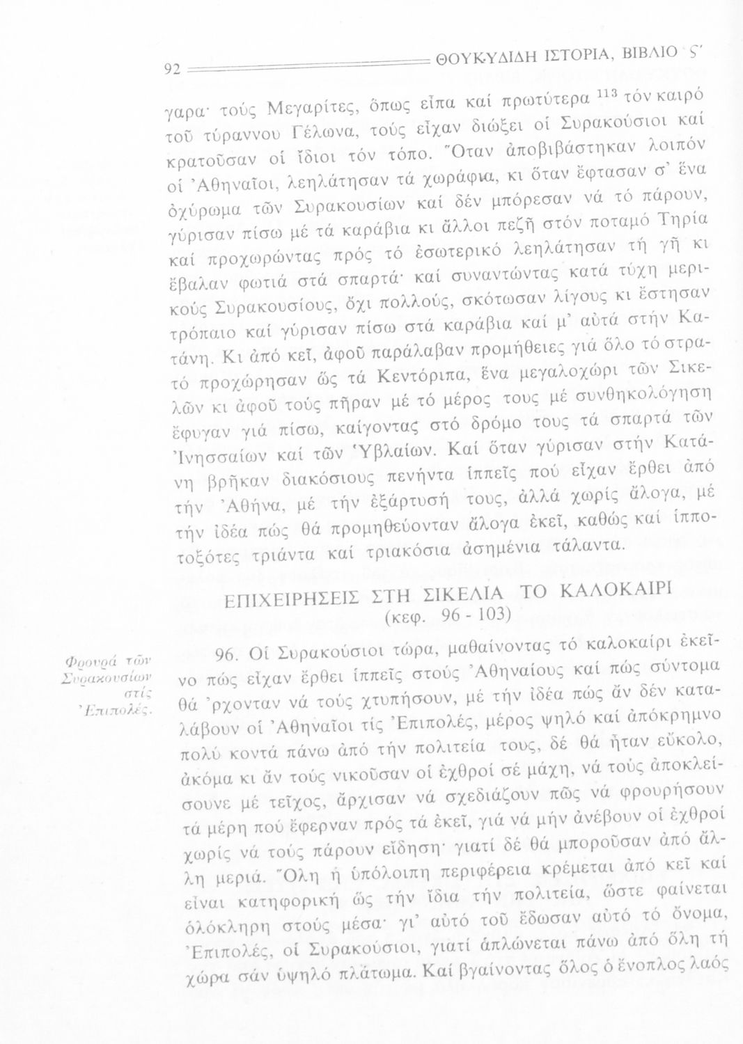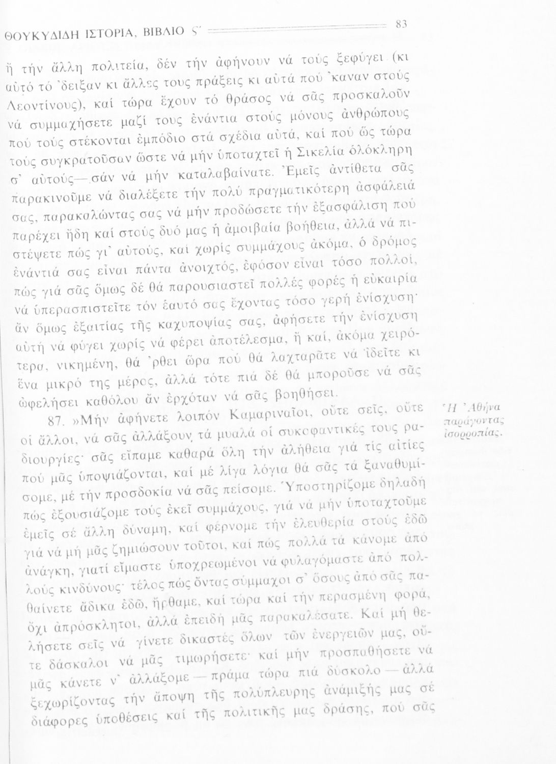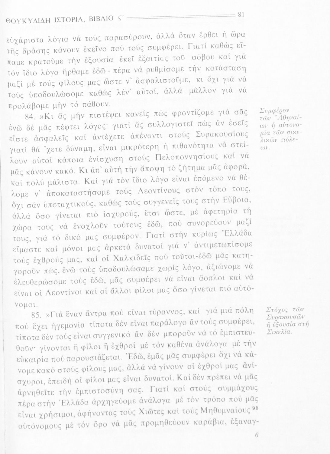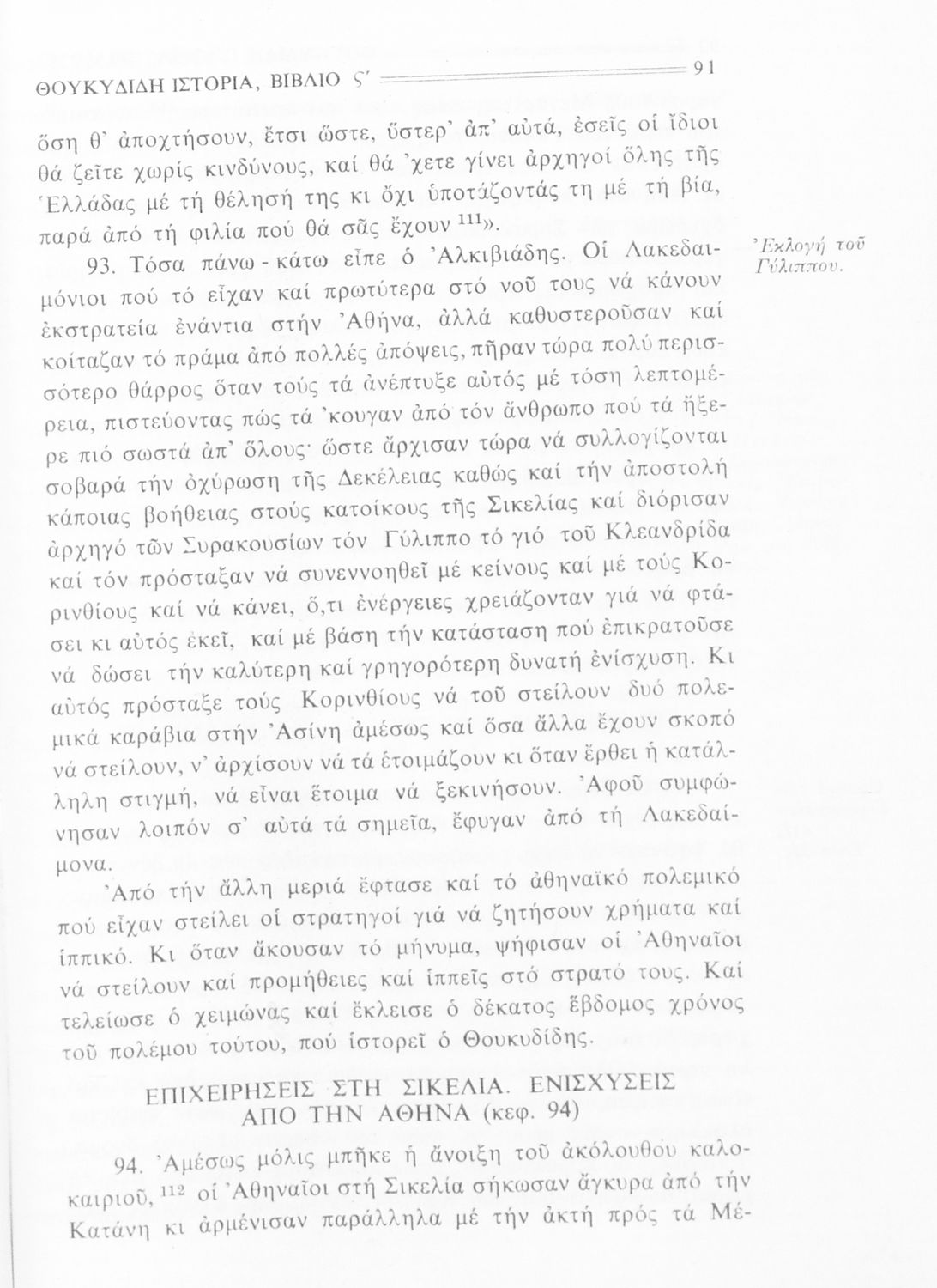Σχολικό εγχειρίδιο Αρχαίων Ελληνικών Β΄ Γυμνασίου που περιλαμβάνει την μετάφραση των βιβλίων ΣΤ΄ και Ζ΄ της Ιστορίας του Θουκυδίδη, εισαγωγή στη ζωή και το έργο του, και ερμηνευτικά και πραγματολογικά σχόλια.