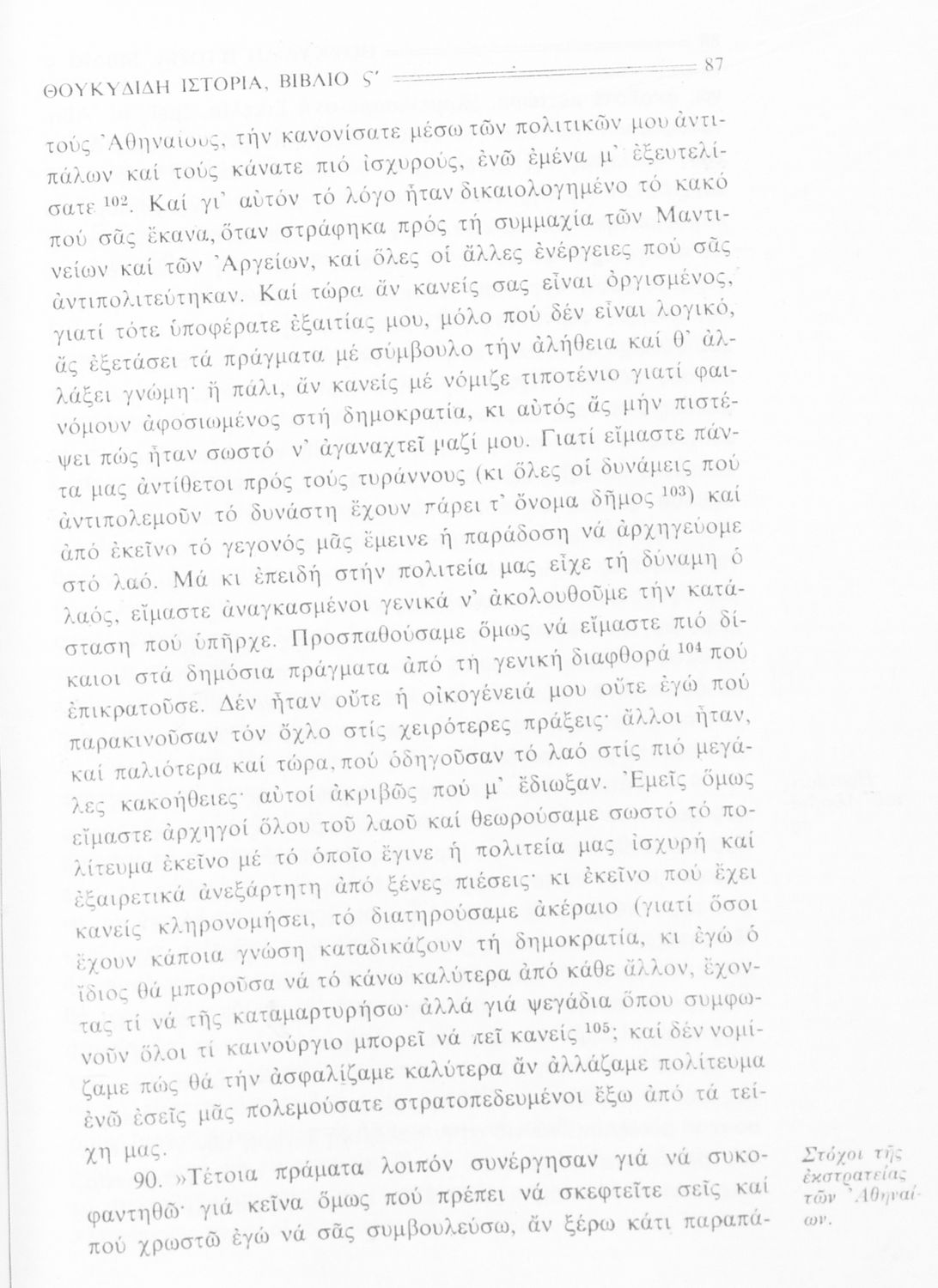 Σχολικό εγχειρίδιο Αρχαίων Ελληνικών Δ΄, Ε΄ και ΣΤ΄ Γυμνασίου που περιέχει αποσπάσματα από το έργο του Θουκυδίδη Ιστορία, ερμηνευτικά και πραγματολογικά σχόλια, και γραμματικές παρατηρήσεις.