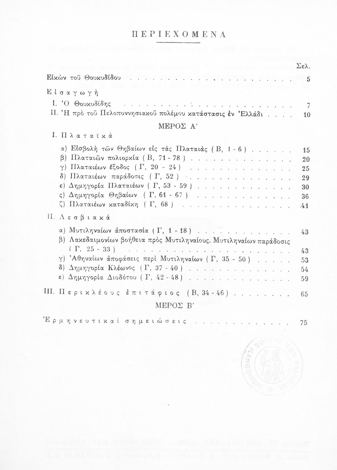 Σχολικό εγχειρίδιο Αρχαίων Ελληνικών Γυμνασίου που περιέχει εισαγωγή στη ζωή και το έργο του Θουκυδίδη, αποσπάσματα από τα Πλαταιϊκά, τα Λεσβιακά και τον Επιτάφιο του Περικλή και ερμηνευτικές σημειώσεις.