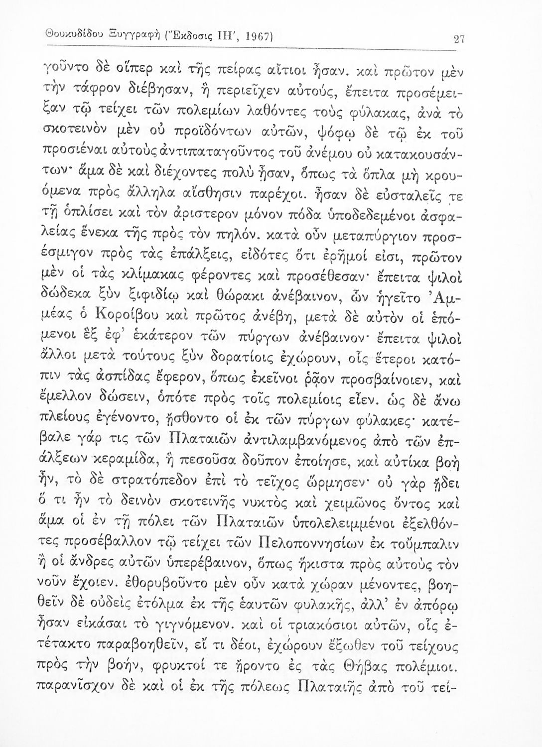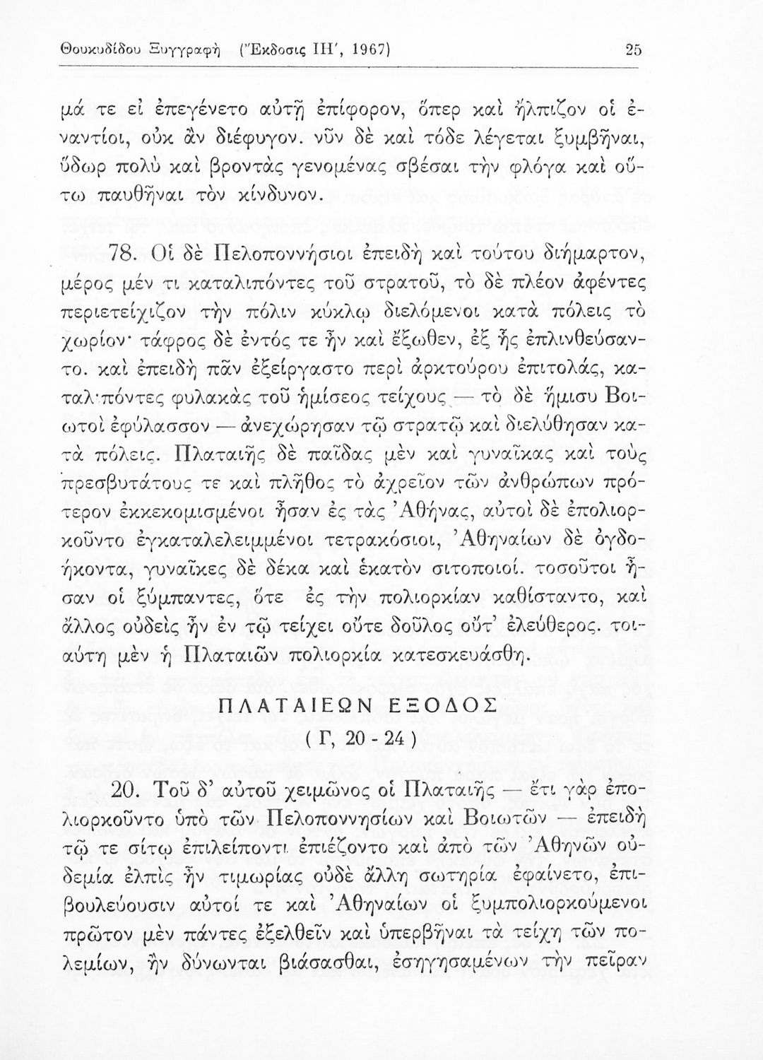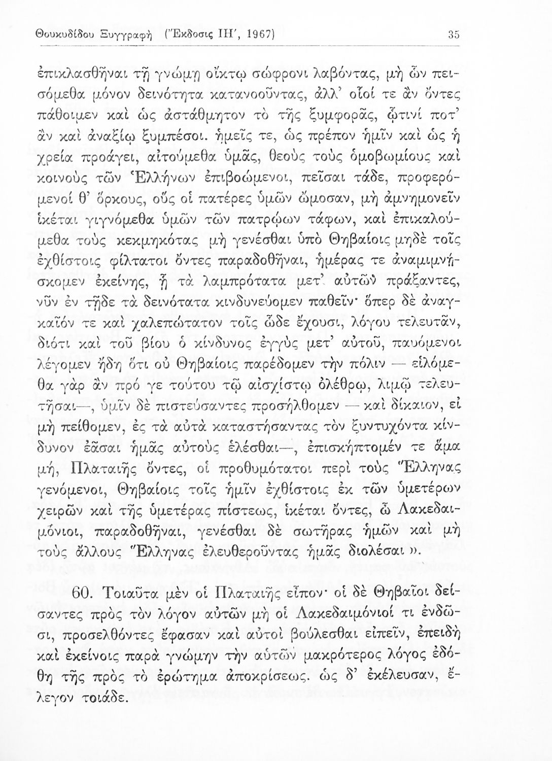 Σχολικό εγχειρίδιο Αρχαίων Ελληνικών για τις Δ΄, Ε΄ και ΣΤ΄ Γυμνασίου παλαιού τύπου που περιλαμβάνει σύντομο βιογραφικό σημείωμα του Θουκυδίδη, περιγραφή του ιστορικού πλαισίου, αποσπάσματα από τα Πλαταϊκά, τα