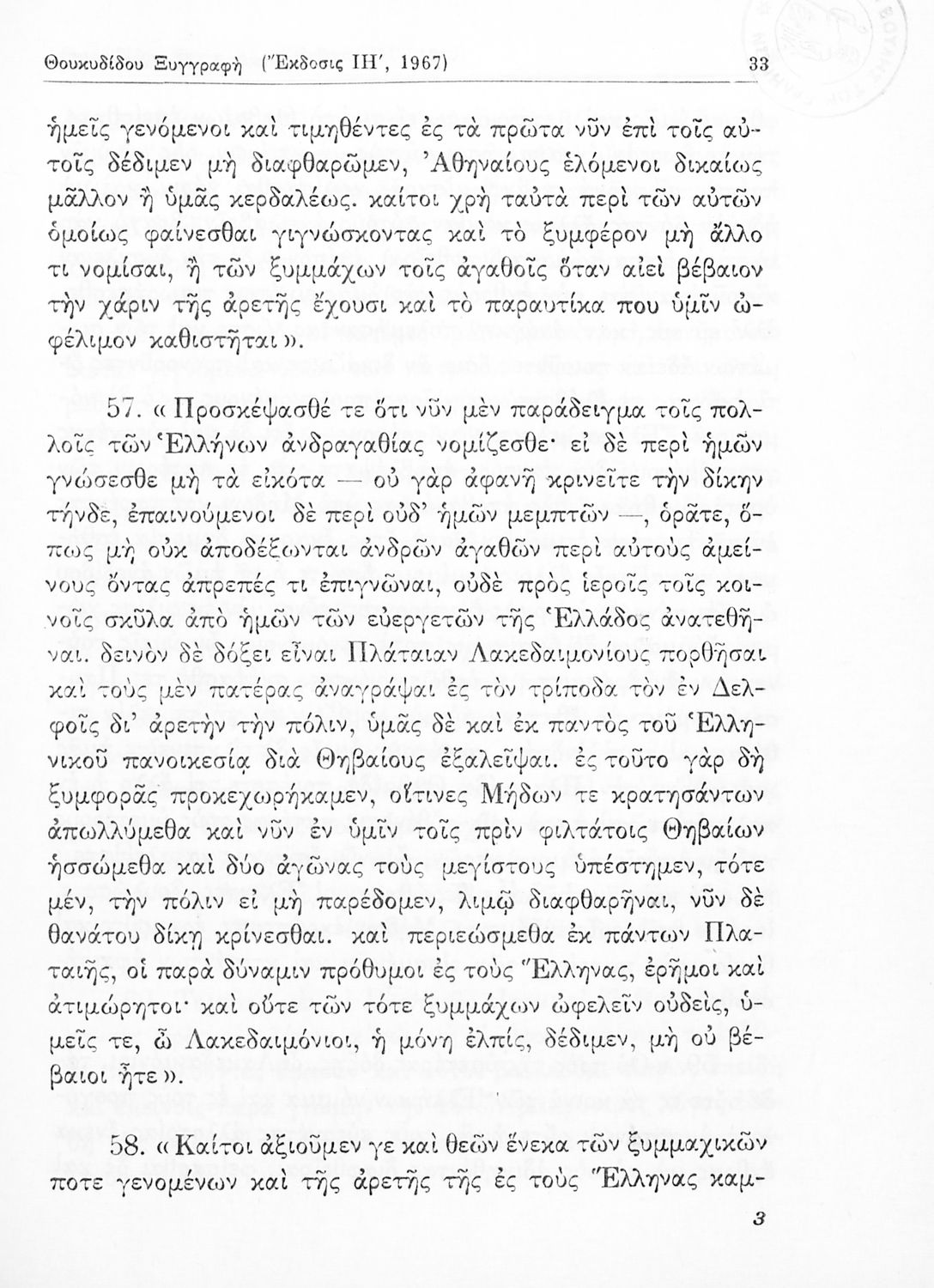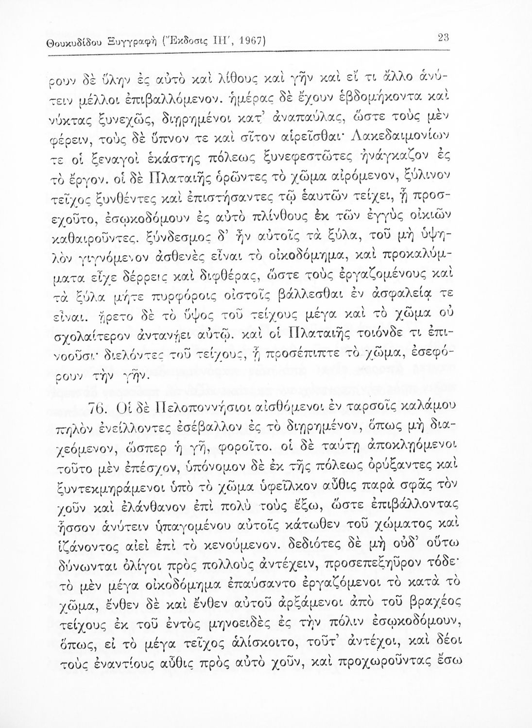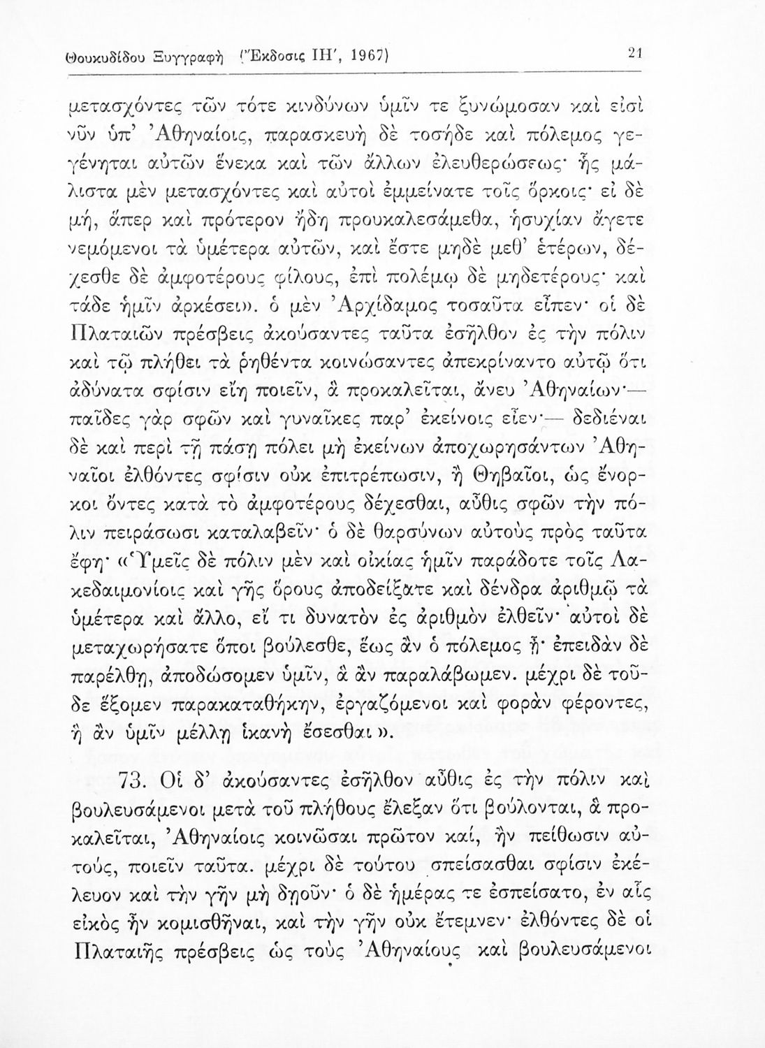 Σχολικό εγχειρίδιο Αρχαίων Ελληνικών για τις Δ΄, Ε΄ και ΣΤ΄ Γυμνασίου παλαιού τύπου που περιλαμβάνει σύντομο βιογραφικό σημείωμα του Θουκυδίδη, περιγραφή του ιστορικού πλαισίου, αποσπάσματα από τα Πλαταϊκά, τα