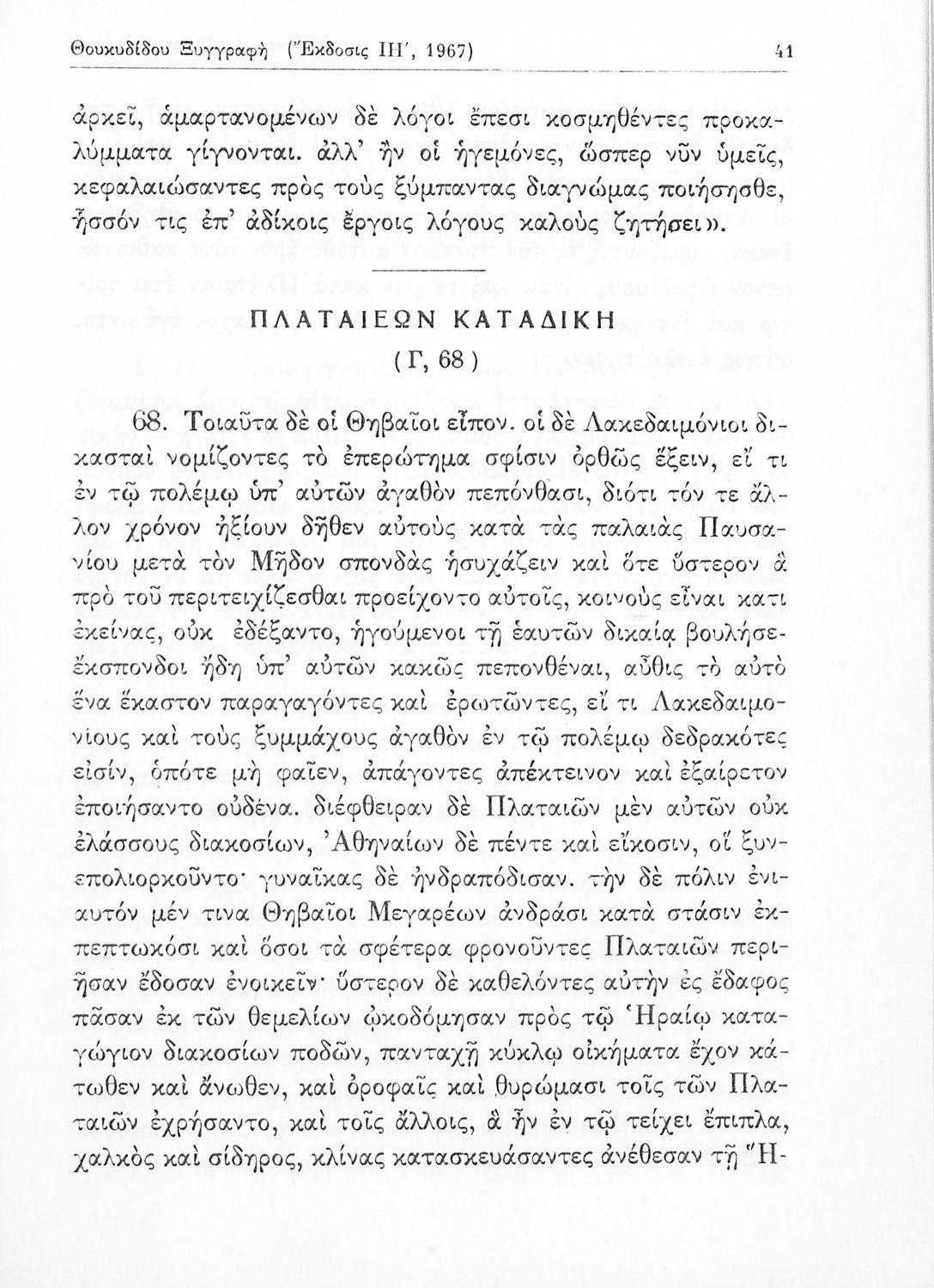 Σχολικό εγχειρίδιο Αρχαίων Ελληνικών για τις Δ΄, Ε΄ και ΣΤ΄ Γυμνασίου παλαιού τύπου που περιλαμβάνει σύντομο βιογραφικό σημείωμα του Θουκυδίδη, περιγραφή του ιστορικού πλαισίου, αποσπάσματα από τα Πλαταϊκά, τα
