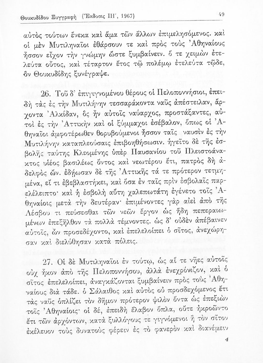 Σχολικό εγχειρίδιο Αρχαίων Ελληνικών Δ΄ Γυμνασίου που περιέχει εισαγωγή στη ζωή και το έργο του Θουκυδίδη, αποσπάσματα από τα Πλαταιϊκά, τα Λεσβιακά και τον Επιτάφιο του Περικλή και ερμηνευτικές σημειώσεις.