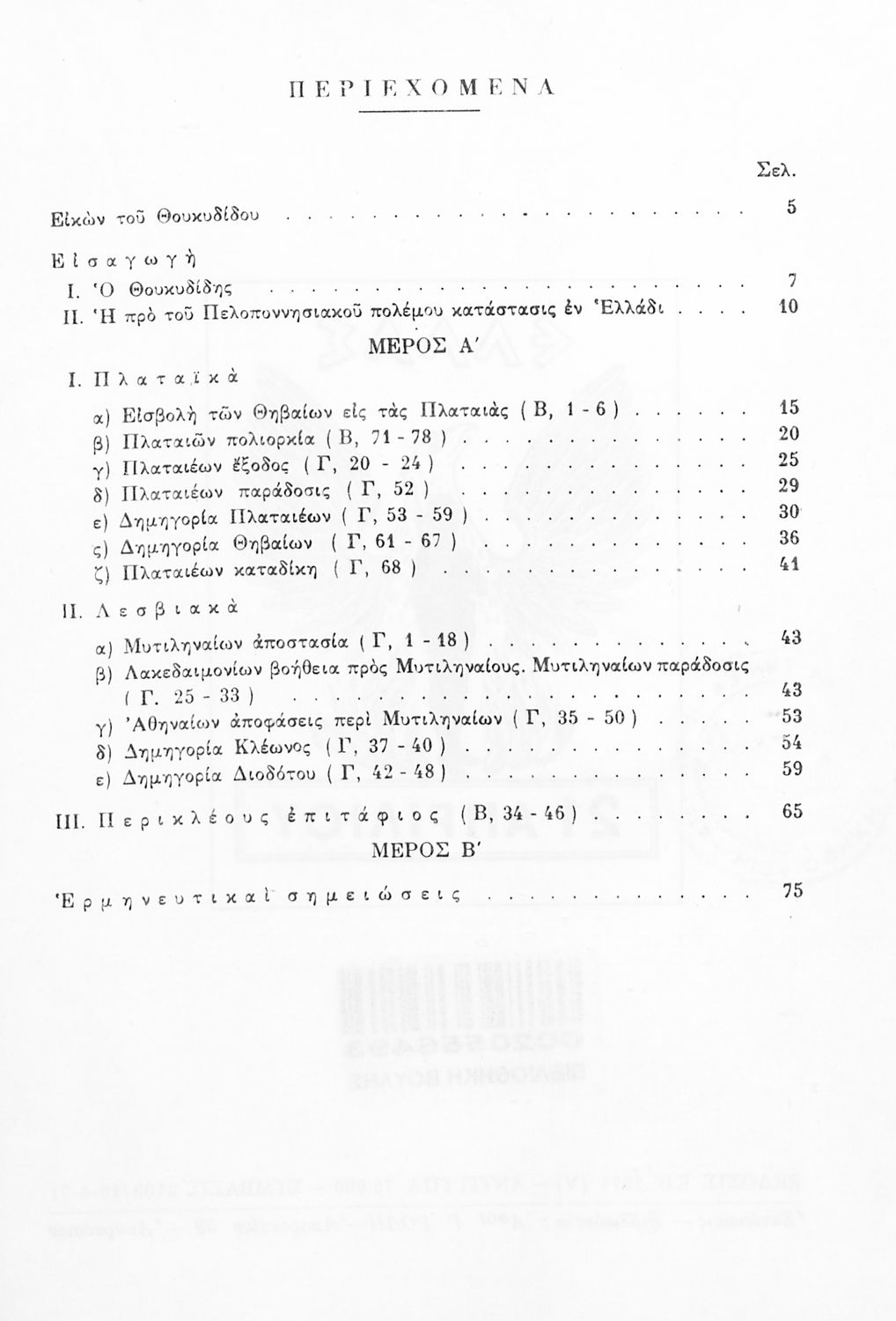 Σχολικό εγχειρίδιο Αρχαίων Ελληνικών Δ΄ Γυμνασίου που περιέχει εισαγωγή στη ζωή και το έργο του Θουκυδίδη, αποσπάσματα από τα Πλαταιϊκά, τα Λεσβιακά και τον Επιτάφιο του Περικλή και ερμηνευτικές σημειώσεις. Φέρει το σύμβολο της δικτατορίας.
