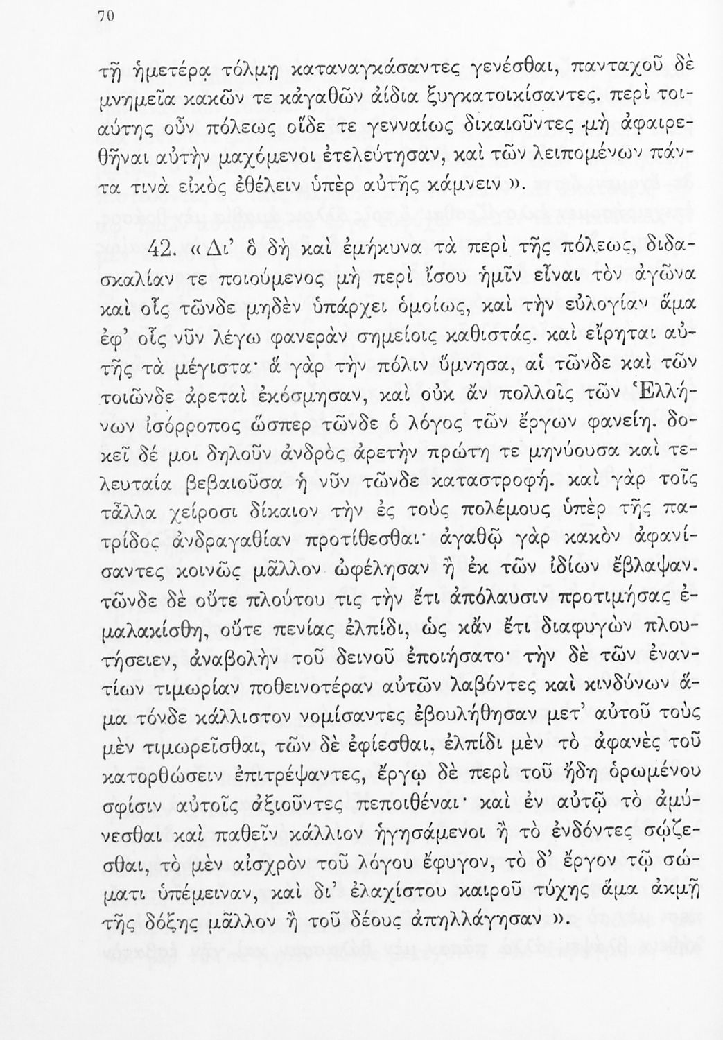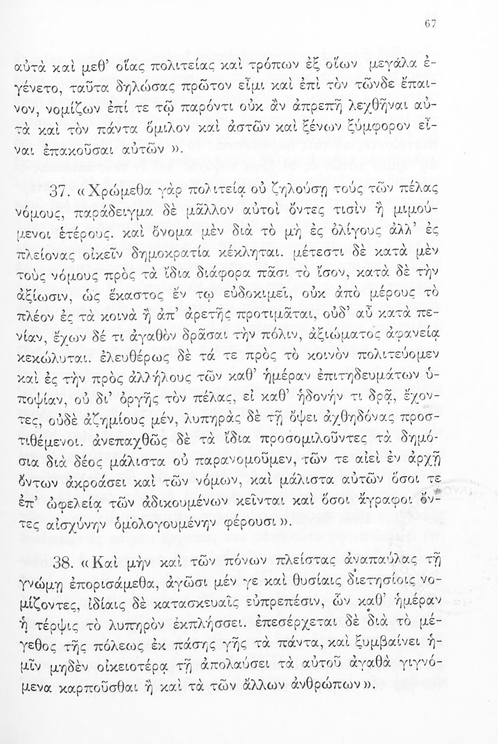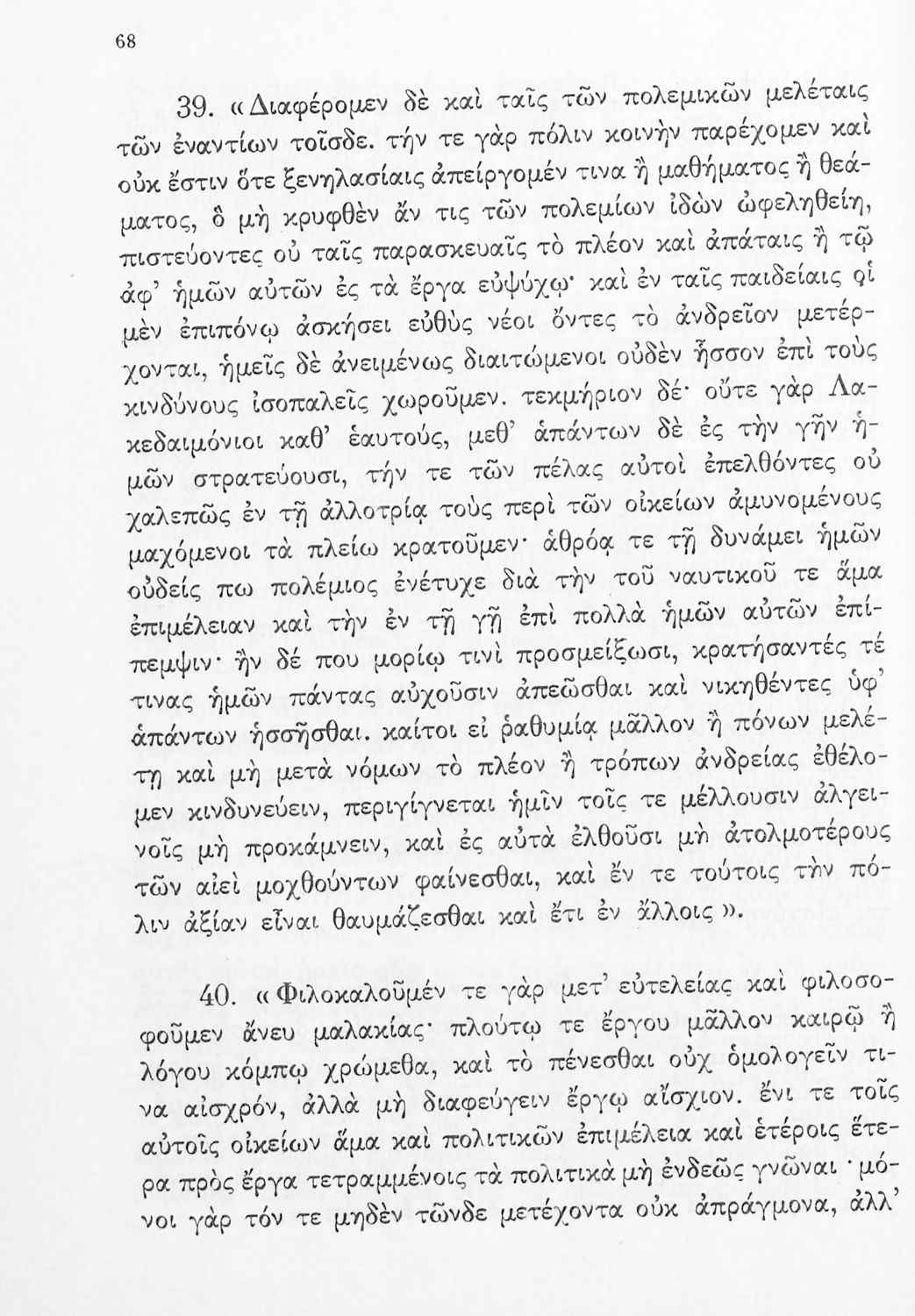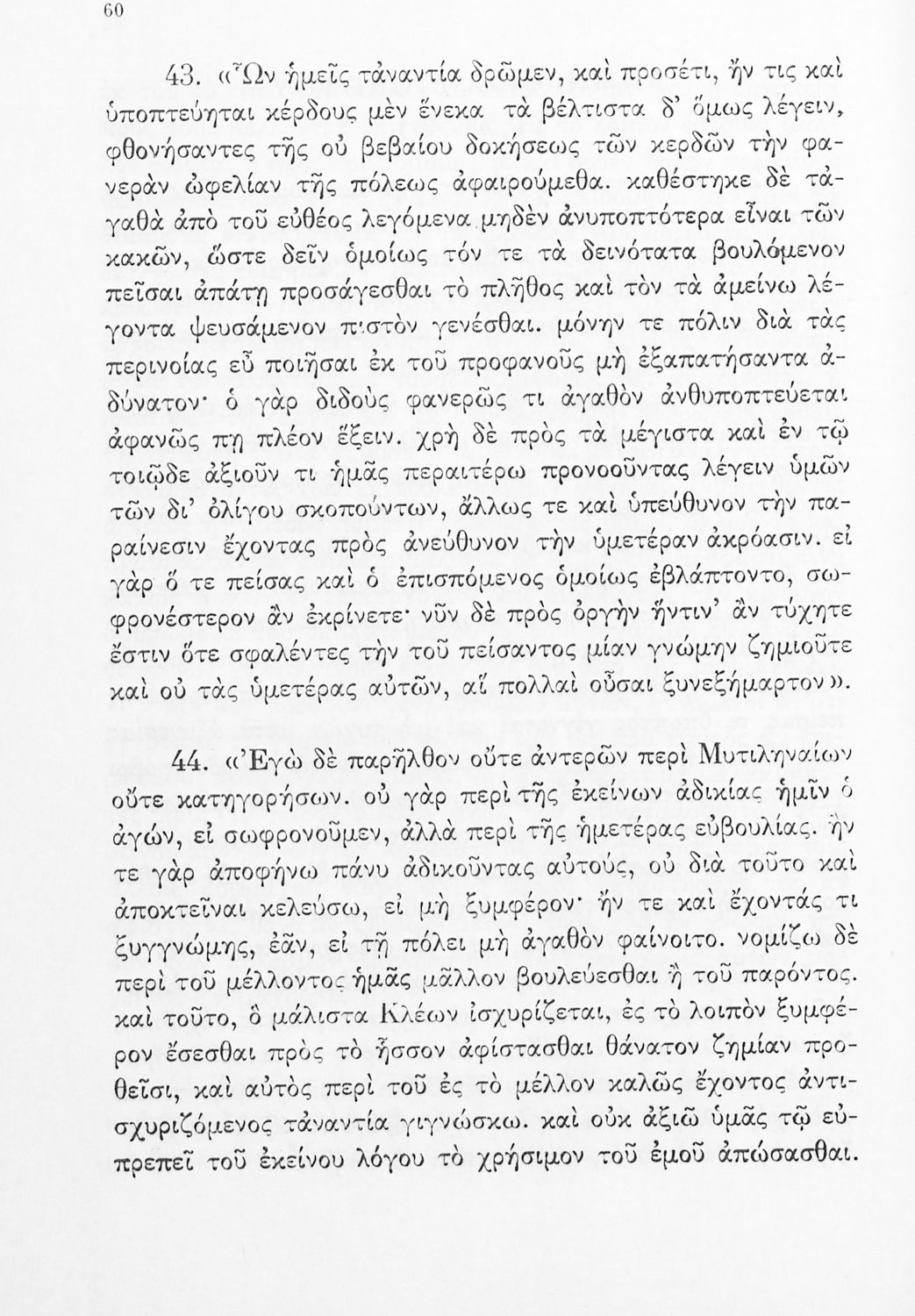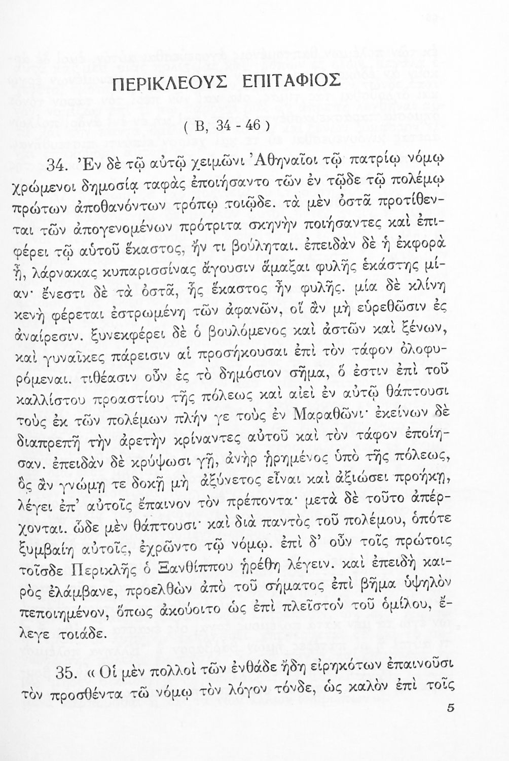 Σχολικό εγχειρίδιο Αρχαίων Ελληνικών Δ΄ Γυμνασίου που περιέχει εισαγωγή στη ζωή και το έργο του Θουκυδίδη, αποσπάσματα από τα Πλαταιϊκά, τα Λεσβιακά και τον Επιτάφιο του Περικλή και ερμηνευτικές σημειώσεις. Φέρει το σύμβολο της δικτατορίας.