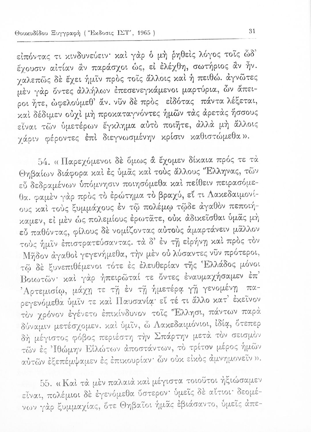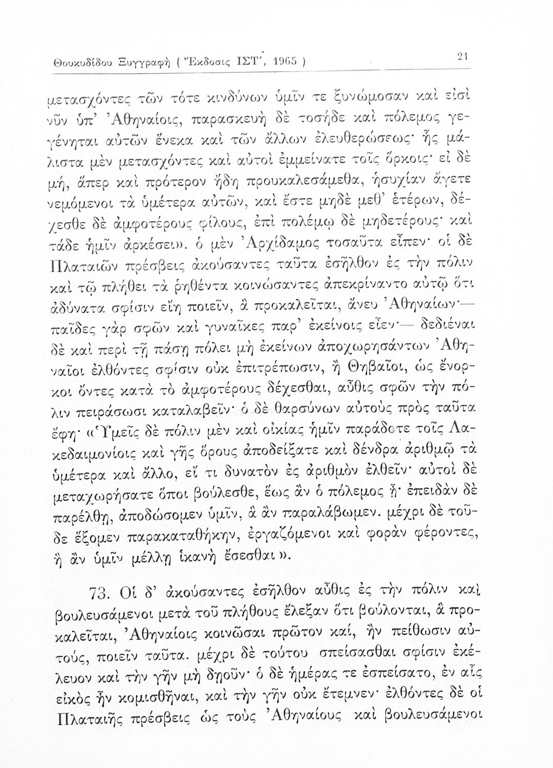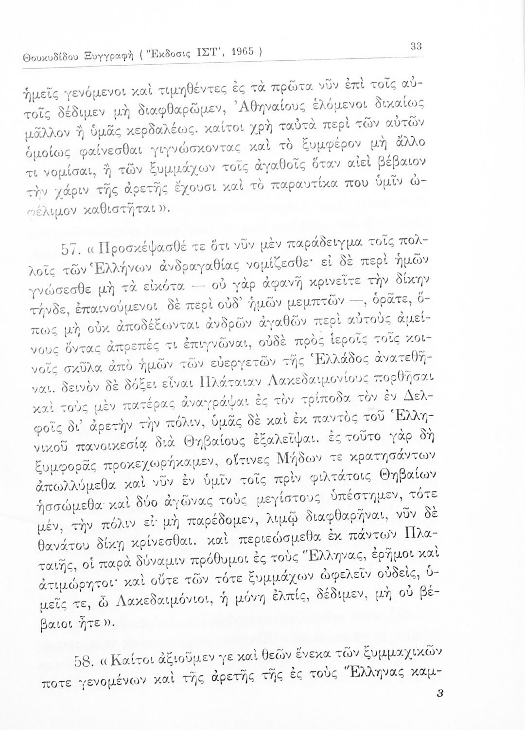 Βαθμίδα εκπαίδευσης: Δευτεροβάθμια Τάξη: Δ' Γυμνασίου Μάθημα: Αρχαία Ελληνικά Γλώσσα: Καθαρεύουσα Παρουσίαση περιεχομένου: Σχολικό εγχειρίδιο Αρχαίων Ελληνικών Δ΄ Γυμνασίου που περιέχει εισαγωγή στη ζωή και το έργο του Θουκυδίδη, αποσπάσματα από τα Πλαταιϊκά, τα Λεσβιακά και τον Επιτάφιο του Περικλή και ερμηνευτικές σημειώσεις |