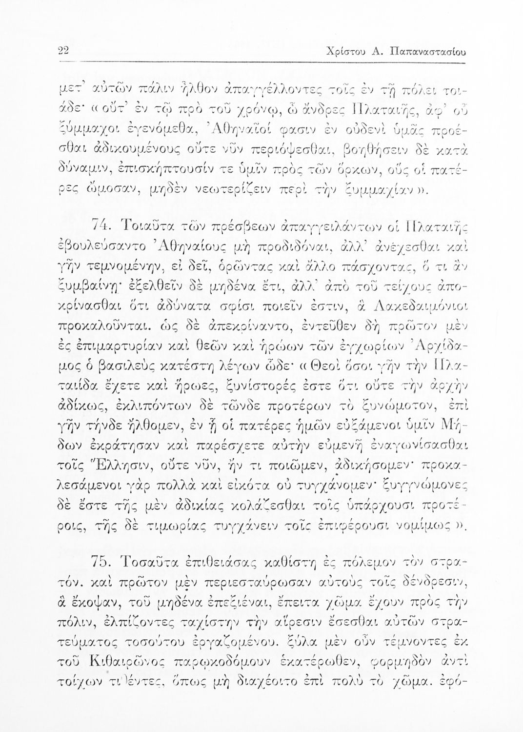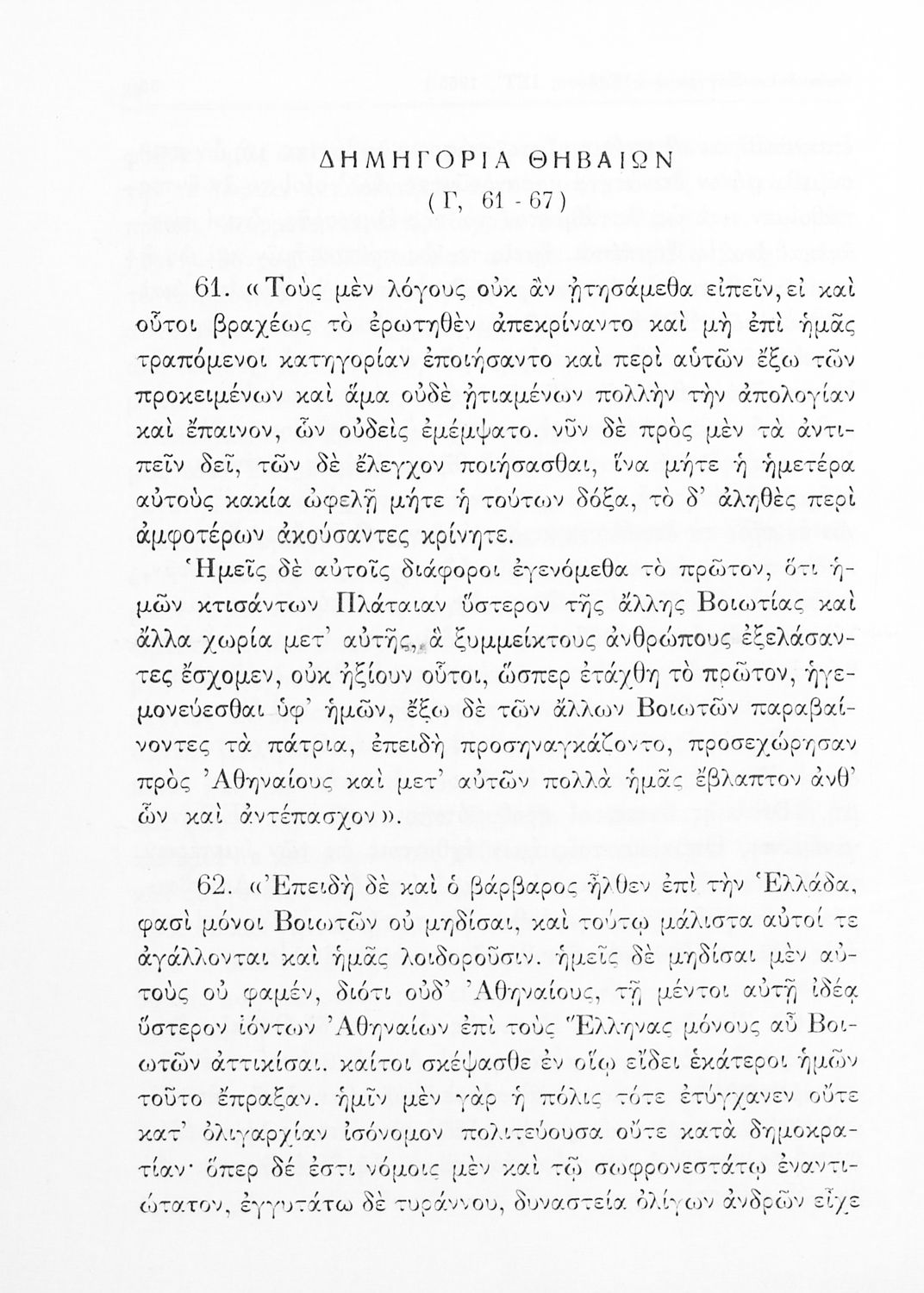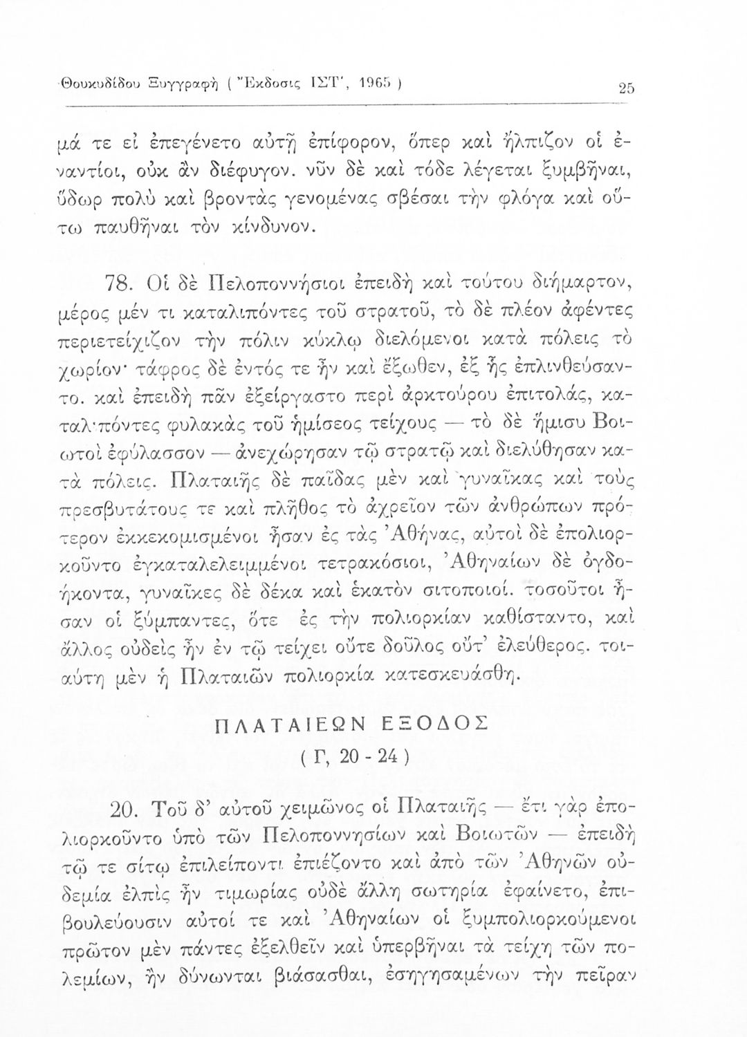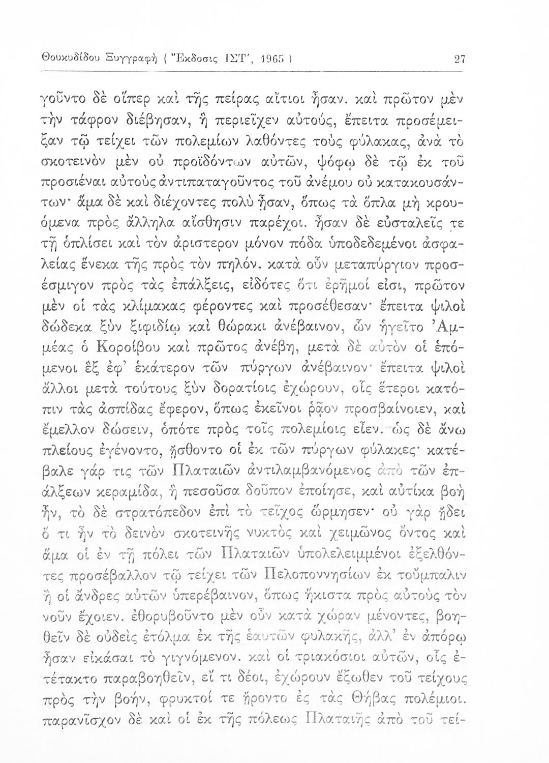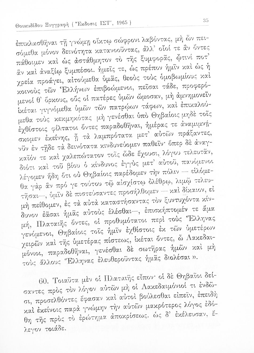Σχολικό εγχειρίδιο Αρχαίων Ελληνικών Δ΄ Γυμνασίου που περιέχει εισαγωγή στη ζωή και το έργο του Θουκυδίδη, αποσπάσματα από τα Πλαταιϊκά, τα Λεσβιακά και τον Επιτάφιο του Περικλή και ερμηνευτικές σημειώσεις