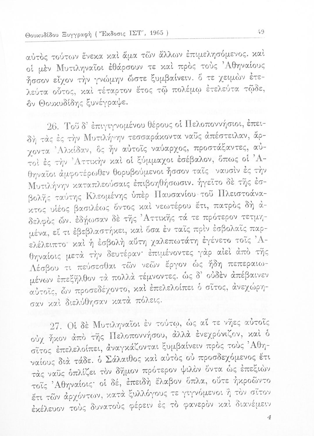 Σχολικό εγχειρίδιο Αρχαίων Ελληνικών Δ΄ Γυμνασίου που περιέχει εισαγωγή στη ζωή και το έργο του Θουκυδίδη, αποσπάσματα από τα Πλαταιϊκά, τα Λεσβιακά και τον Επιτάφιο του Περικλή και ερμηνευτικές σημειώσεις