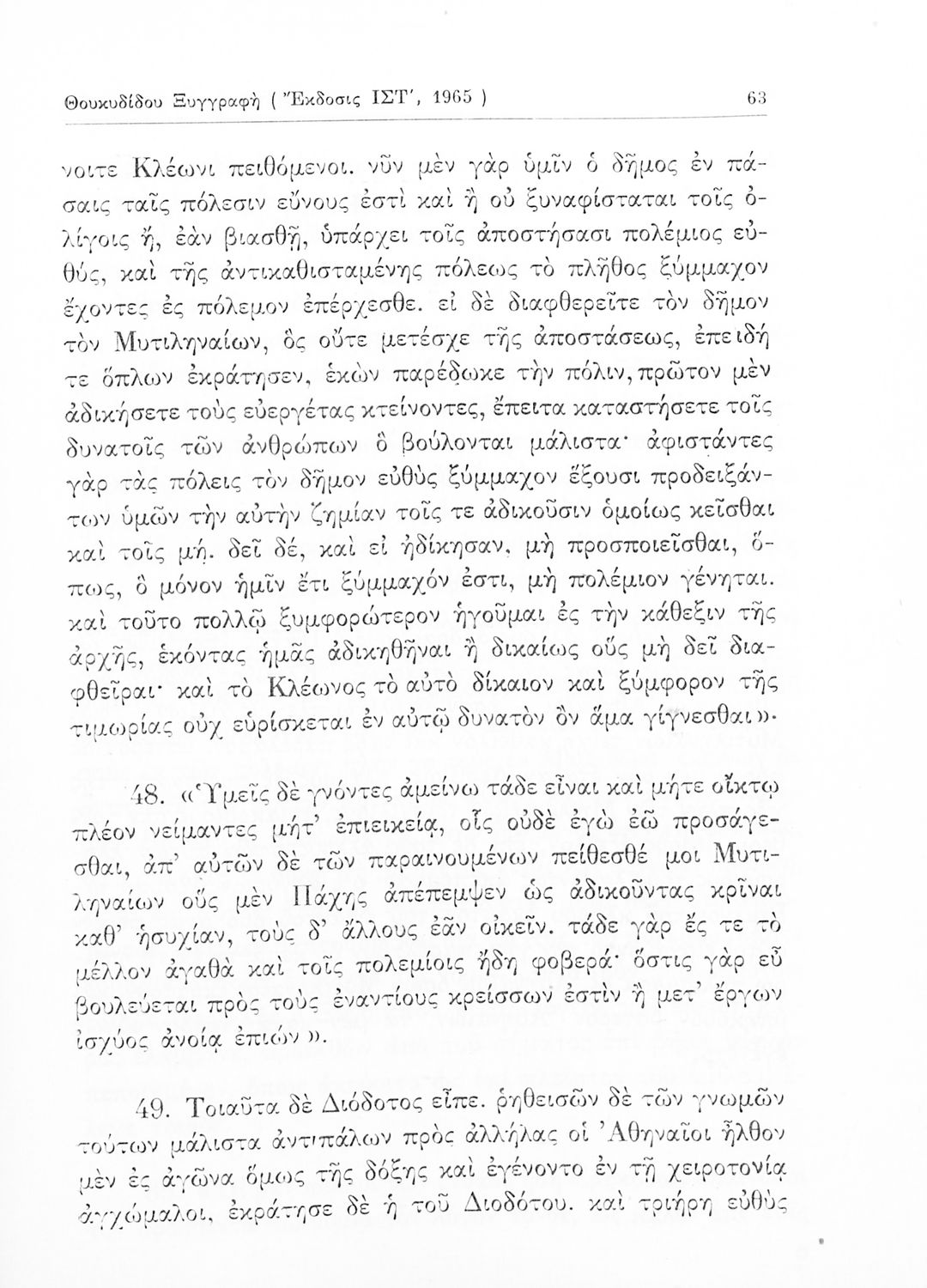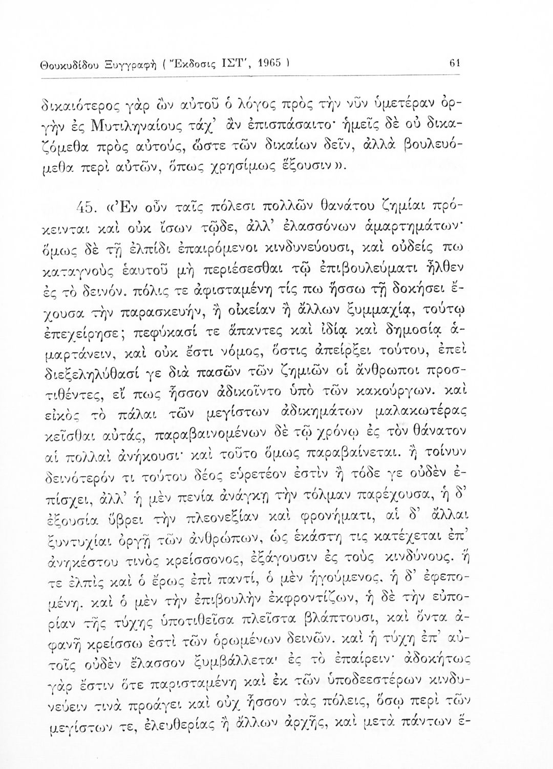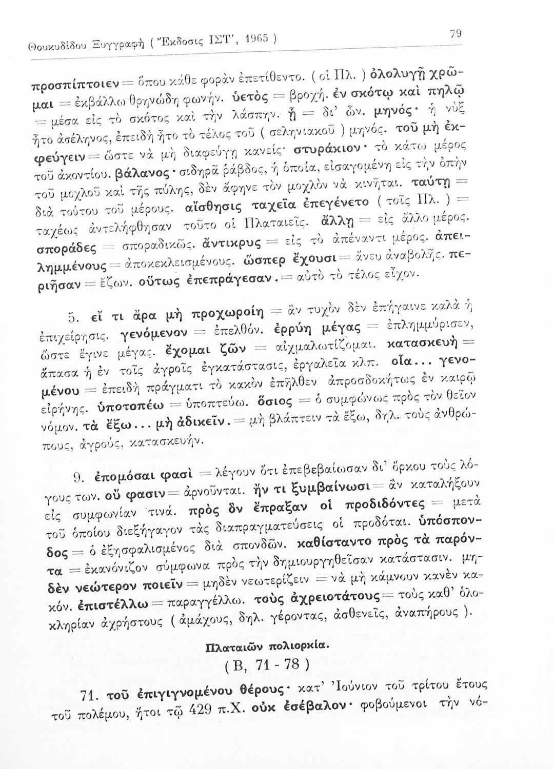 Σχολικό εγχειρίδιο Αρχαίων Ελληνικών Δ΄ Γυμνασίου που περιέχει εισαγωγή στη ζωή και το έργο του Θουκυδίδη, αποσπάσματα από τα Πλαταιϊκά, τα Λεσβιακά και τον Επιτάφιο του Περικλή και ερμηνευτικές σημειώσεις
