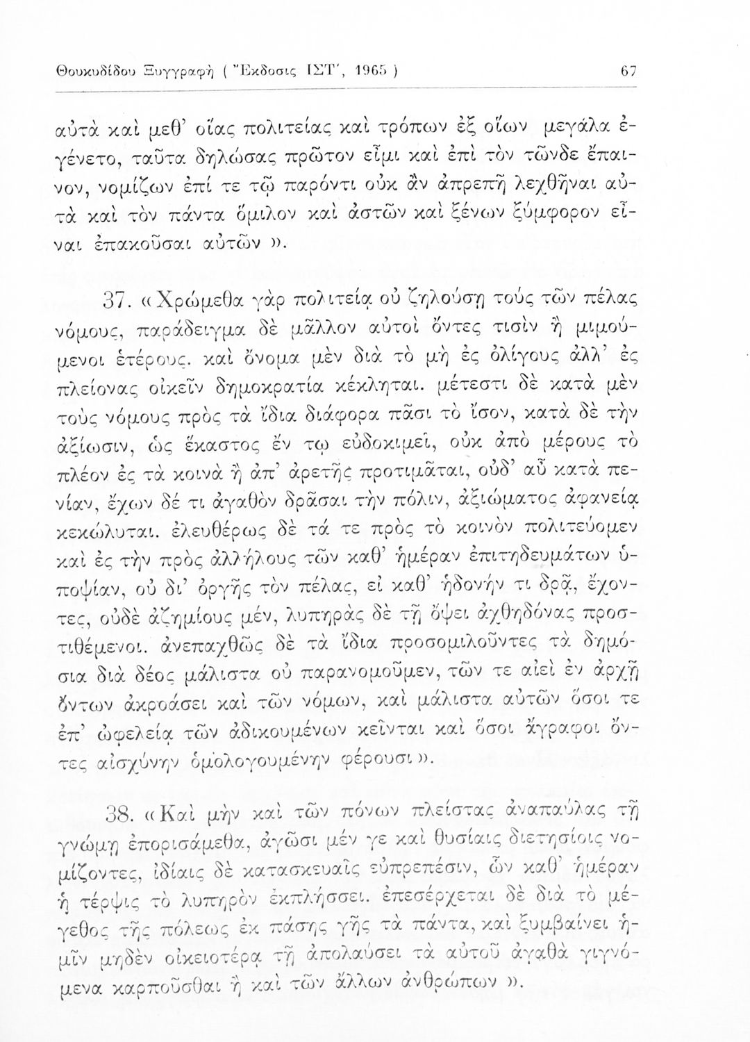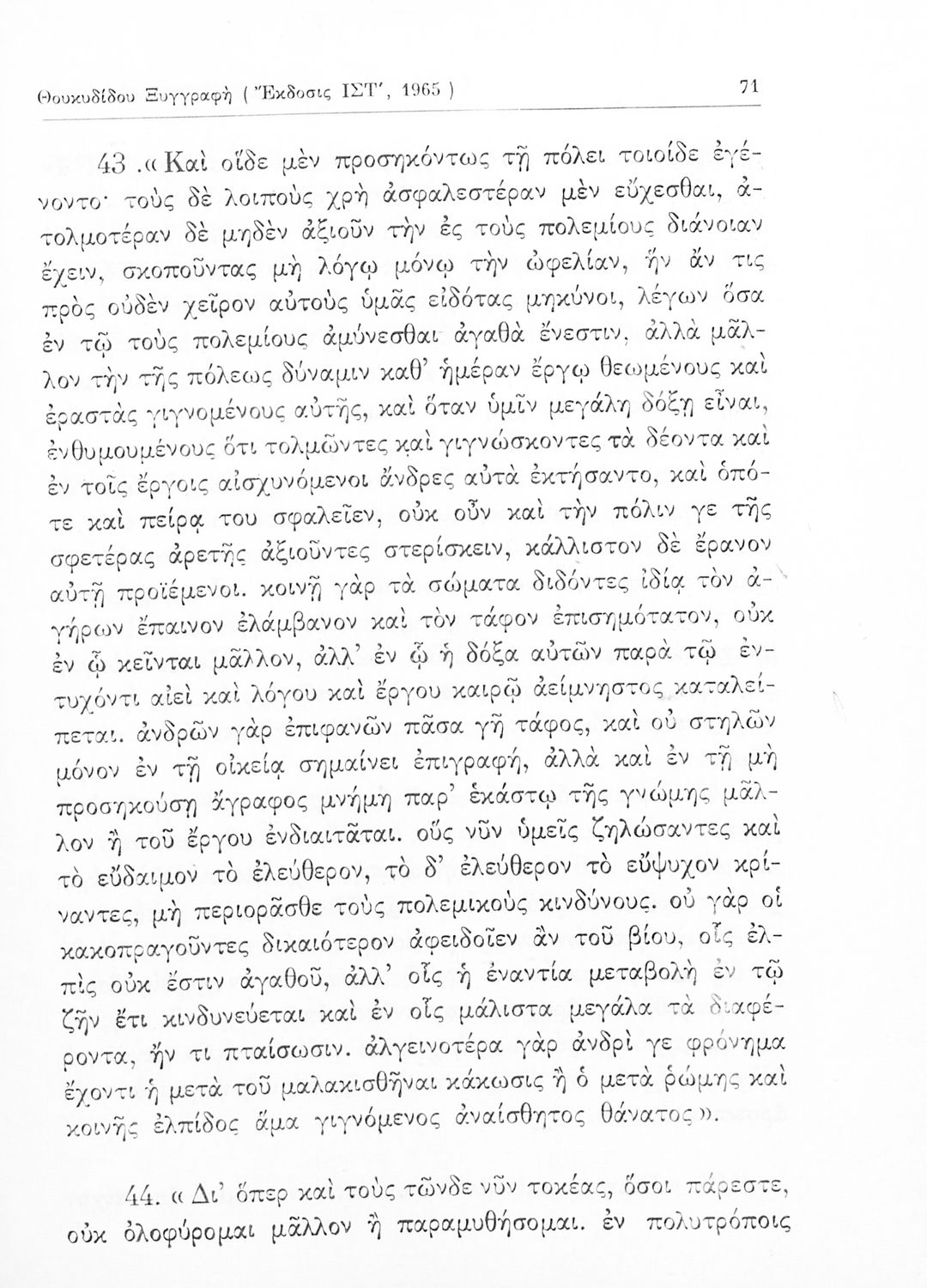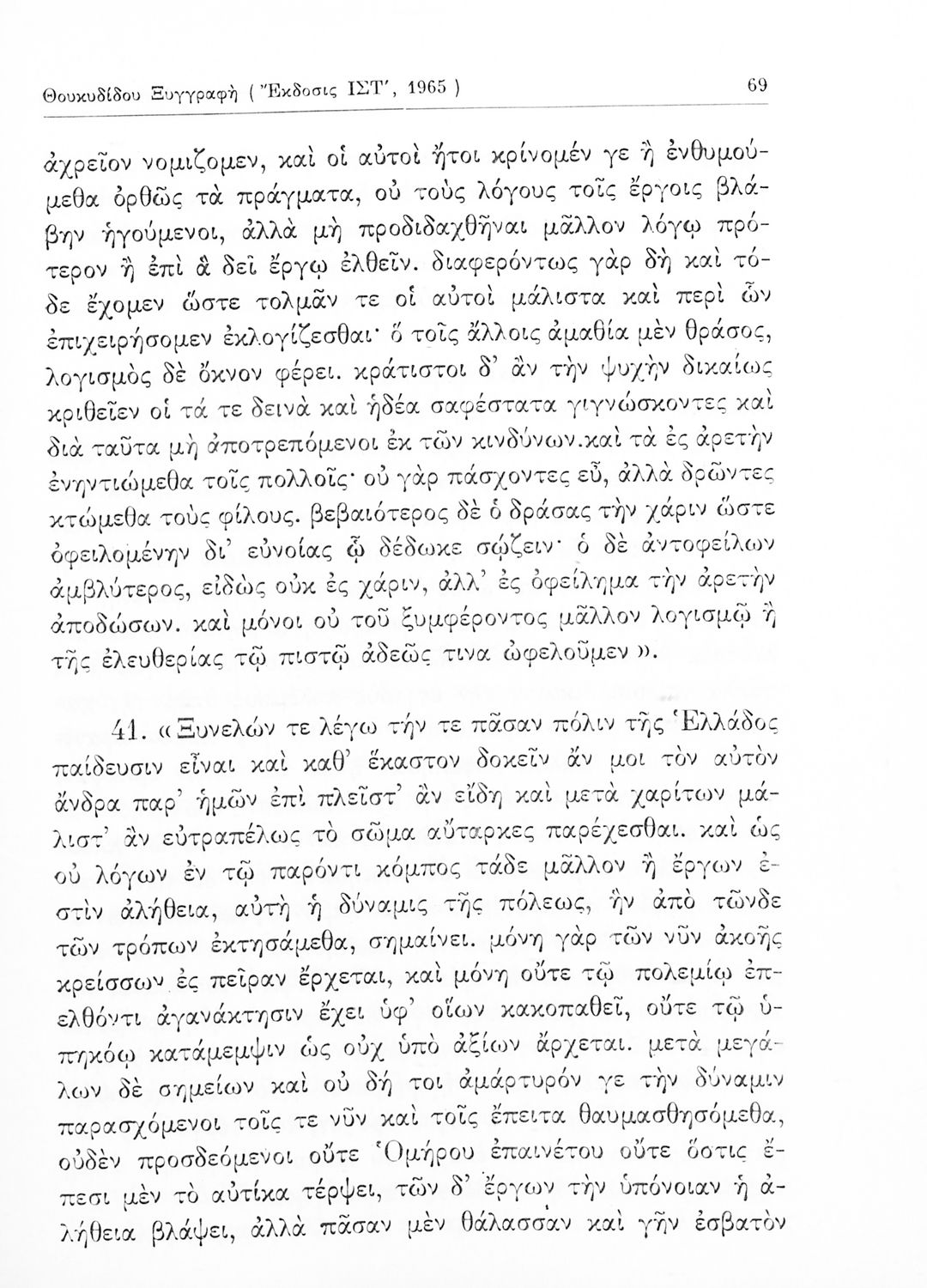Βαθμίδα εκπαίδευσης: Δευτεροβάθμια Τάξη: Δ' Γυμνασίου Μάθημα: Αρχαία Ελληνικά Γλώσσα: Καθαρεύουσα Παρουσίαση περιεχομένου: Σχολικό εγχειρίδιο Αρχαίων Ελληνικών Δ΄ Γυμνασίου που περιέχει εισαγωγή στη ζωή και το έργο του Θουκυδίδη, αποσπάσματα από τα Πλαταιϊκά, τα Λεσβιακά και τον Επιτάφιο του Περικλή και ερμηνευτικές σημειώσεις |