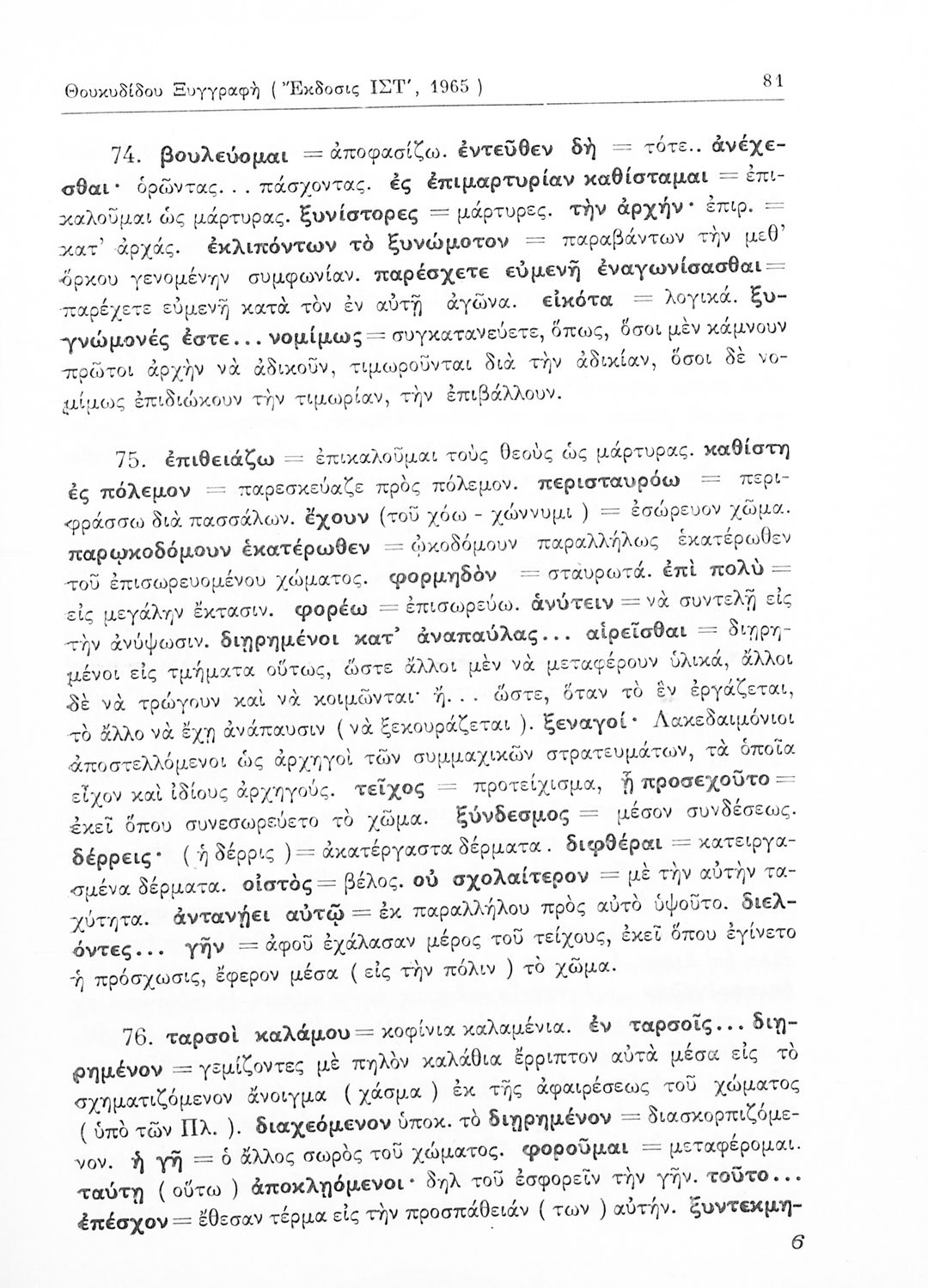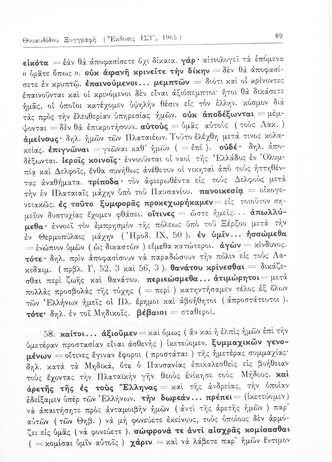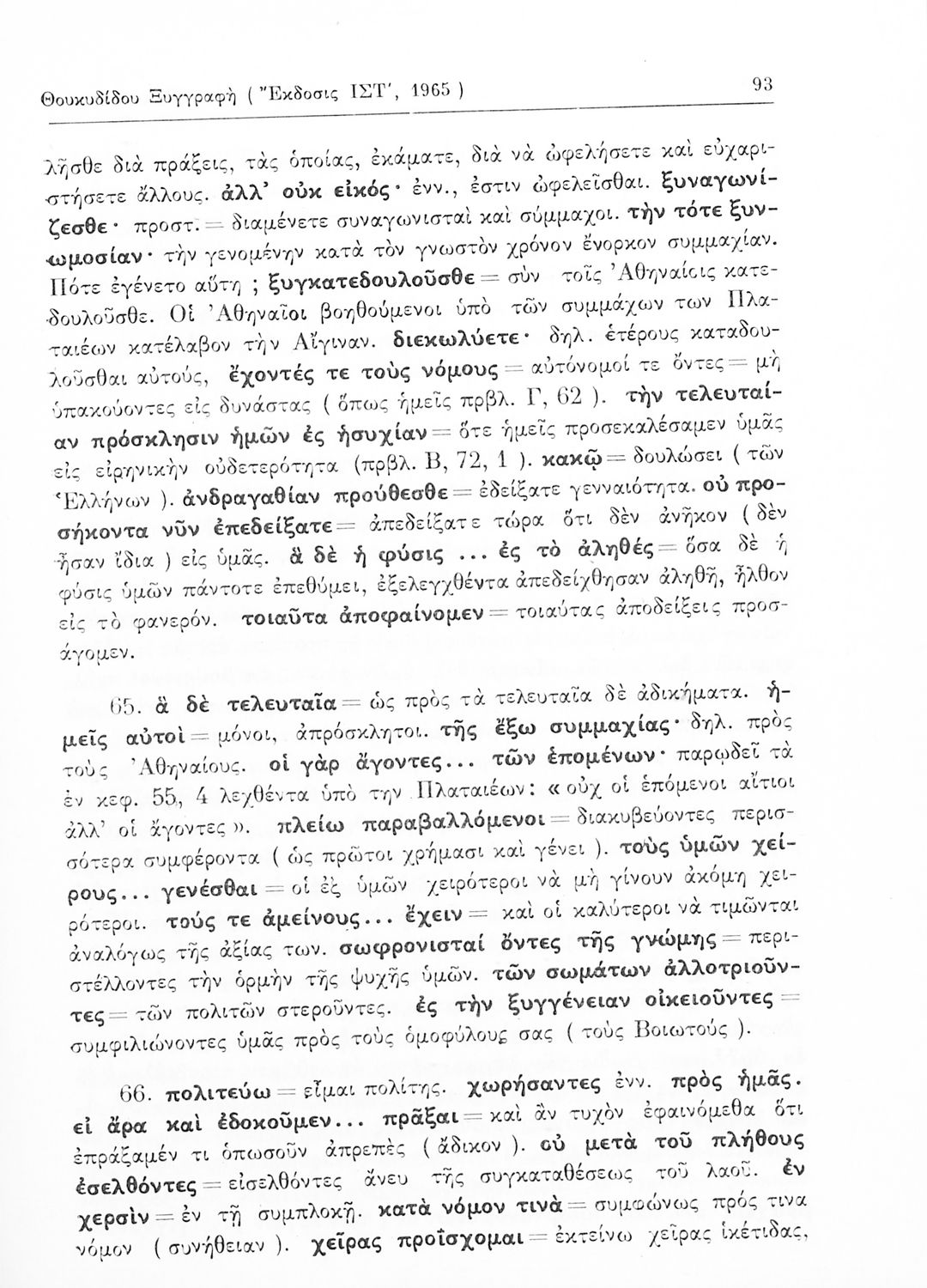 Βαθμίδα εκπαίδευσης: Δευτεροβάθμια Τάξη: Δ' Γυμνασίου Μάθημα: Αρχαία Ελληνικά Γλώσσα: Καθαρεύουσα Παρουσίαση περιεχομένου: Σχολικό εγχειρίδιο Αρχαίων Ελληνικών Δ΄ Γυμνασίου που περιέχει εισαγωγή στη ζωή και το έργο του Θουκυδίδη, αποσπάσματα από τα Πλαταιϊκά, τα Λεσβιακά και τον Επιτάφιο του Περικλή και ερμηνευτικές σημειώσεις |