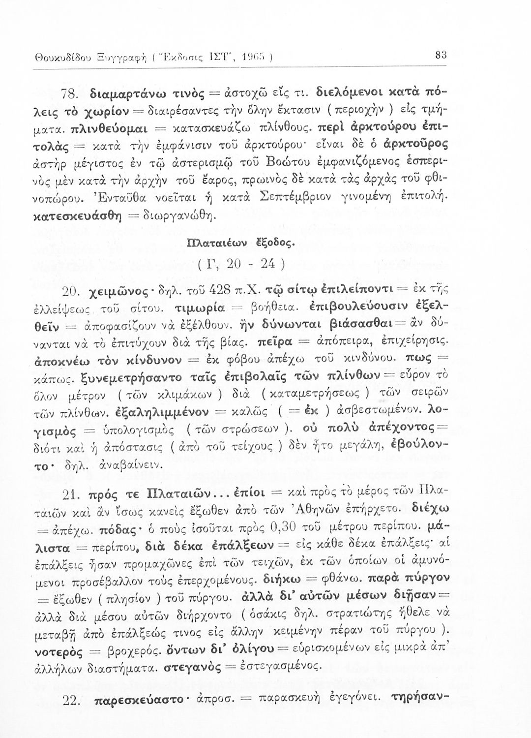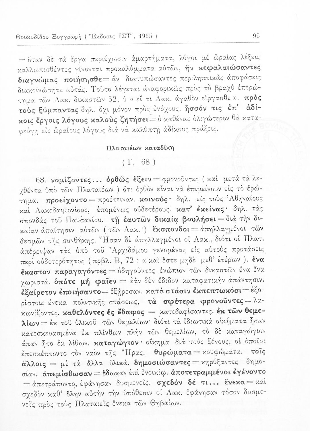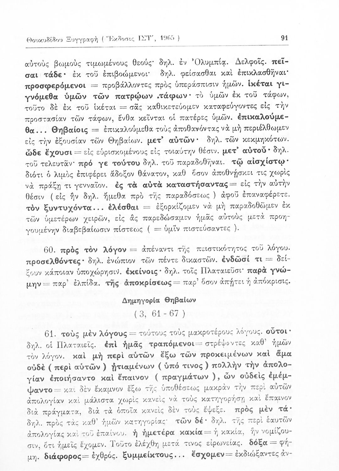 Σχολικό εγχειρίδιο Αρχαίων Ελληνικών Δ΄ Γυμνασίου που περιέχει εισαγωγή στη ζωή και το έργο του Θουκυδίδη, αποσπάσματα από τα Πλαταιϊκά, τα Λεσβιακά και τον Επιτάφιο του Περικλή και ερμηνευτικές σημειώσεις