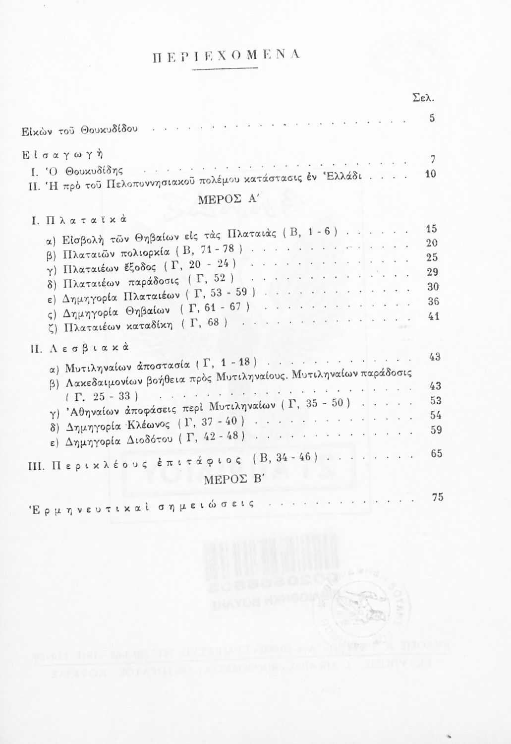 Σχολικό εγχειρίδιο Αρχαίων Ελληνικών Δ΄, Ε΄ και ΣΤ΄ Γυμνασίου που περιέχει εισαγωγή στη ζωή και το έργο του Θουκυδίδη, αποσπάσματα από τα Πλαταιϊκά, τα Λεσβιακά και τον Επιτάφιο του Περικλή και ερμηνευτικές σημειώσεις. Φέρει το σύμβολο της δικτατορίας.