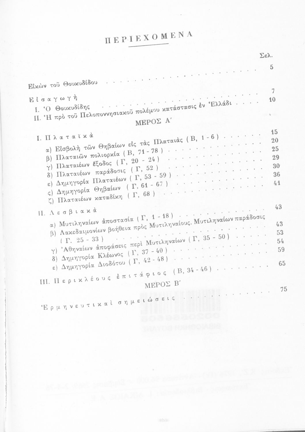 Σχολικό εγχειρίδιο Αρχαίων Ελληνικών για τις Δ΄, Ε΄ και ΣΤ΄ Γυμνασίου παλαιού τύπου που περιλαμβάνει σύντομο βιογραφικό σημείωμα του Θουκυδίδη, περιγραφή του ιστορικού πλαισίου, αποσπάσματα από τα Πλαταϊκά, τα
