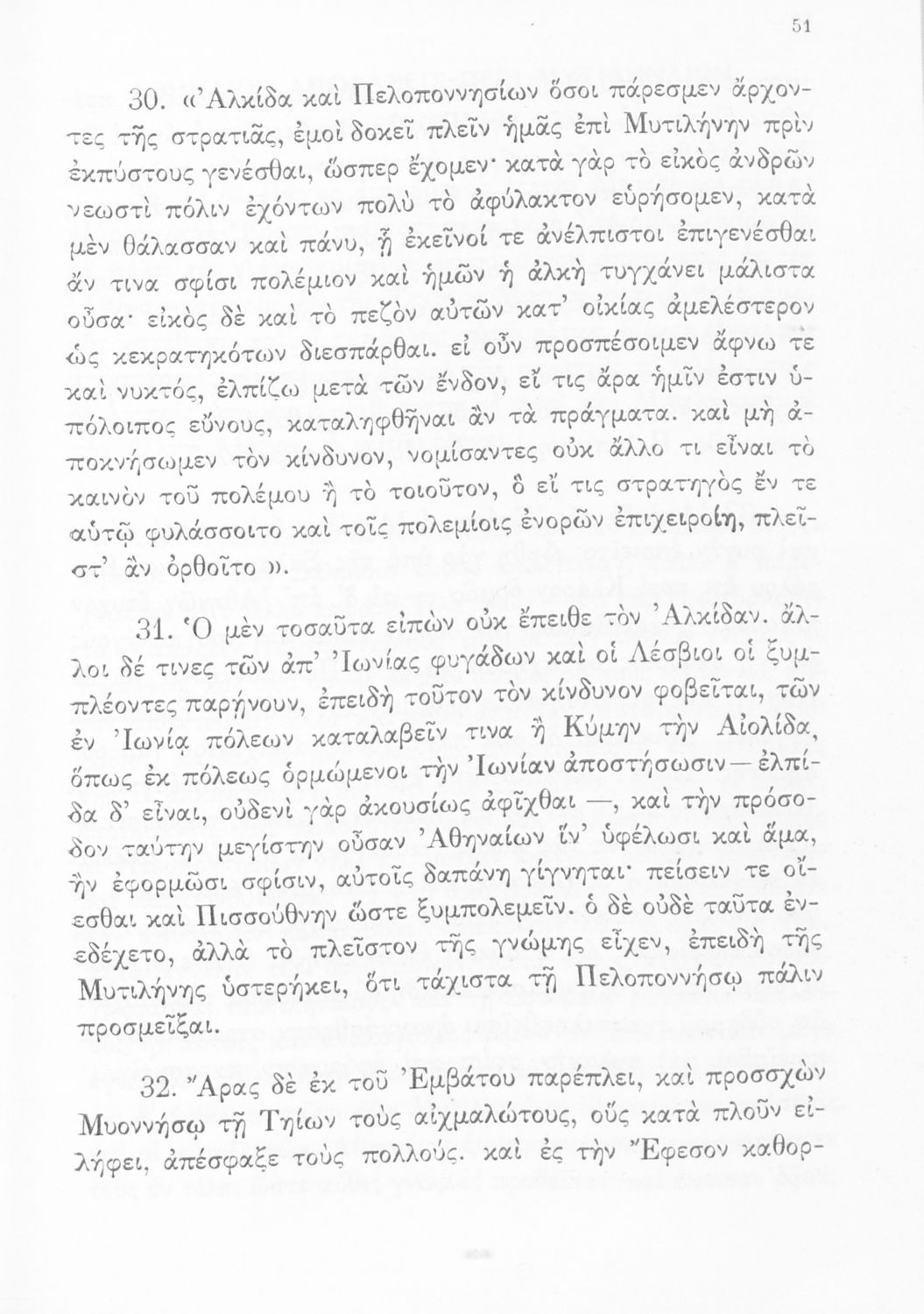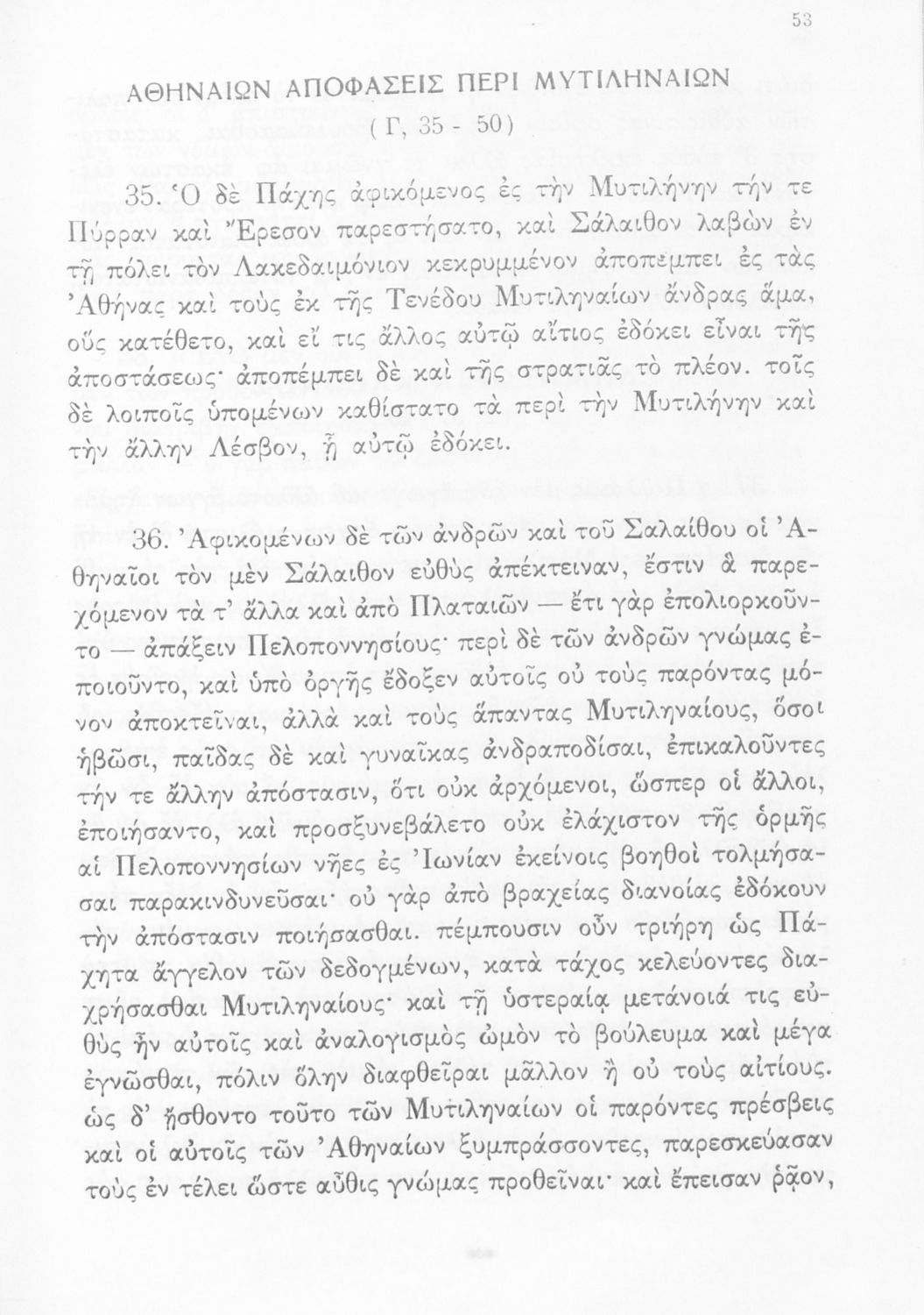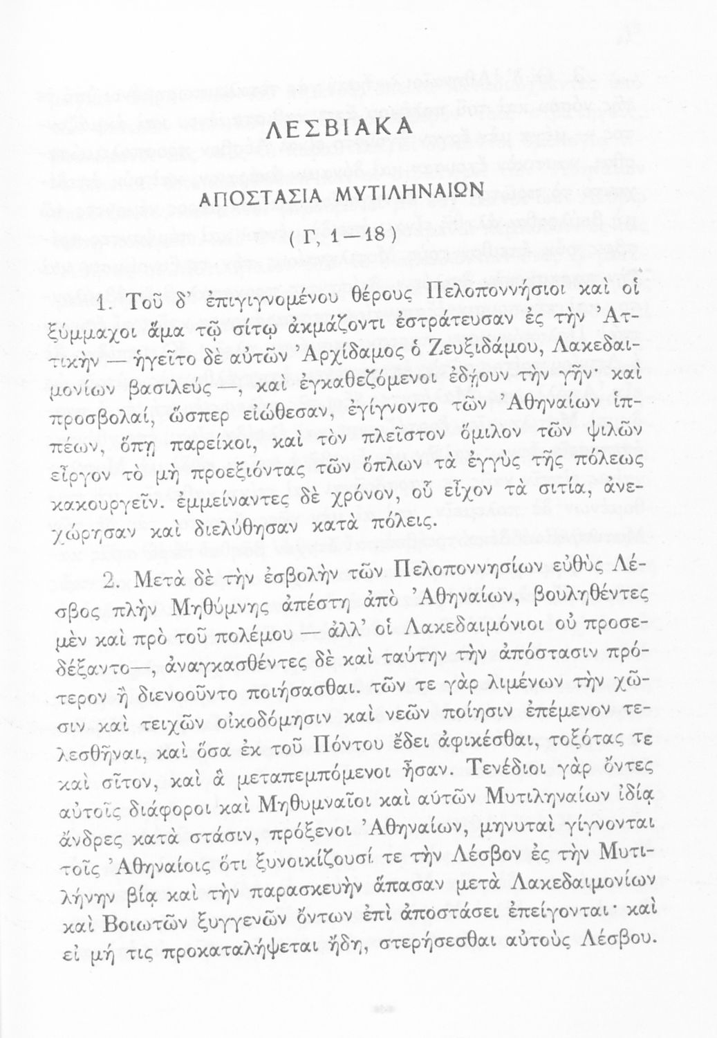Σχολικό εγχειρίδιο Αρχαίων Ελληνικών Γυμνασίου που περιέχει εισαγωγή στη ζωή και το έργο του Θουκυδίδη, αποσπάσματα από τα Πλαταιϊκά, τα Λεσβιακά και τον Επιτάφιο του Περικλή και ερμηνευτικές σημειώσεις.