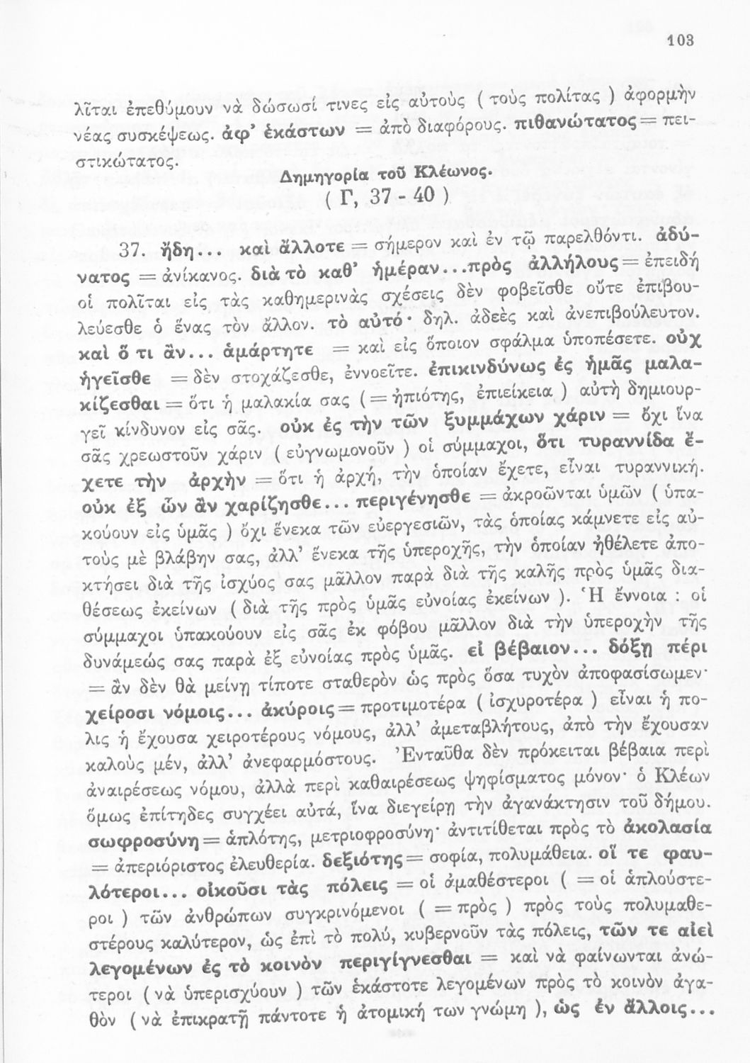 Βαθμίδα εκπαίδευσης: Δευτεροβάθμια Τάξη: Δ' Γυμνασίου / Ε' Γυμνασίου / ΣΤ' Γυμνασίου Μάθημα: Αρχαία Ελληνικά Γλώσσα: Απλή καθαρεύουσα Παρουσίαση περιεχομένου: Σχολικό εγχειρίδιο Αρχαίων Ελληνικών Δ΄, Ε΄ και ΣΤ΄ Γυμνασίου που περιέχει εισαγωγή στη ζωή και το έργο του Θουκυδίδη, αποσπάσματα από τα Πλαταιϊκά, τα Λεσβιακά και τον Επιτάφιο του Περικλή και ερμηνευτικές σημειώσεις. |