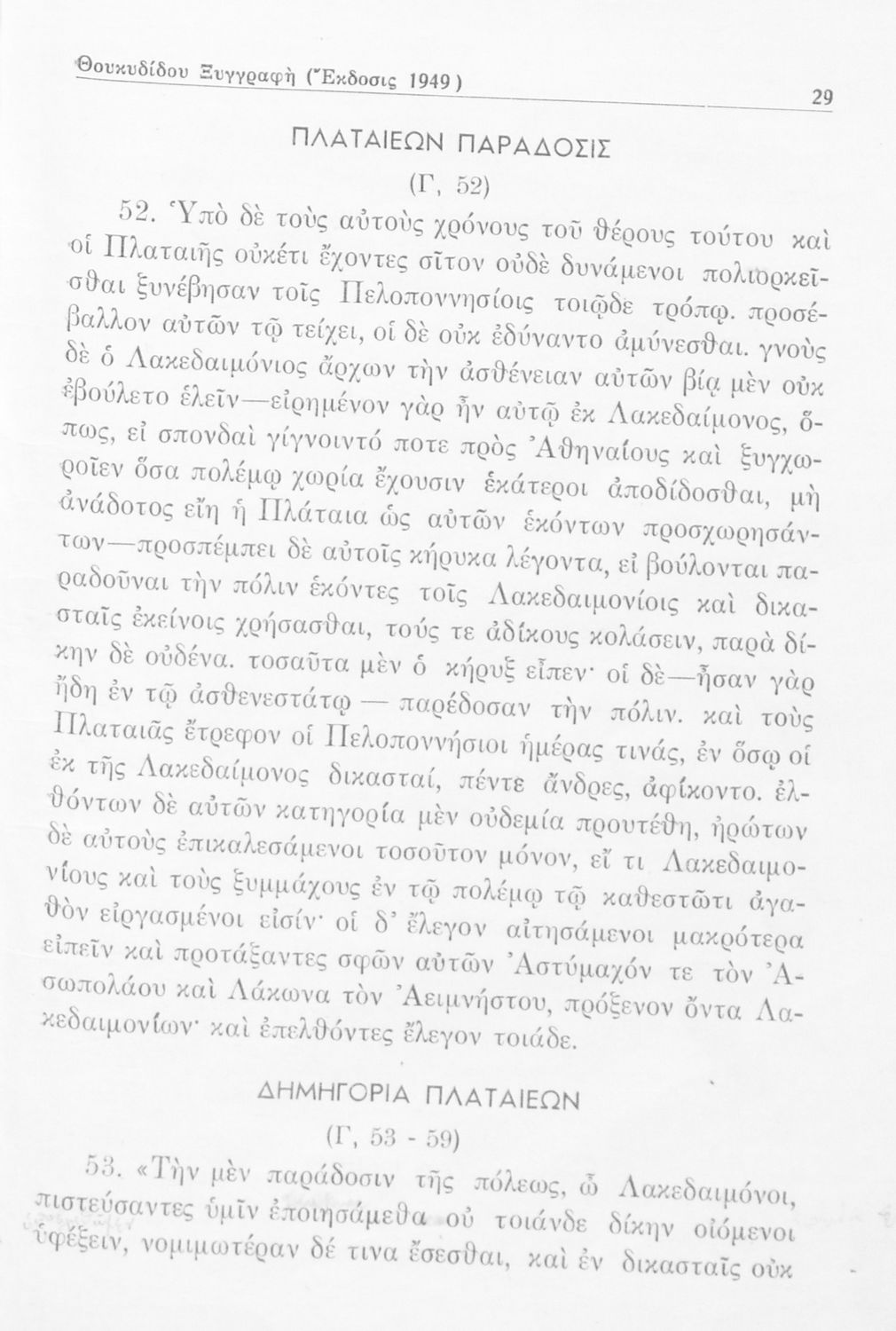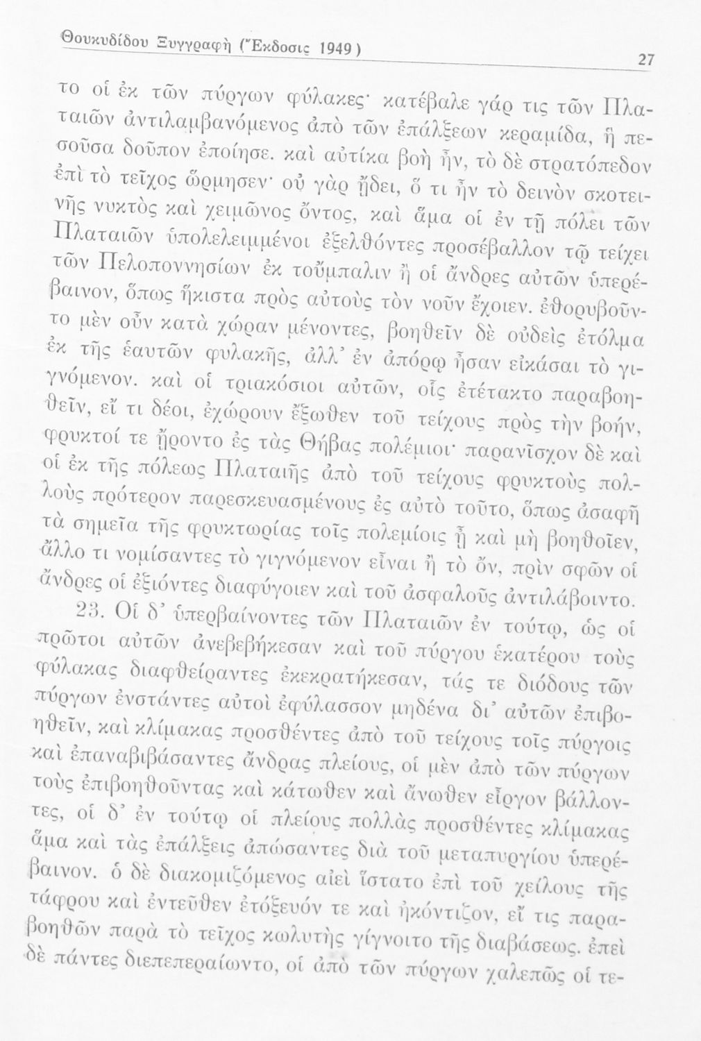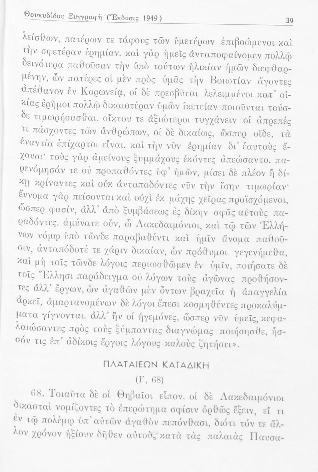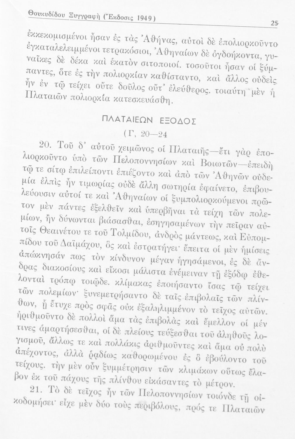 Σχολικό εγχειρίδιο Αρχαίων Ελληνικών για τις Δ΄, Ε΄ και ΣΤ΄ Γυμνασίου παλαιού τύπου που περιλαμβάνει σύντομο βιογραφικό σημείωμα του Θουκυδίδη, περιγραφή του ιστορικού πλαισίου, αποσπάσματα από τα Πλαταϊκά, τα