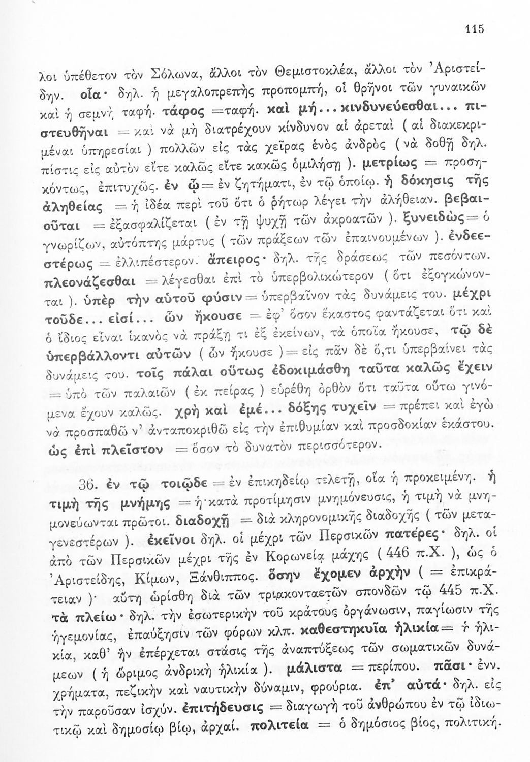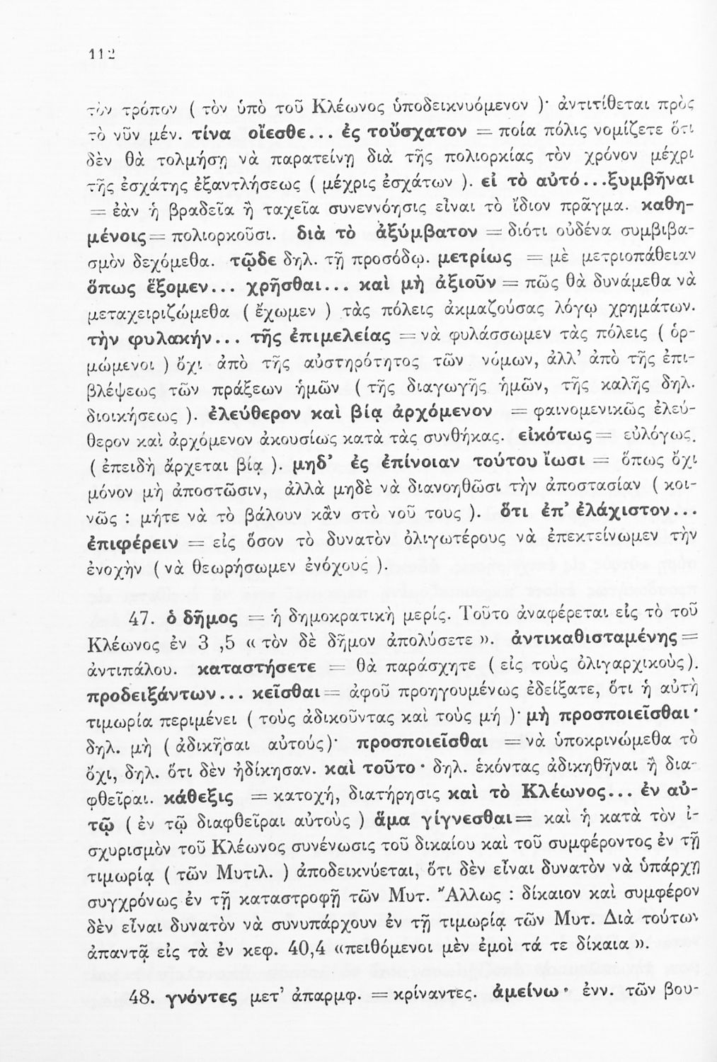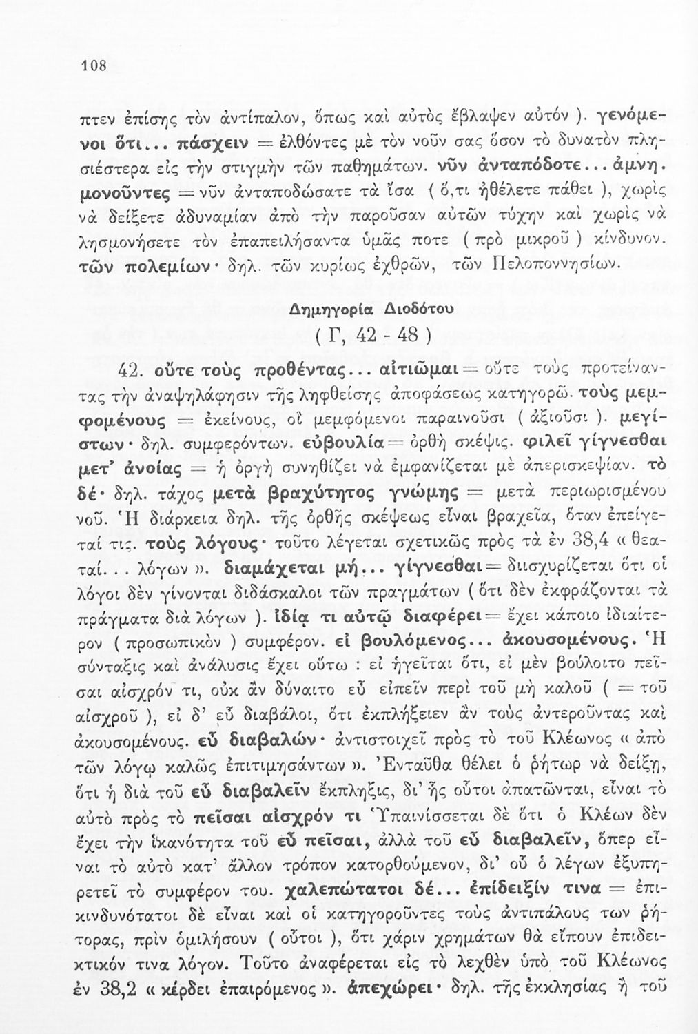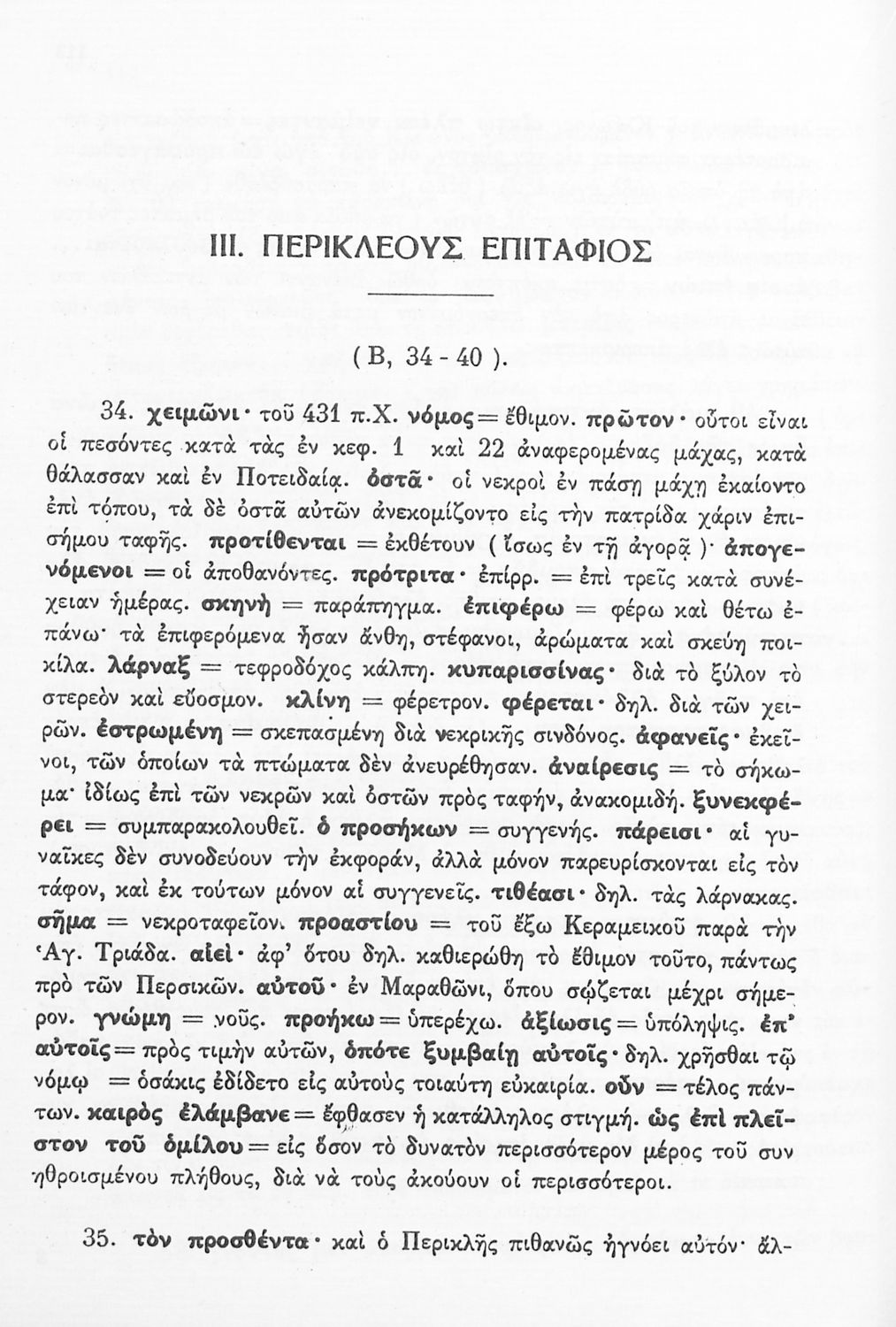 Σχολικό εγχειρίδιο Αρχαίων Ελληνικών Δ΄, Ε΄ και ΣΤ΄ Γυμνασίου που περιέχει εισαγωγή στη ζωή και το έργο του Θουκυδίδη, αποσπάσματα από τα Πλαταιϊκά, τα Λεσβιακά και τον Επιτάφιο του Περικλή και ερμηνευτικές σημειώσεις. Φέρει το σύμβολο της δικτατορίας.