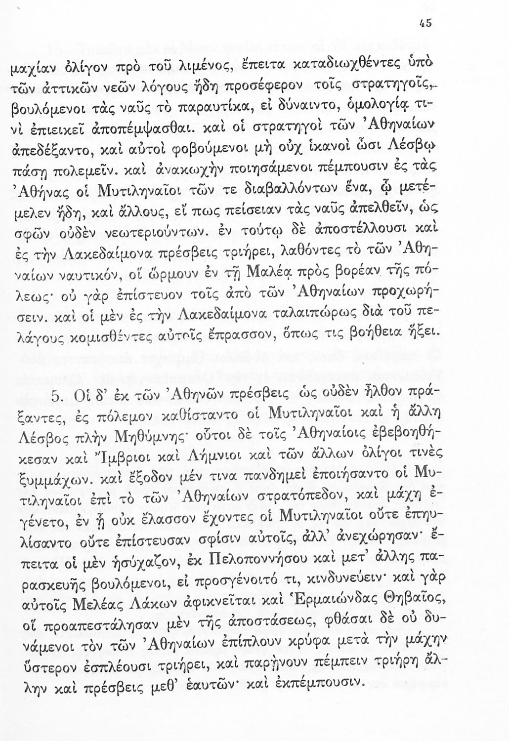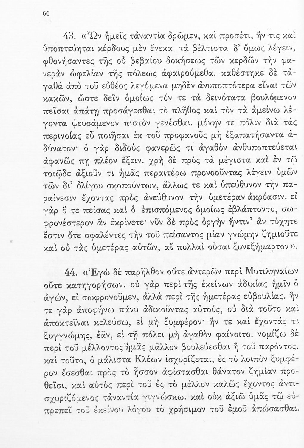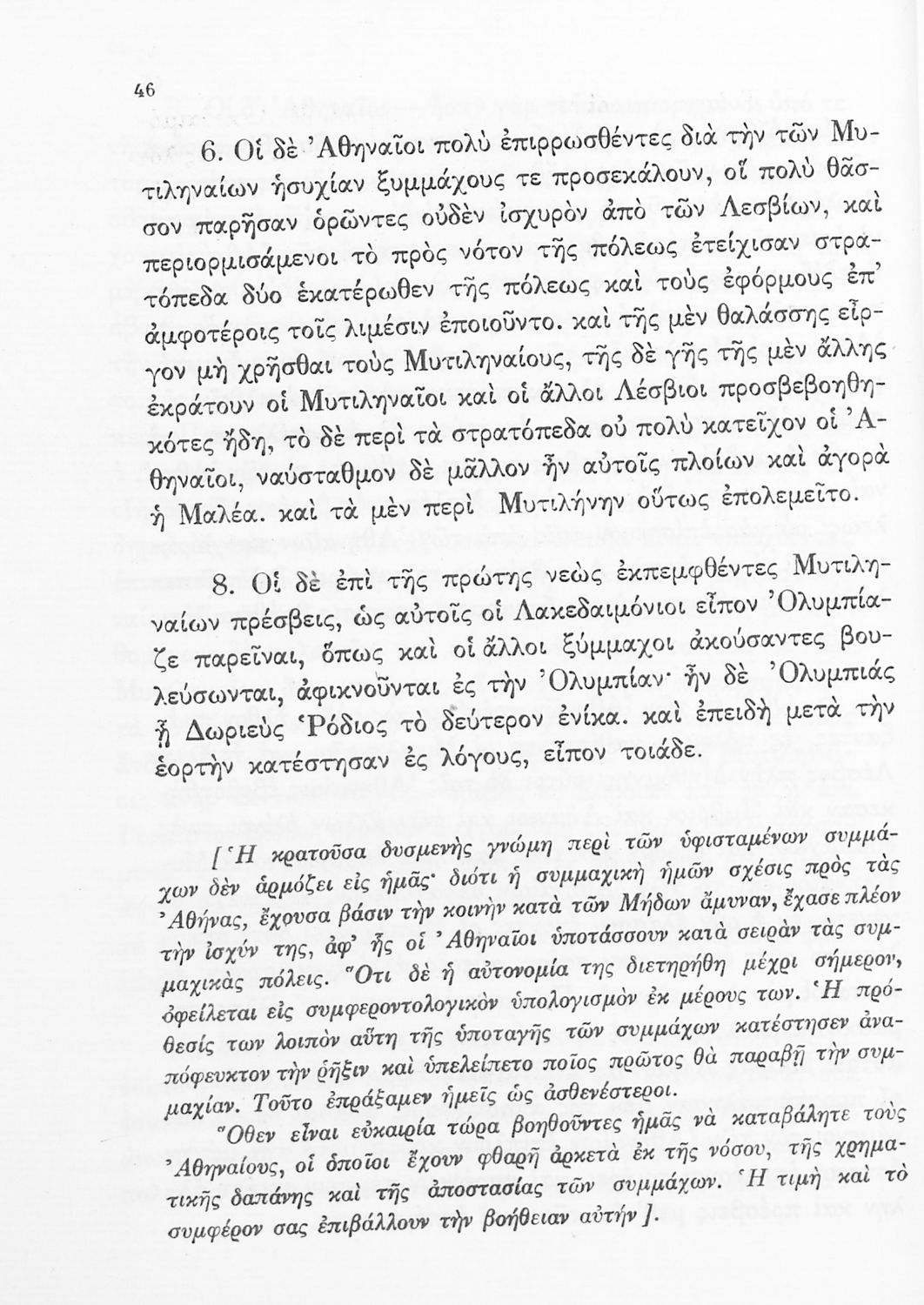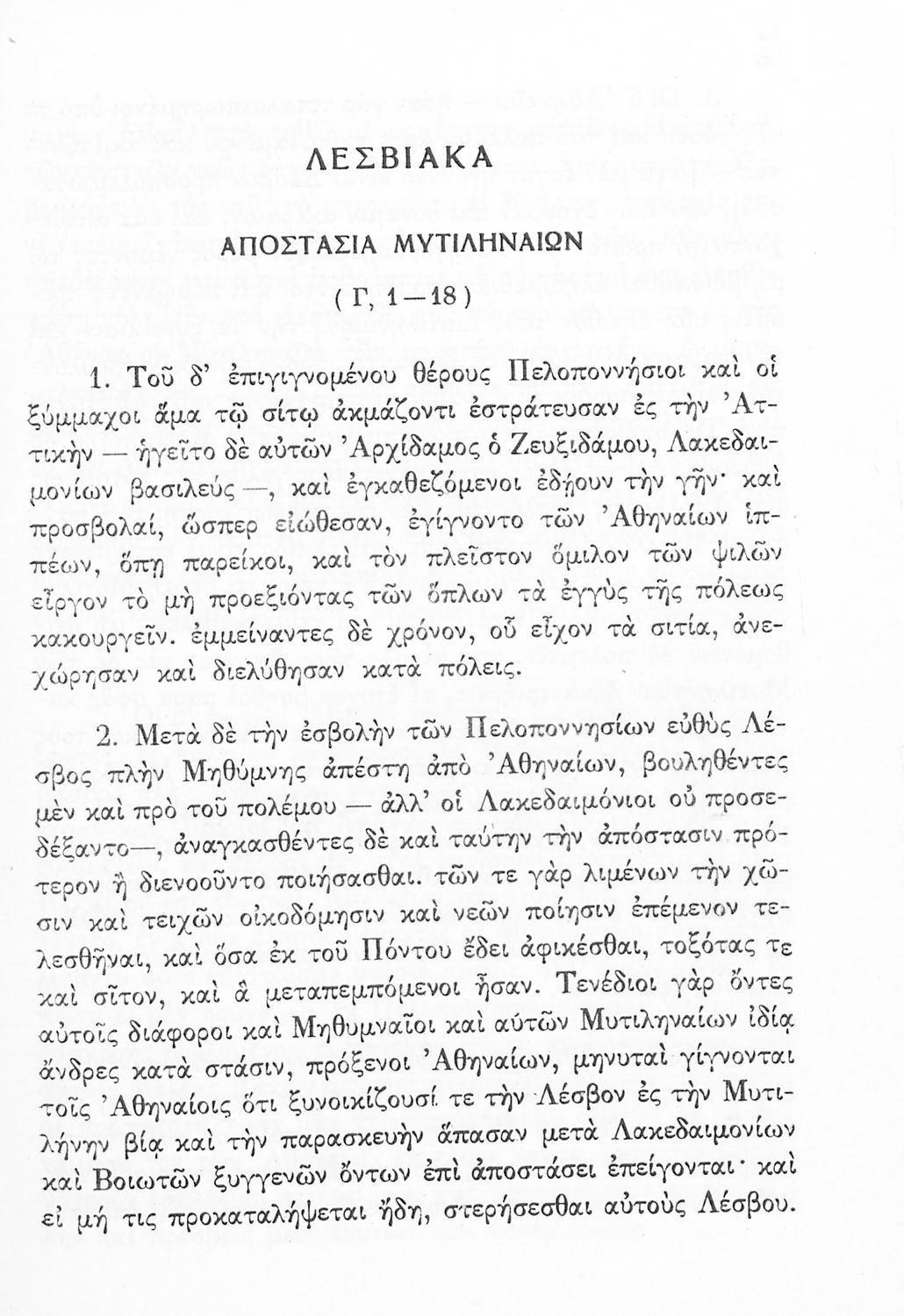 Σχολικό εγχειρίδιο Αρχαίων Ελληνικών Δ΄, Ε΄ και ΣΤ΄ Γυμνασίου που περιέχει εισαγωγή στη ζωή και το έργο του Θουκυδίδη, αποσπάσματα από τα Πλαταιϊκά, τα Λεσβιακά και τον Επιτάφιο του Περικλή και ερμηνευτικές σημειώσεις. Φέρει το σύμβολο της δικτατορίας.