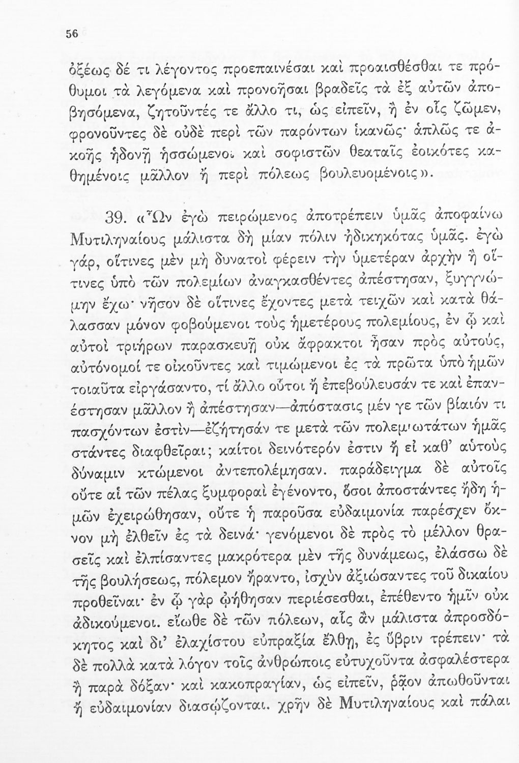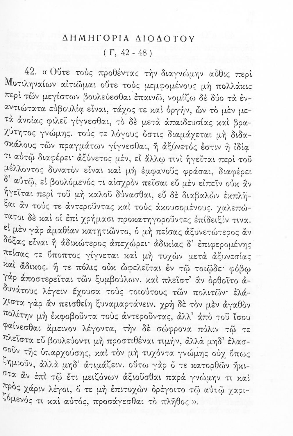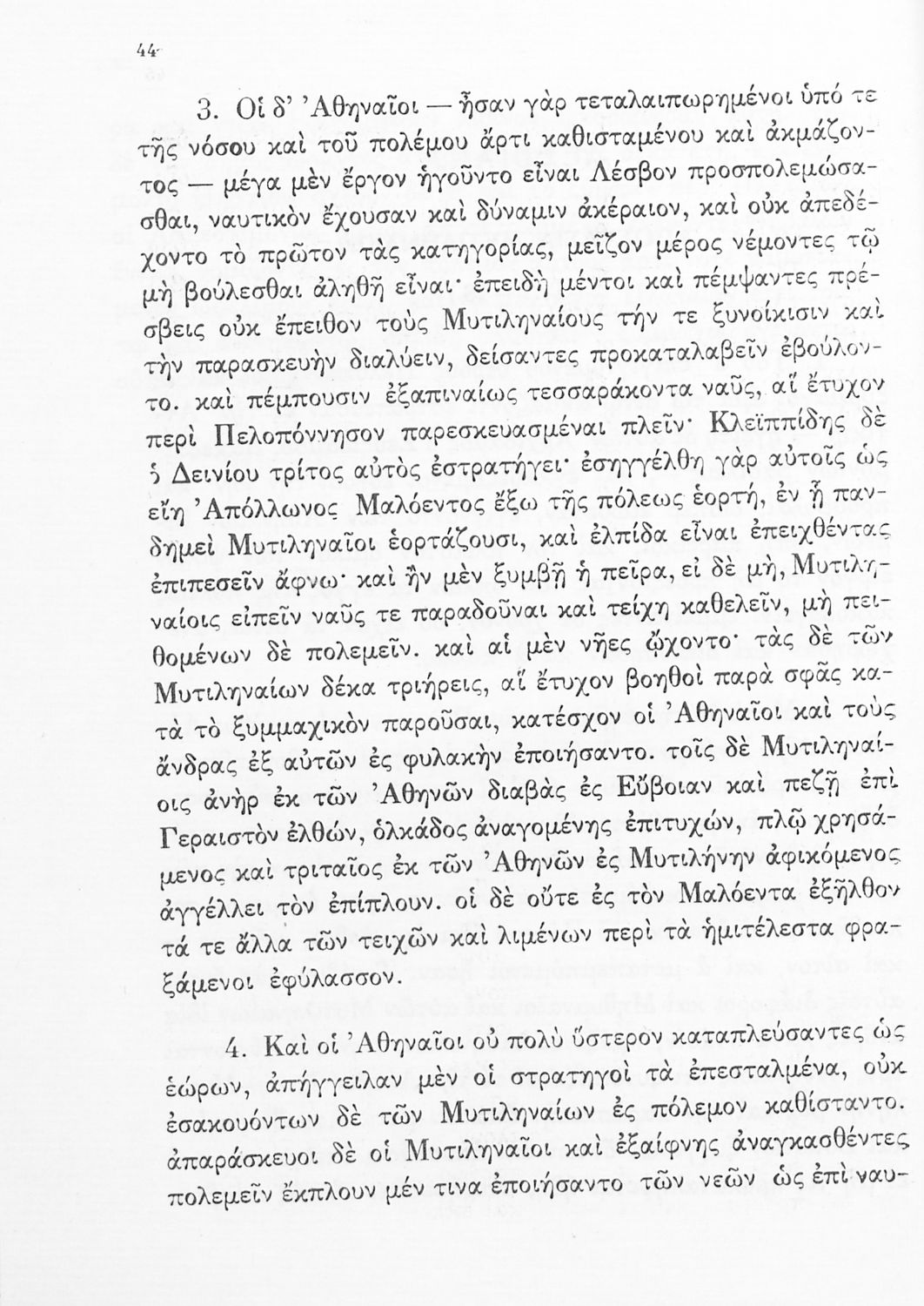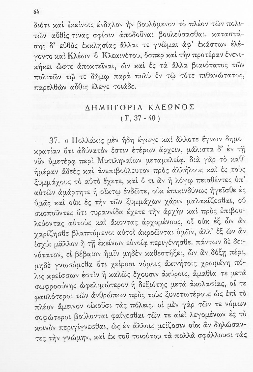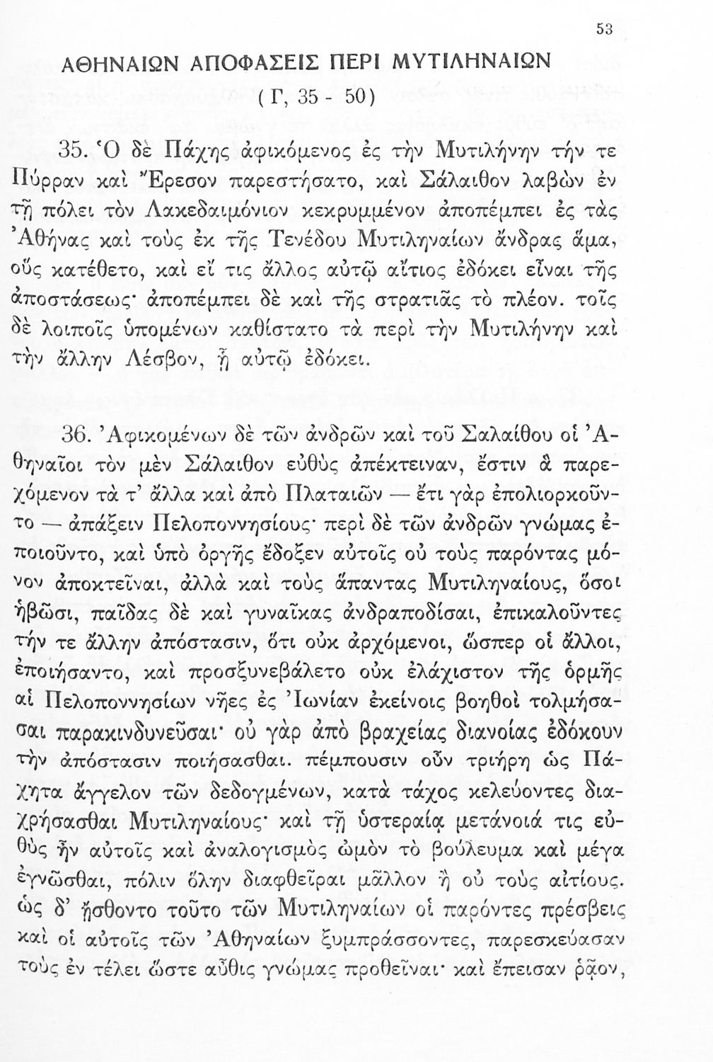 Σχολικό εγχειρίδιο Αρχαίων Ελληνικών Δ΄, Ε΄ και ΣΤ΄ Γυμνασίου που περιέχει εισαγωγή στη ζωή και το έργο του Θουκυδίδη, αποσπάσματα από τα Πλαταιϊκά, τα Λεσβιακά και τον Επιτάφιο του Περικλή και ερμηνευτικές σημειώσεις. Φέρει το σύμβολο της δικτατορίας.