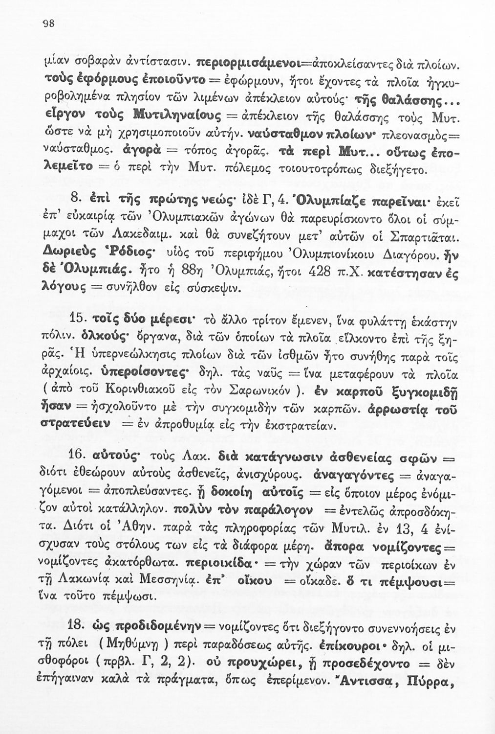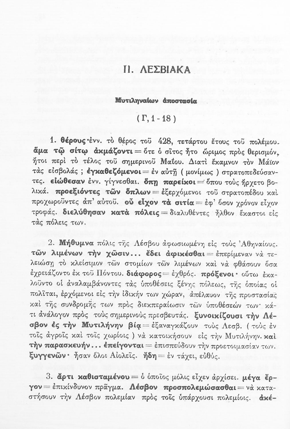 Σχολικό εγχειρίδιο Αρχαίων Ελληνικών Γυμνασίου που περιέχει εισαγωγή στη ζωή και το έργο του Θουκυδίδη, αποσπάσματα από τα Πλαταιϊκά, τα Λεσβιακά και τον Επιτάφιο του Περικλή και ερμηνευτικές σημειώσεις.