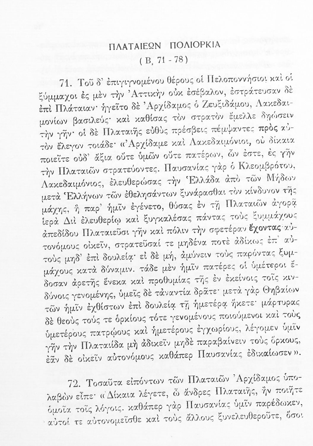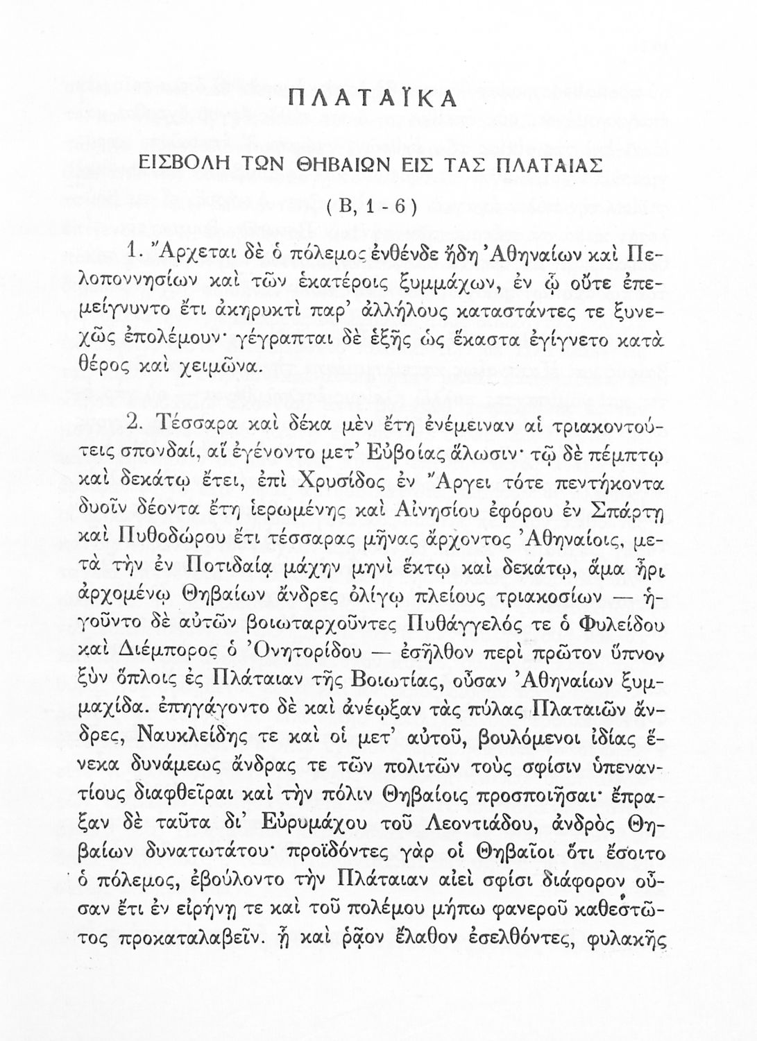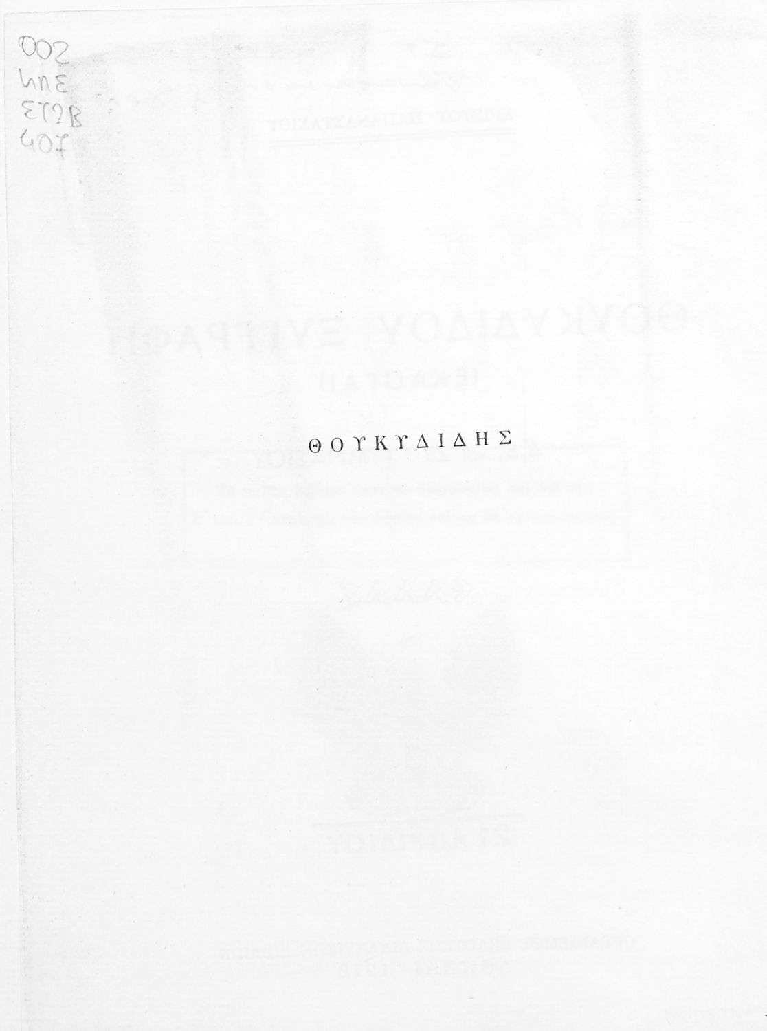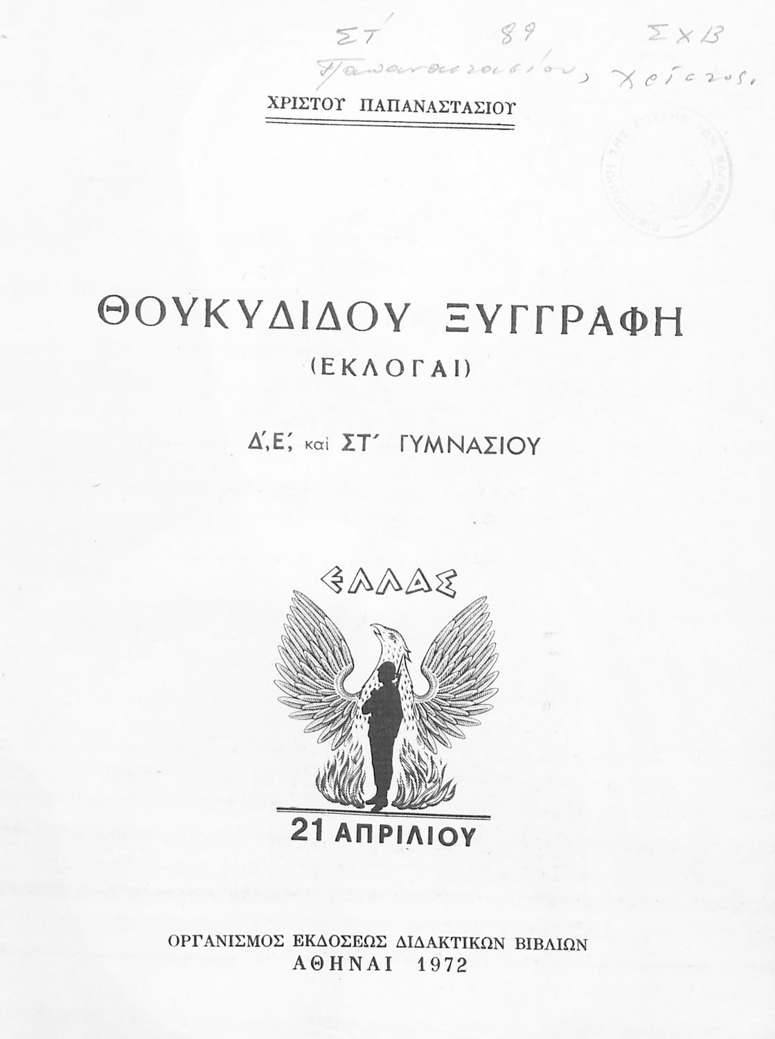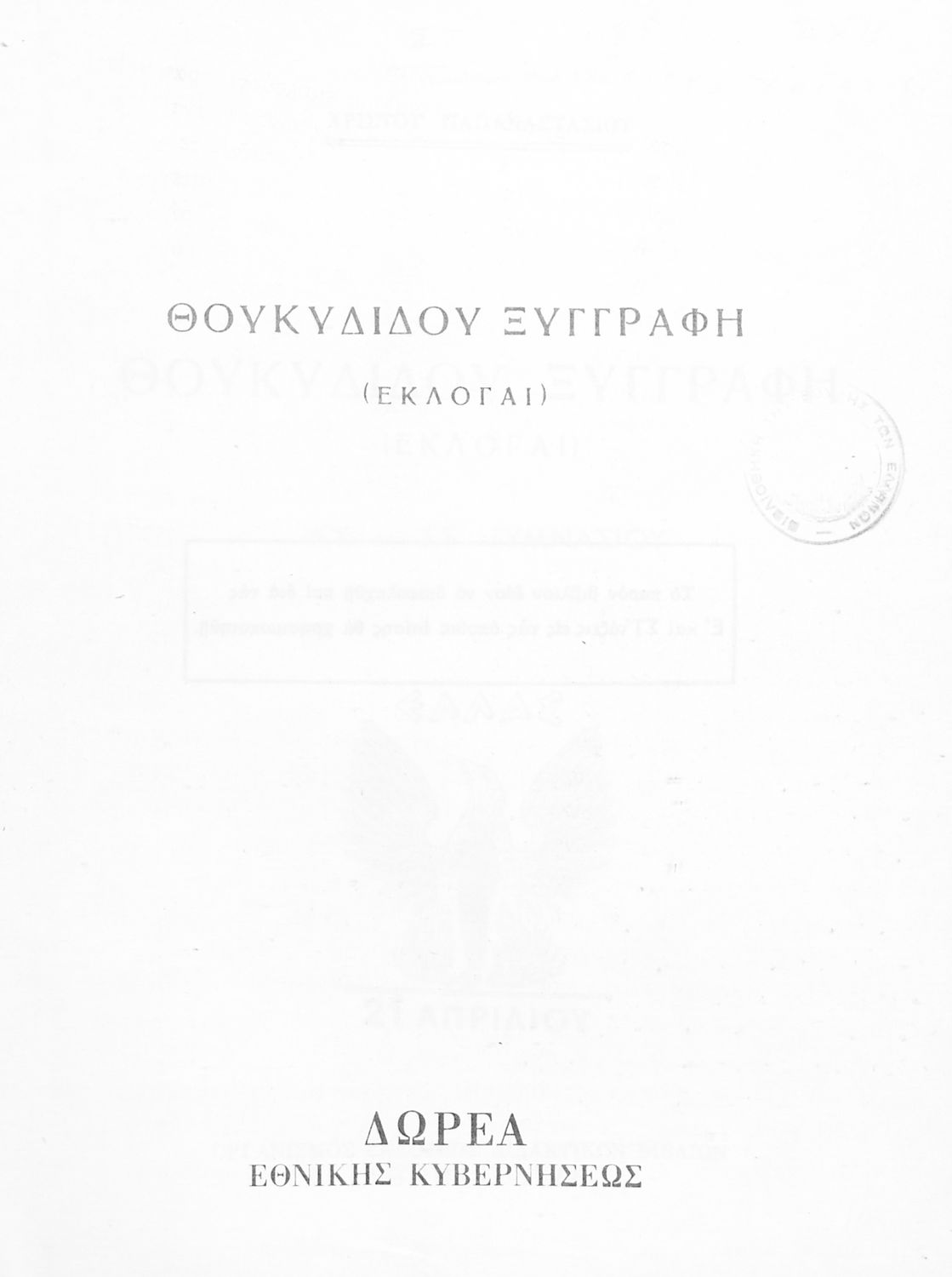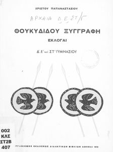 Σχολικό εγχειρίδιο Αρχαίων Ελληνικών Δ΄, Ε΄ και ΣΤ΄ Γυμνασίου που περιέχει εισαγωγή στη ζωή και το έργο του Θουκυδίδη, αποσπάσματα από τα Πλαταιϊκά, τα Λεσβιακά και τον Επιτάφιο του Περικλή και ερμηνευτικές σημειώσεις. Φέρει το σύμβολο της δικτατορίας.