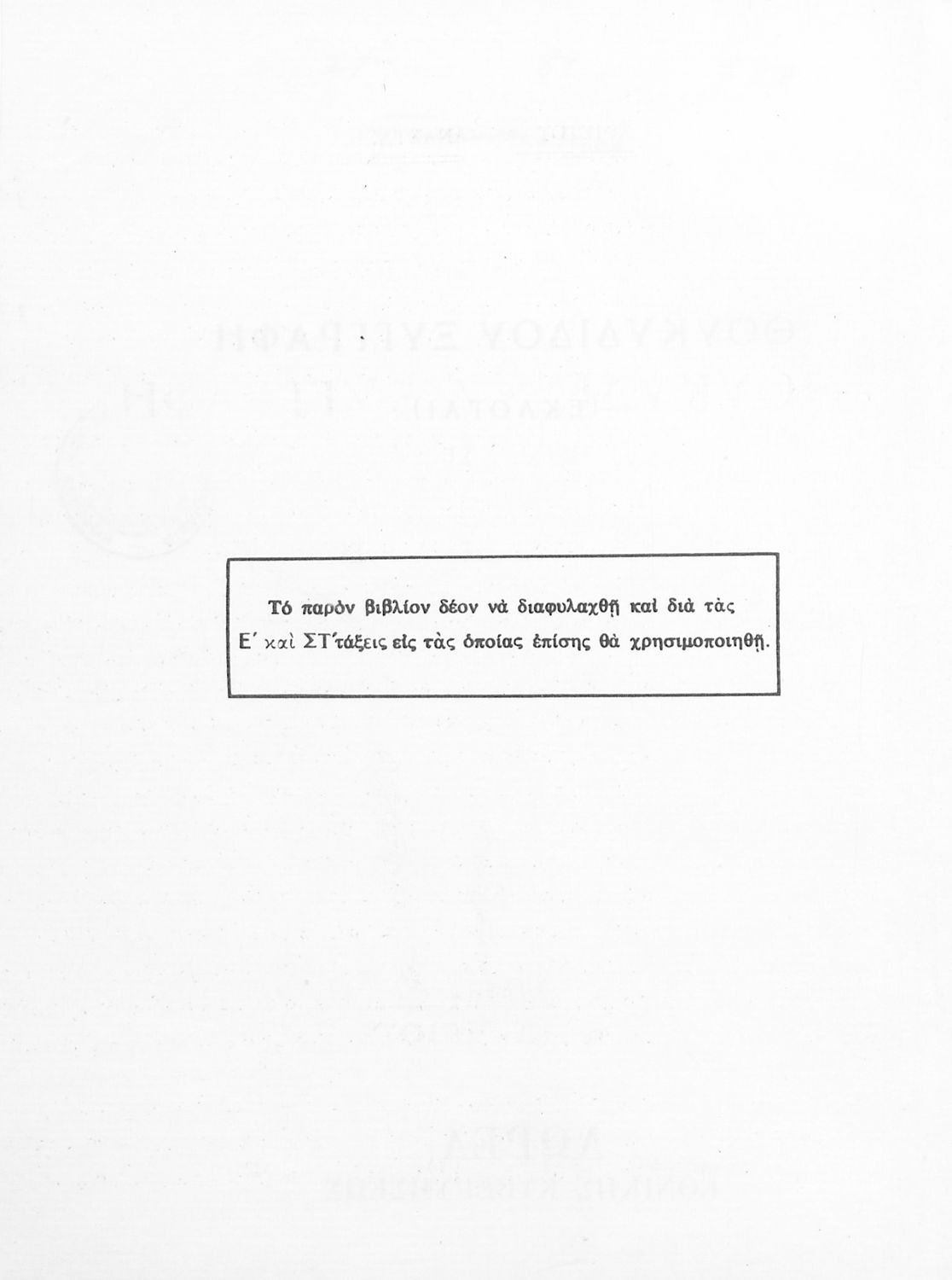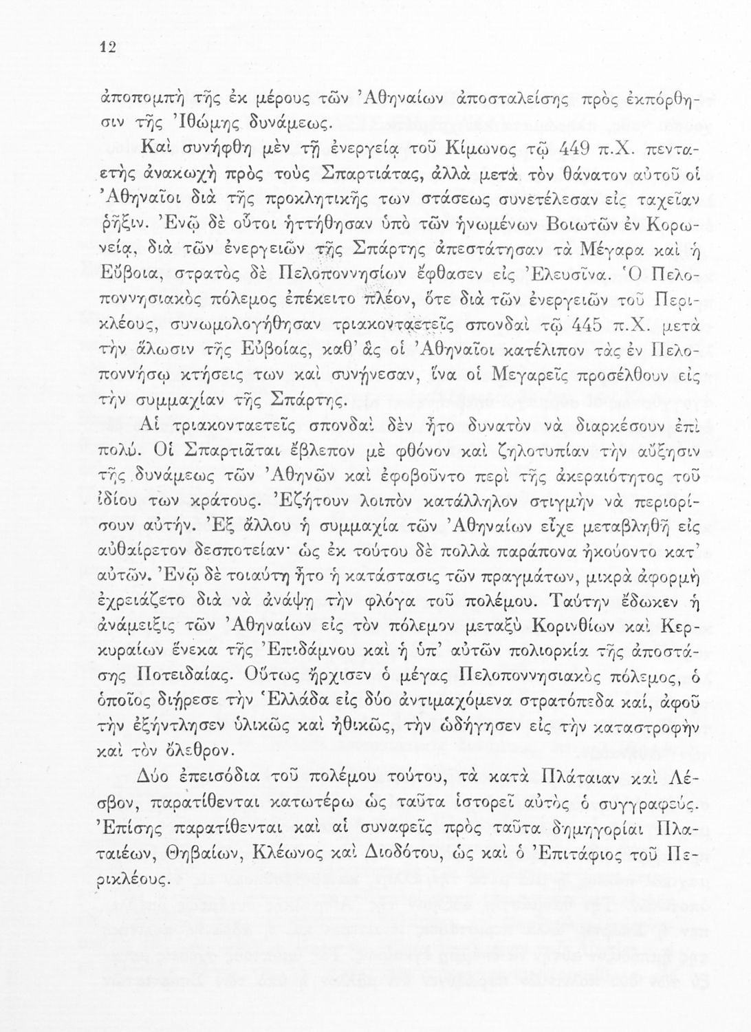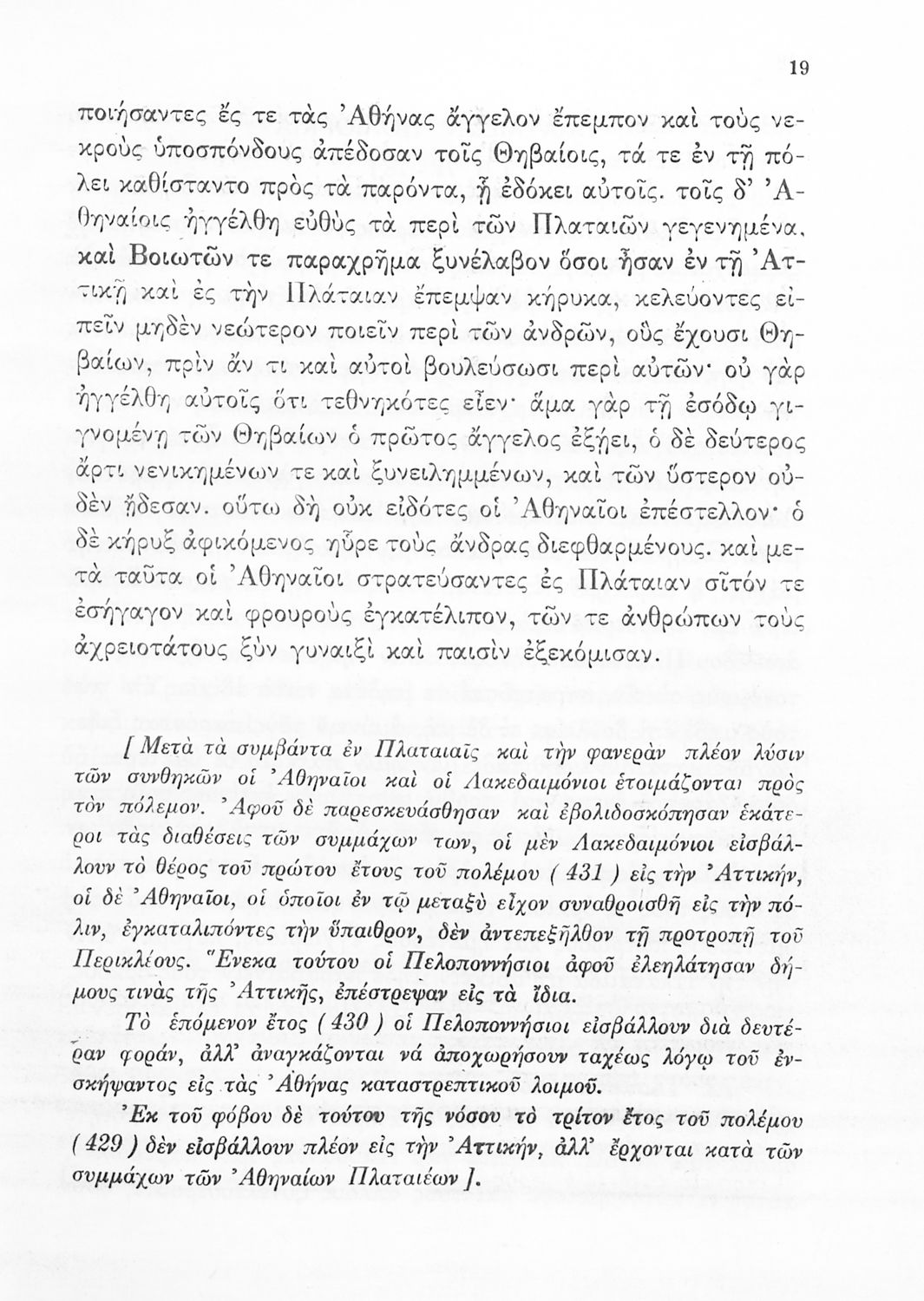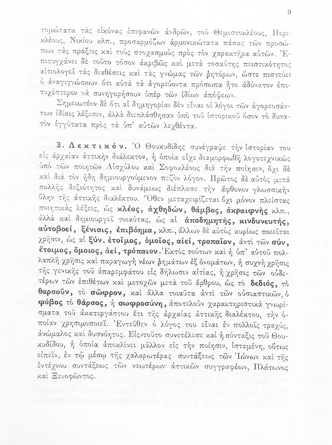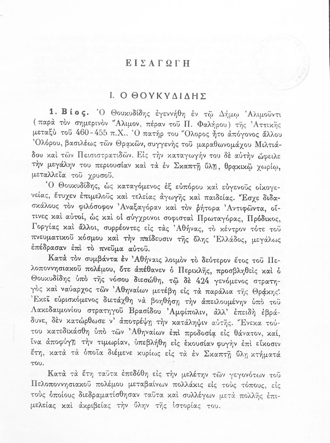 Σχολικό εγχειρίδιο Αρχαίων Ελληνικών Δ΄, Ε΄ και ΣΤ΄ Γυμνασίου που περιέχει εισαγωγή στη ζωή και το έργο του Θουκυδίδη, αποσπάσματα από τα Πλαταιϊκά, τα Λεσβιακά και τον Επιτάφιο του Περικλή και ερμηνευτικές σημειώσεις. Φέρει το σύμβολο της δικτατορίας.