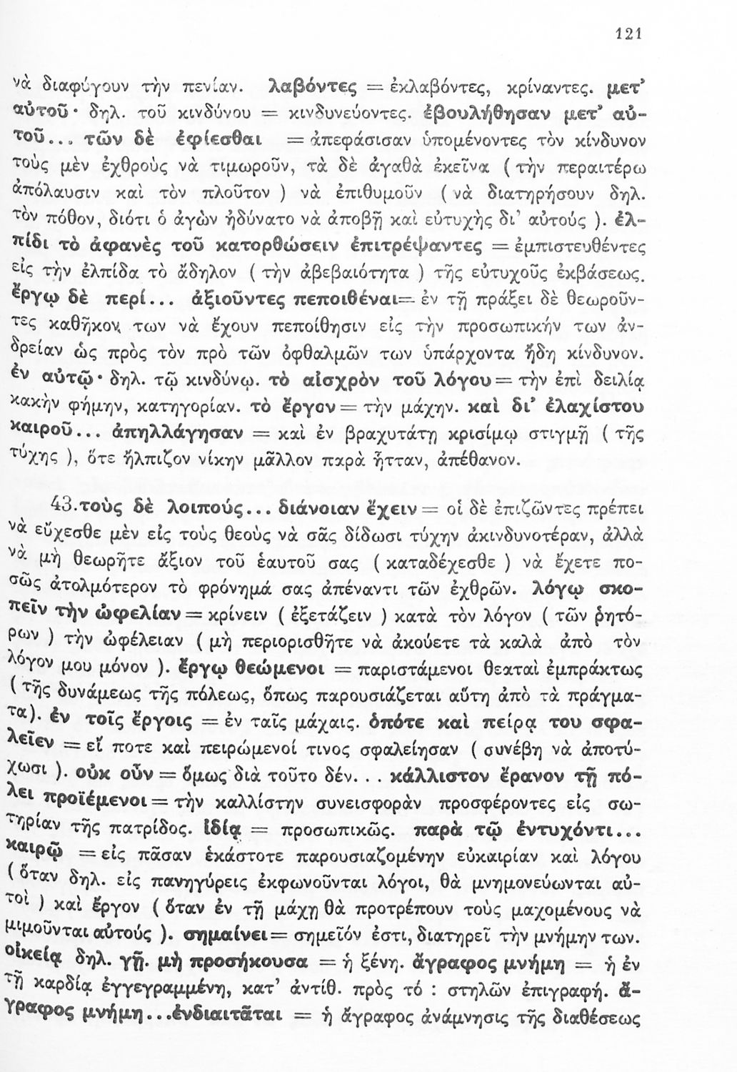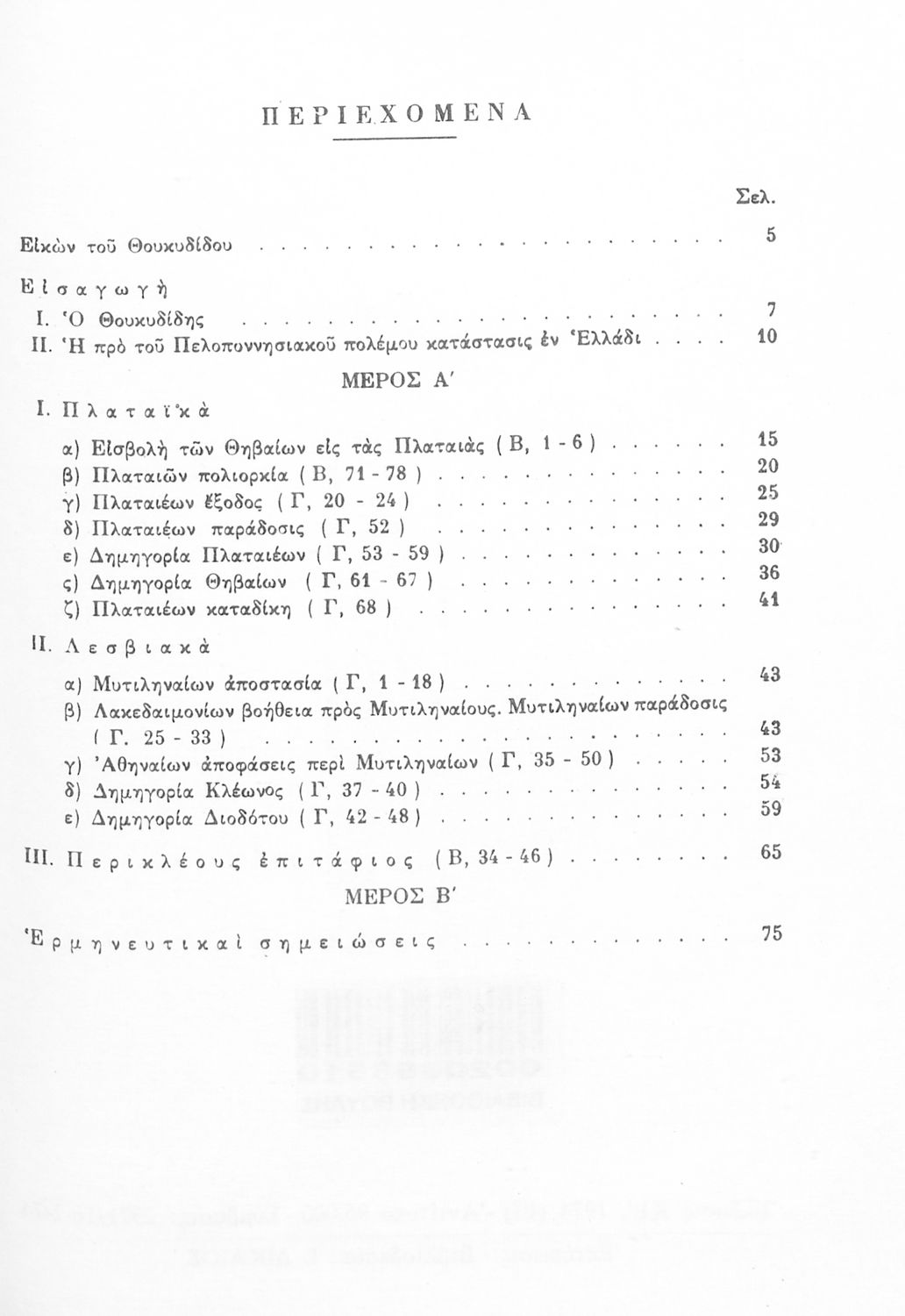 Σχολικό εγχειρίδιο Αρχαίων Ελληνικών Δ΄, Ε΄ και ΣΤ΄ Γυμνασίου που περιέχει εισαγωγή στη ζωή και το έργο του Θουκυδίδη, αποσπάσματα από τα Πλαταιϊκά, τα Λεσβιακά και τον Επιτάφιο του Περικλή και ερμηνευτικές σημειώσεις.
