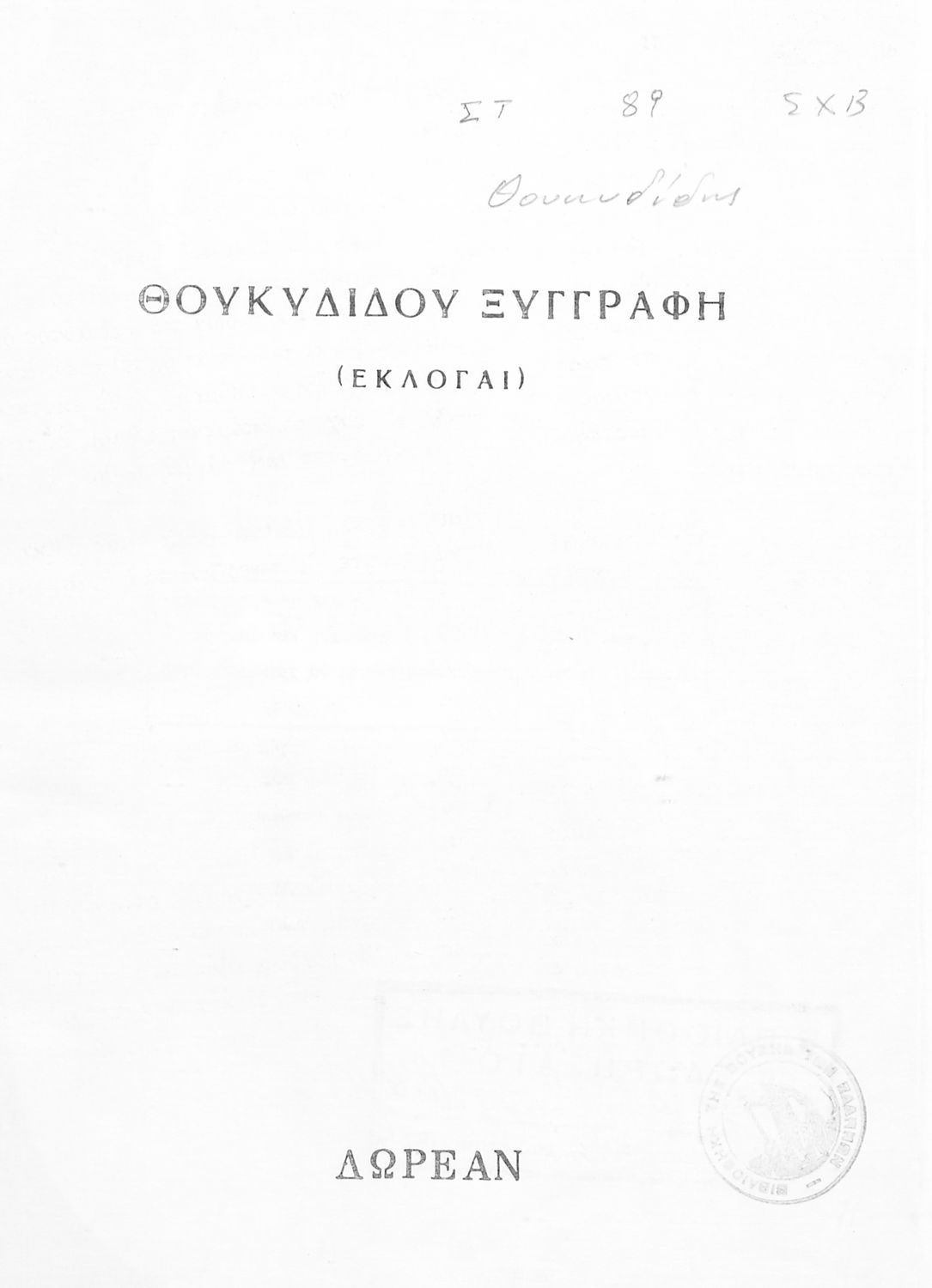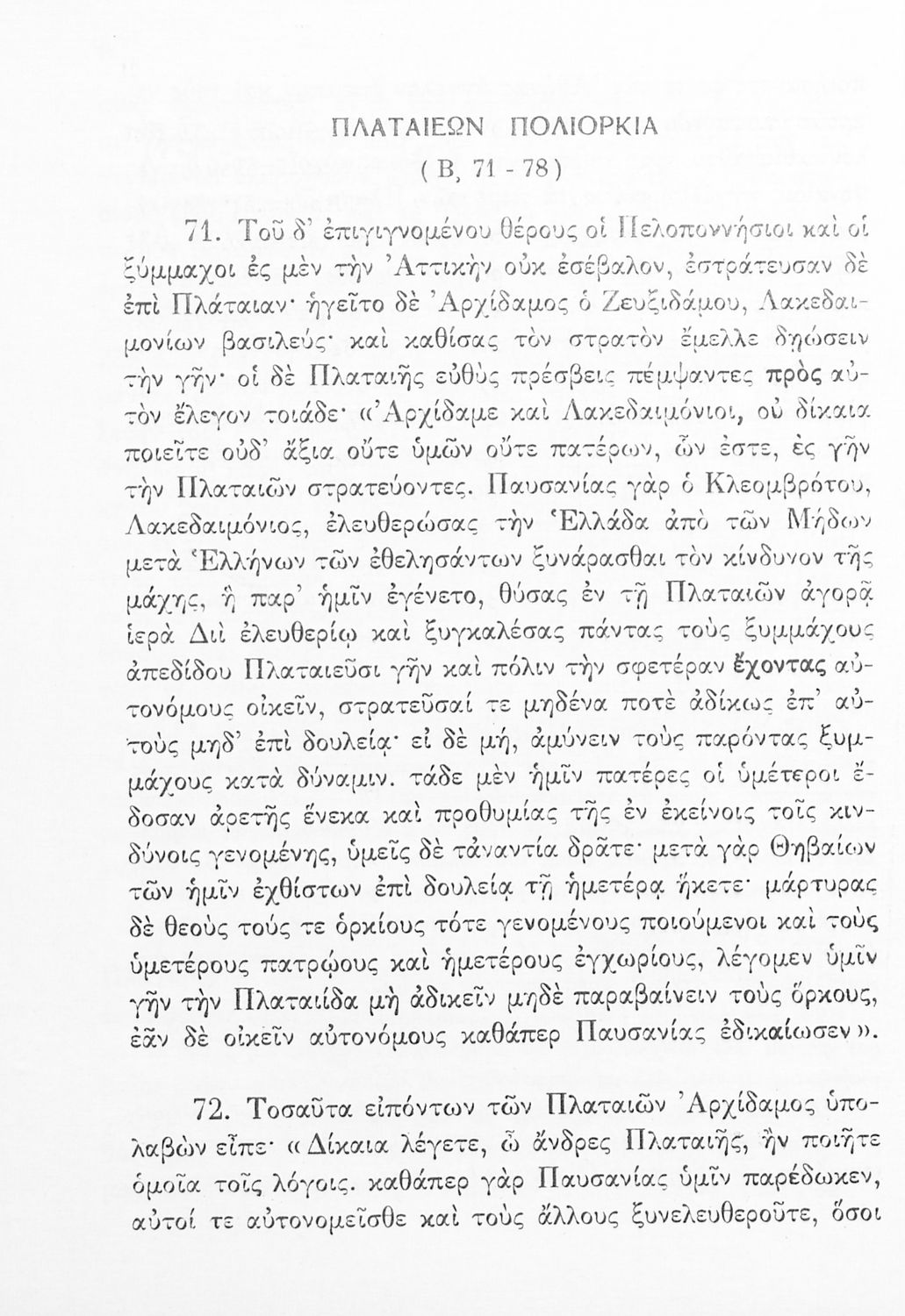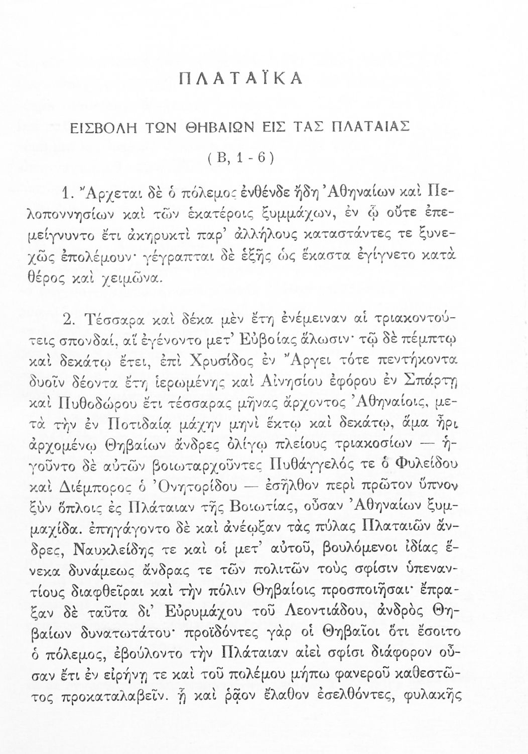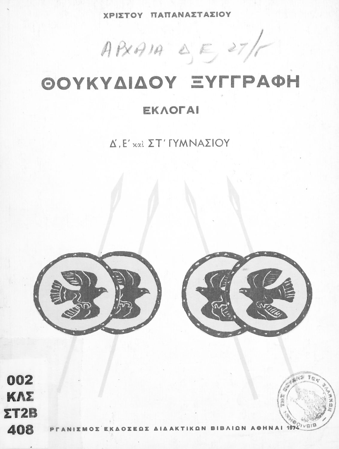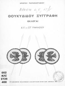 Σχολικό εγχειρίδιο Αρχαίων Ελληνικών Δ΄, Ε΄ και ΣΤ΄ Γυμνασίου που περιέχει εισαγωγή στη ζωή και το έργο του Θουκυδίδη, αποσπάσματα από τα Πλαταιϊκά, τα Λεσβιακά και τον Επιτάφιο του Περικλή και ερμηνευτικές σημειώσεις.