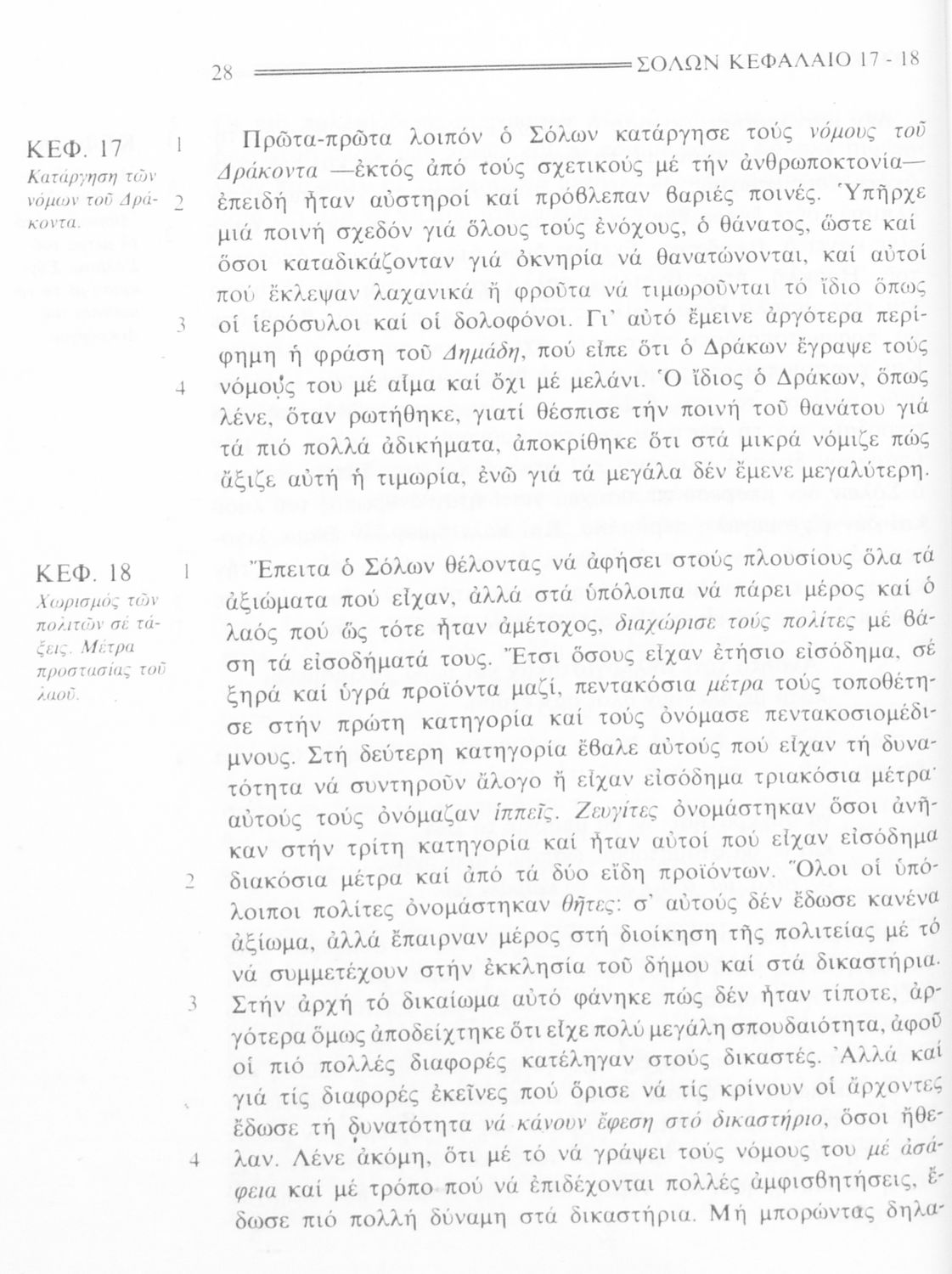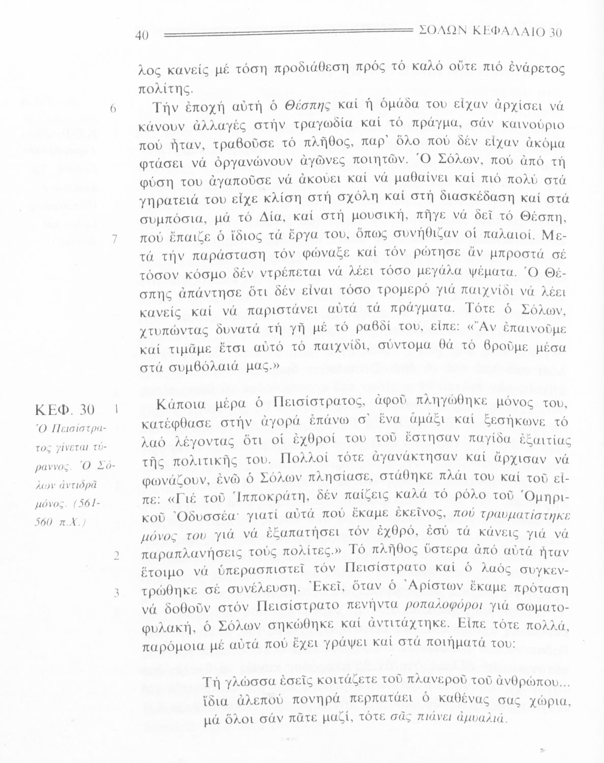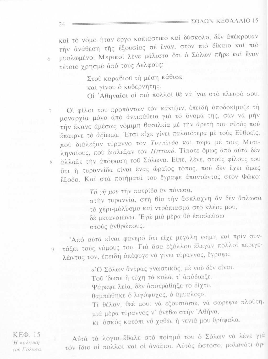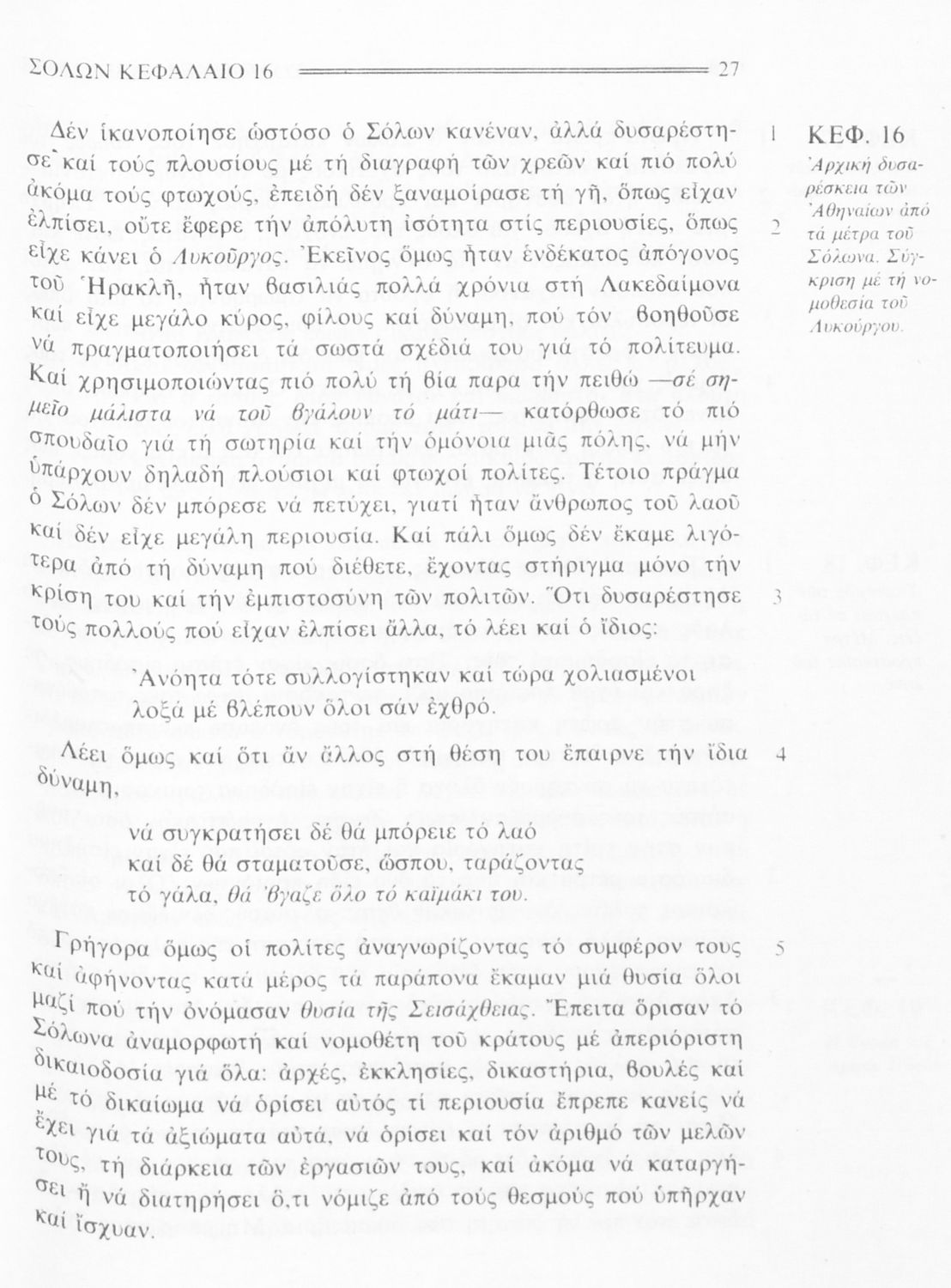 Σχολικό εγχειρίδιο Αρχαίων Ελληνικών. Αρχικά ένα εισαγωγικό σημείωμα αναφέρεται στη ζωή και το έργο του Πλουτάρχου. Ακολουθούν από το έργο του "Παράλληλοι Βίοι", σε μετάφραση, οι βιογραφίες του Σόλωνα, του ...