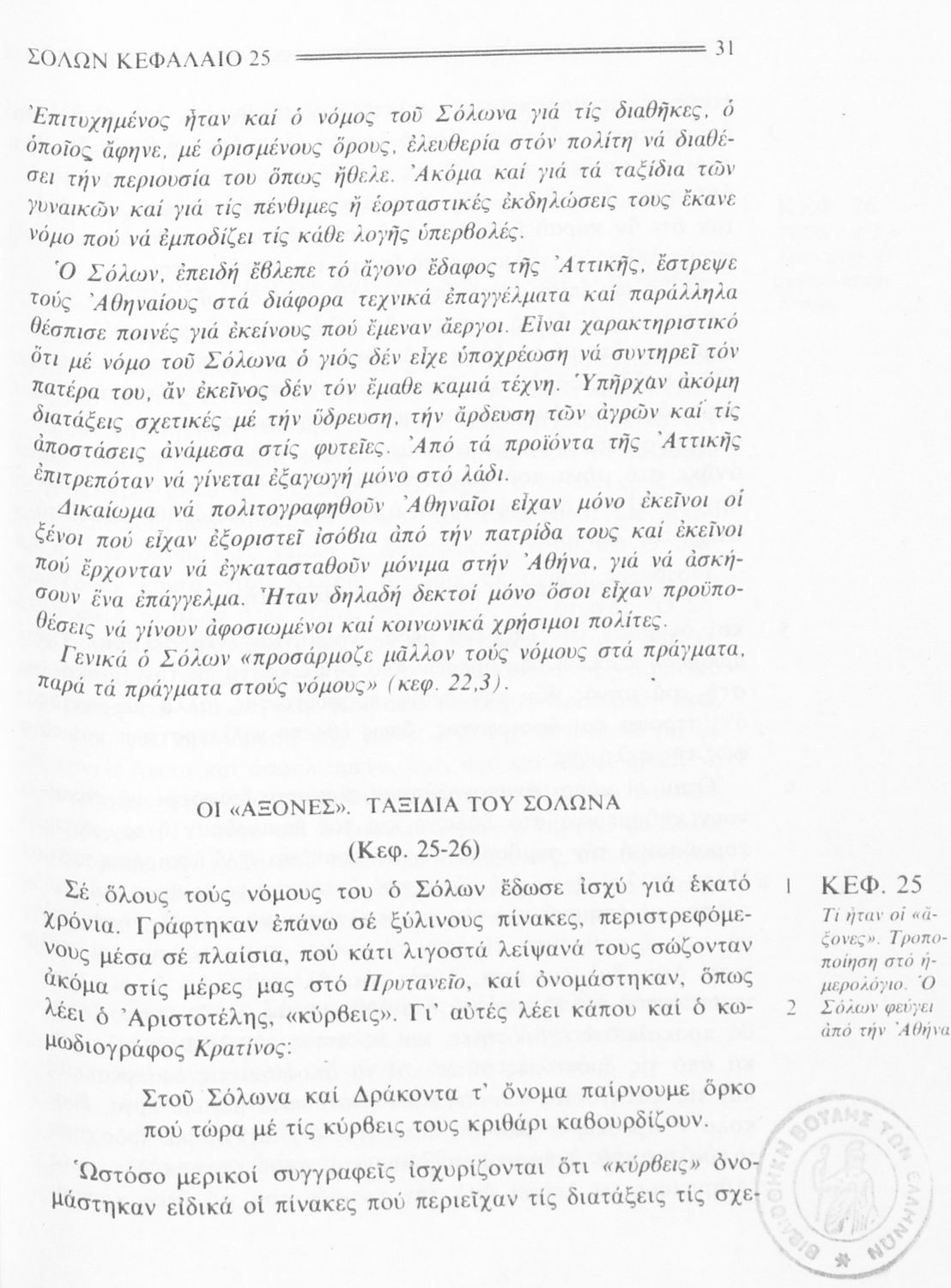Σχολικό εγχειρίδιο Αρχαίων Ελληνικών της Β' Γυμνασίου. Το βιβλίο περιλαμβάνει τέσσερις από τους “Βίους” του Πλούταρχου: του Σόλωνα, του Θεμιστοκλή, του Περικλή και του Φωκίωνα